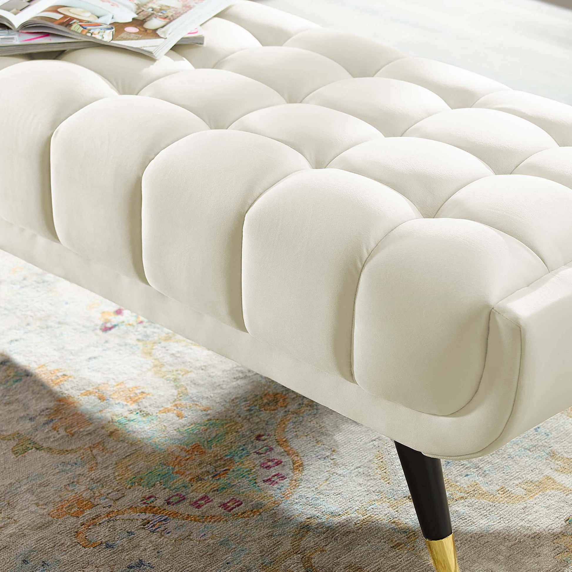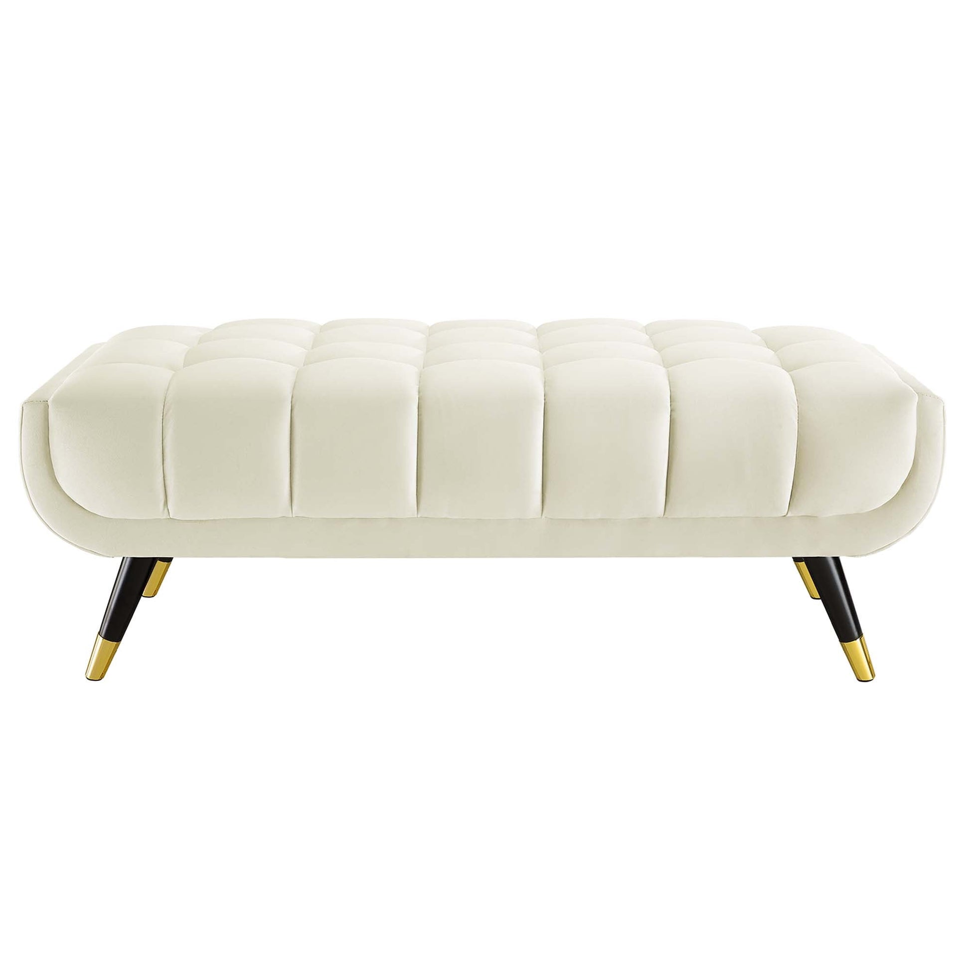 Embolden your living room décor with Adept Performance Velvet Accent Bench. Featuring a blend of chic, contemporary, and mid-century modern design, Adept's broad profile, generous tufting, stain-resistant performance velvet polyester upholstery, and subtle metal accents imbue rich detail and chic sophistication. Kick back and enjoy the plush comfort of the Adept bench while reading your favorite book or lounging with friends and family. Resting atop a splayed black birchwood frame with gold metal end caps, Adept is a striking addition to the home or apartment.