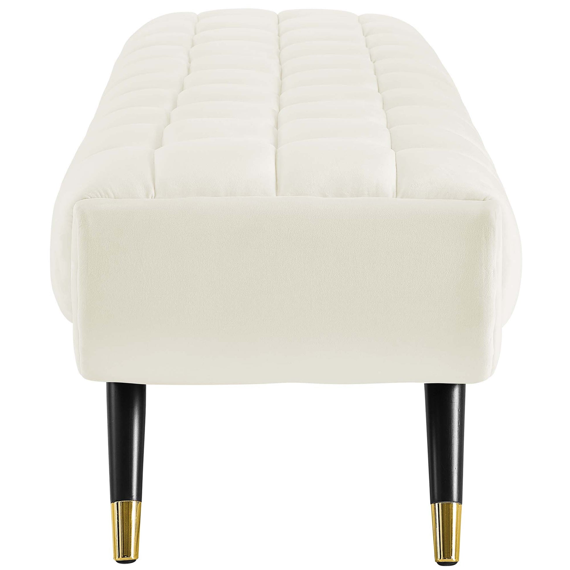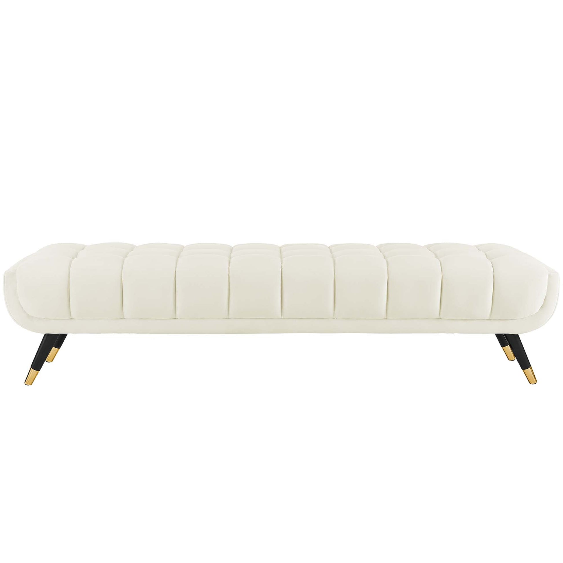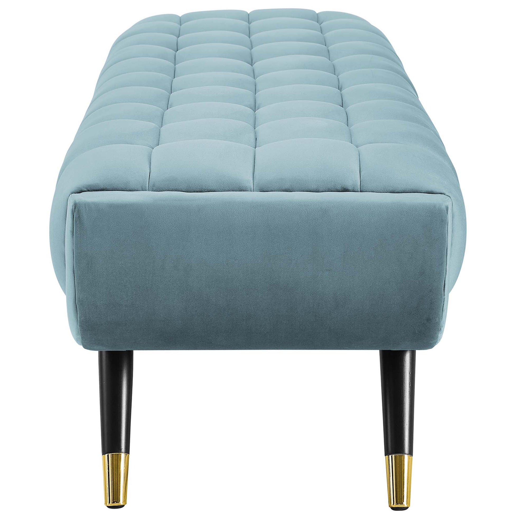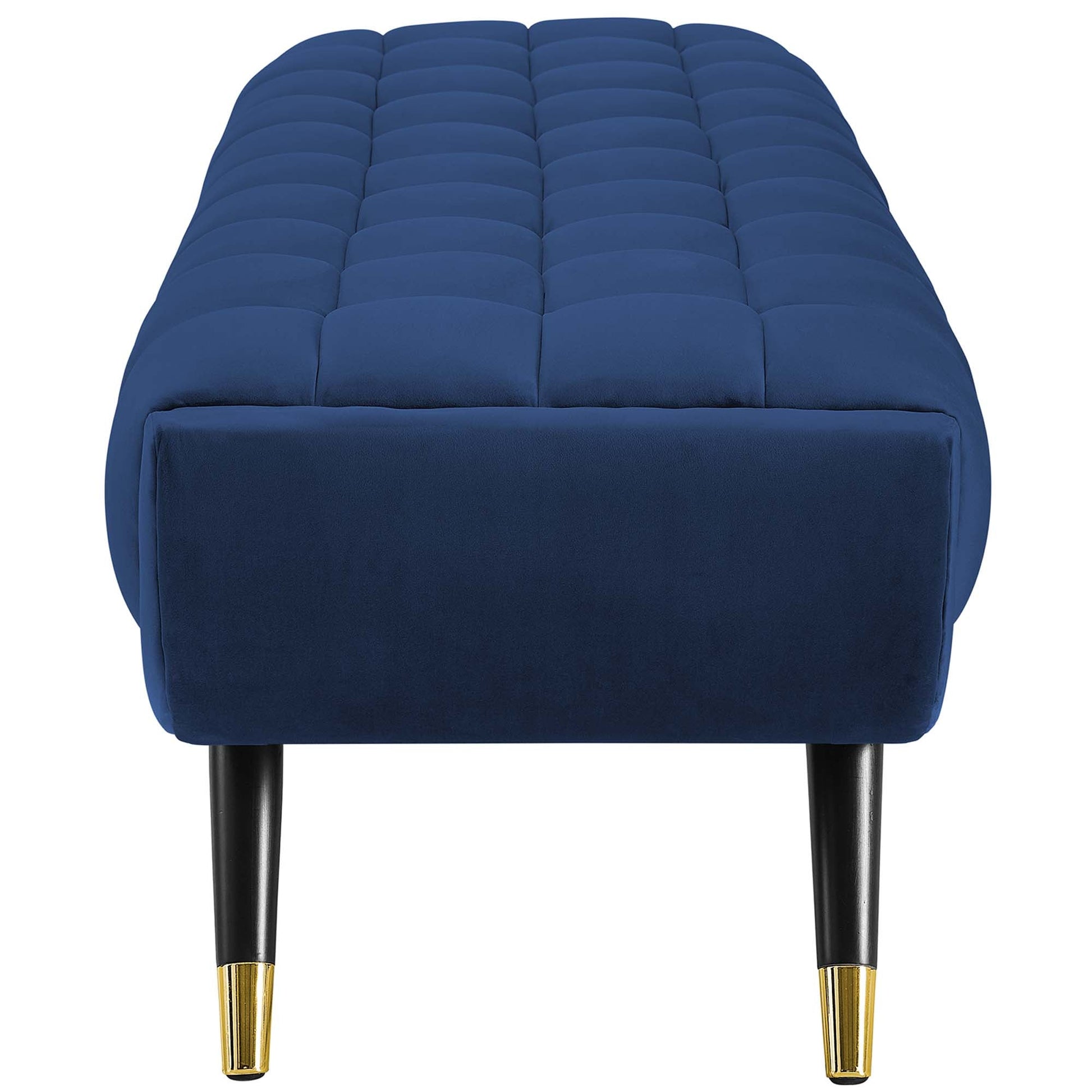 Embolden your living room décor with Adept Performance Velvet Accent Bench. Featuring a blend of chic, contemporary, and mid-century modern design, Adept's broad profile, generous tufting, stain-resistant performance velvet polyester upholstery, and subtle metal accents imbue rich detail and chic sophistication. Kick back and enjoy the plush comfort of the Adept bench while reading your favorite book or lounging with friends and family. Resting atop a splayed black birchwood frame with gold metal end caps, Adept is a striking addition to the home or apartment. Bench Weight Capacity: 440 lbs.
