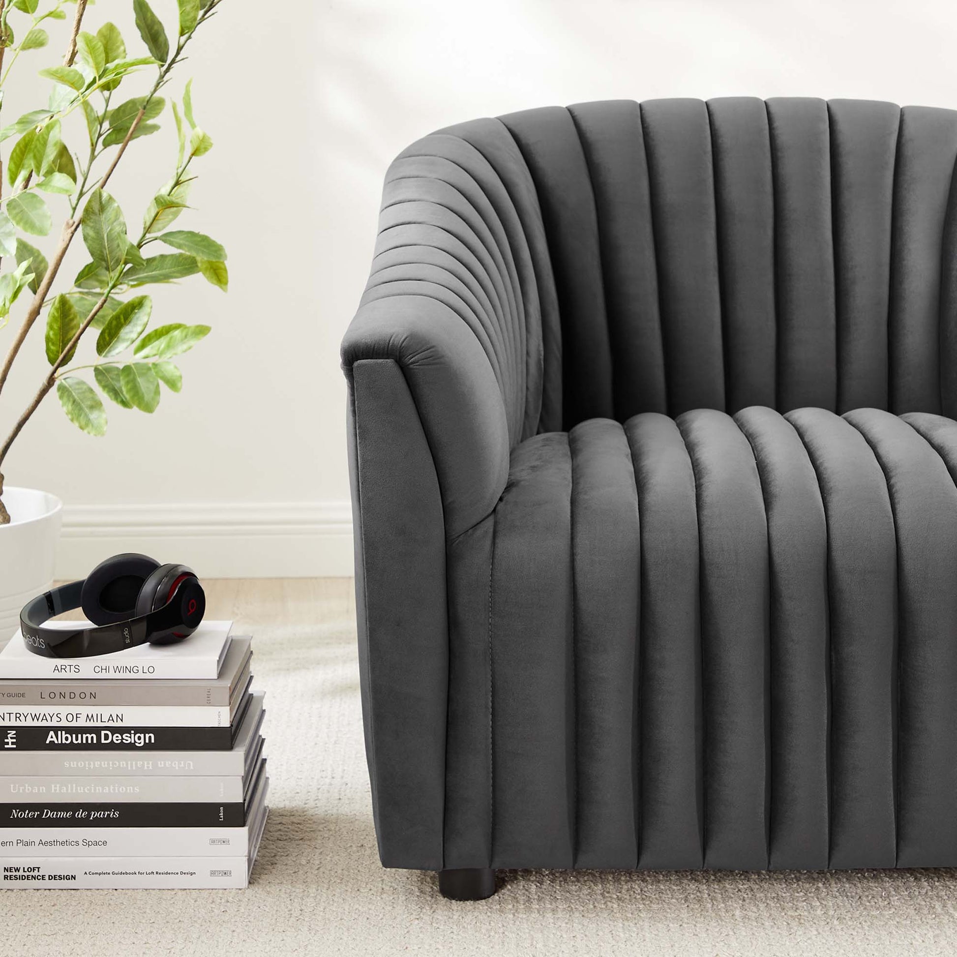 Invigorate your living room with the dynamic aesthetic of the Announce Channel Tufted Performance Velvet Armchair. Blending retro sensibilities and an organic silhouette, this contemporary living room armchair with vertical channel tufting is a vibrant presence in mid-century modern or eclectic decors. At the end of a long day, feel restored by the dense foam padding on the Announce Velvet Armchair. A practical and pleasing addition to your family room, home office, lounge space, library, or bedroom, this channel tufted reading chair is outfitted with a no-sag sinuous spring support and stain-resistant performance velvet. Legs have non-marking felt floor pads.