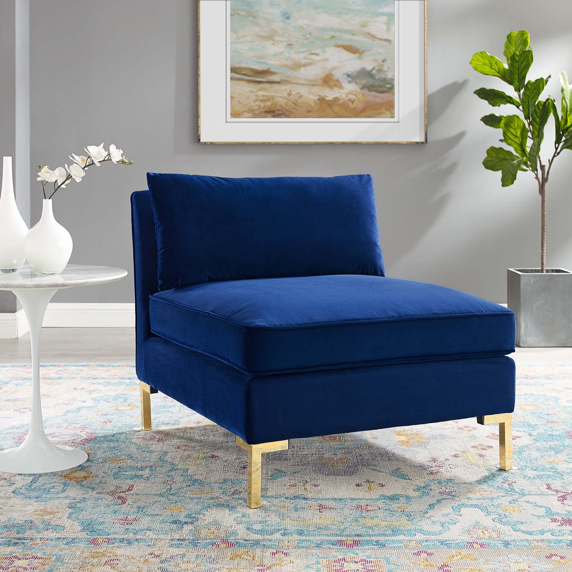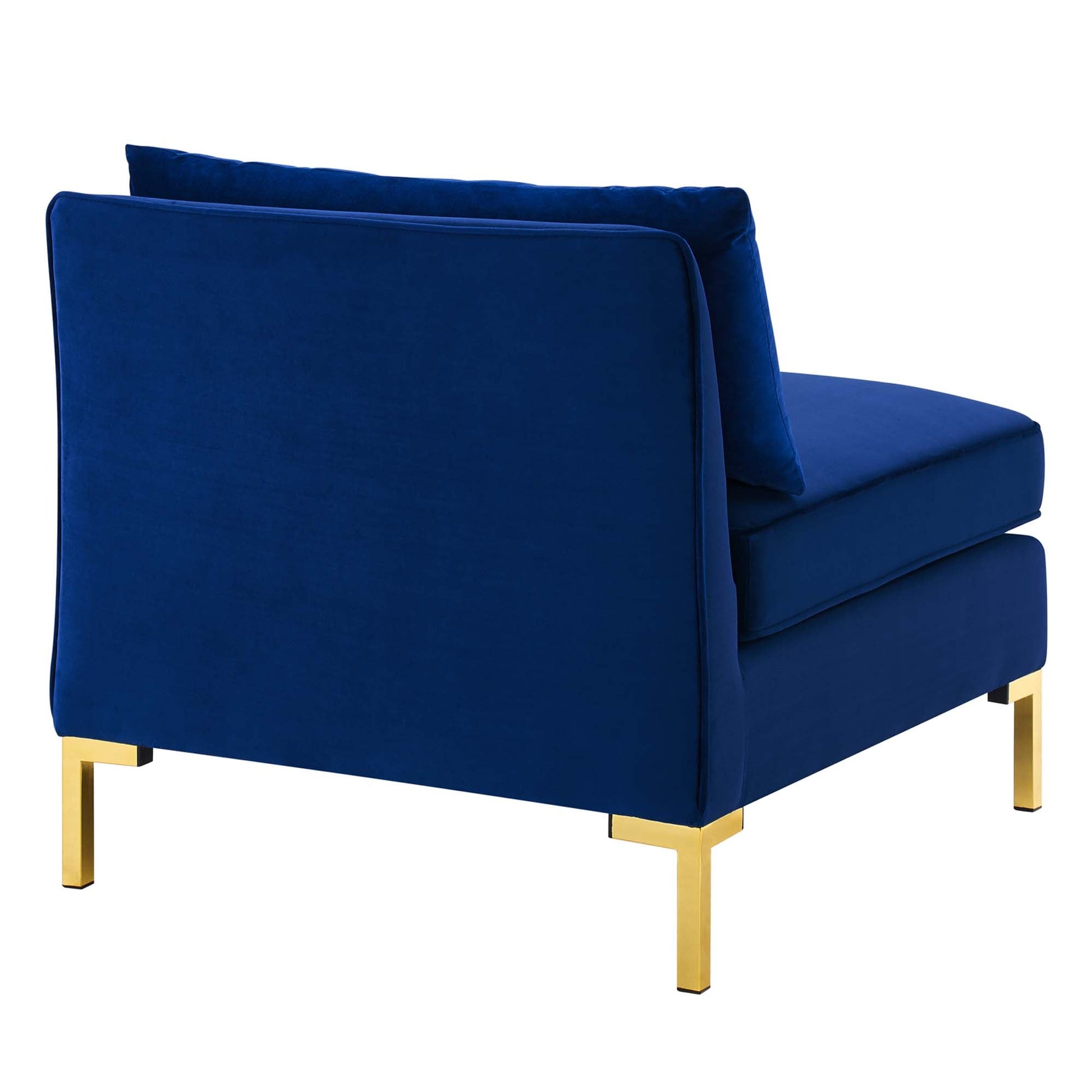 Introduce vintage modern and glam deco styles to your living space with the Ardent Performance Velvet Armless Chair. With luxe velvety texture and classic French piping, Ardent refreshes homes, apartments, and office spaces. This armless chair is part of a sectional sofa collection that allows for a variety of configurations to suit any living room, bedroom, office space, or lounge area while hidden connection buckles offer a secure fit. Covered in stain-resistant performance velvet, this upholstered chair features dense foam padding and a sinuous spring support system for a premium seating experience. The velvet chair sits on four gold metal legs with non-marking foot caps to protect your flooring. Armless Chair Weight Capacity: 440 lbs.