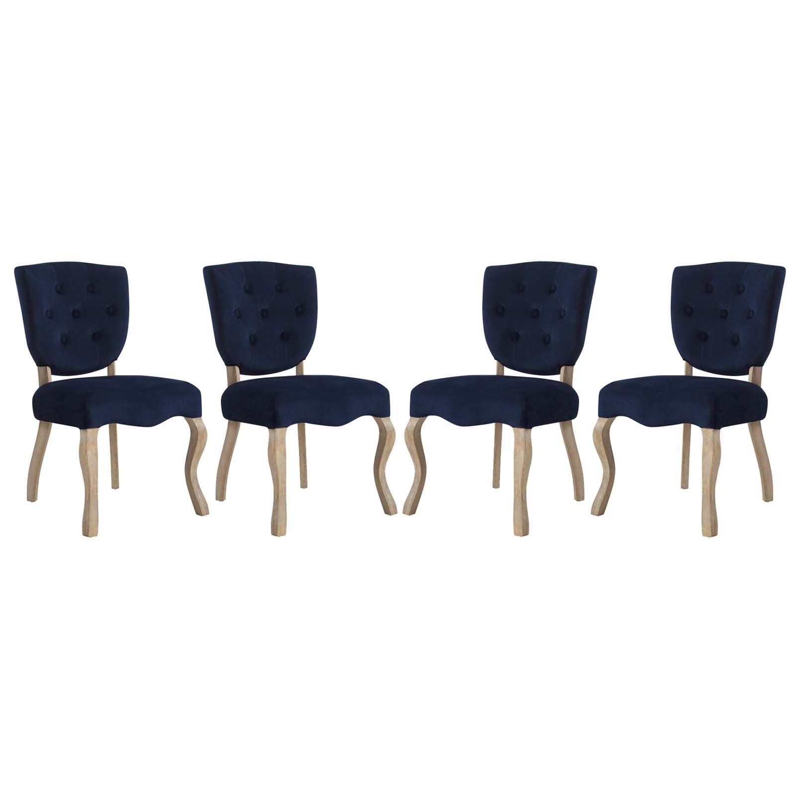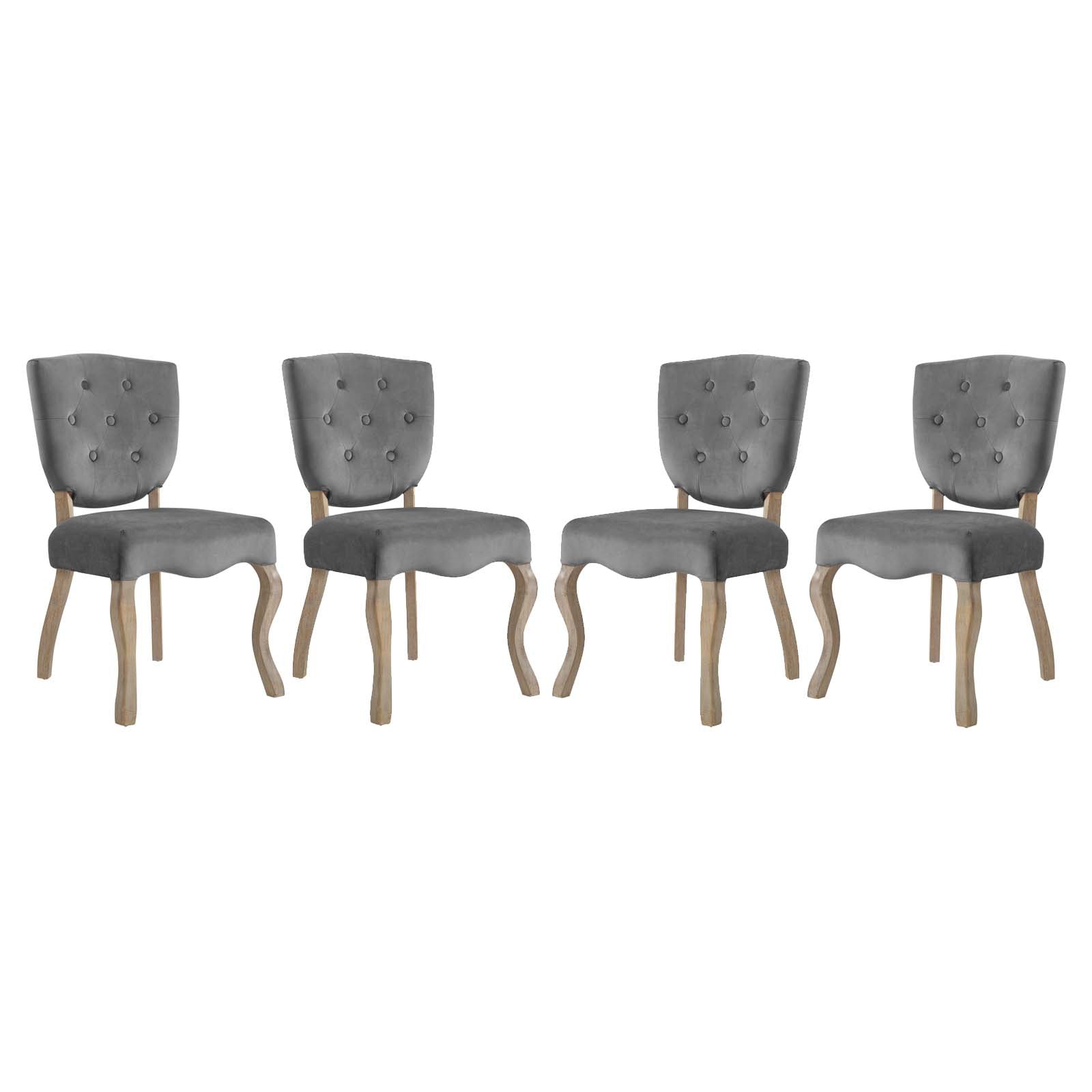 Usher forth a harmonious dining environment with the Array Vintage French Dining Side Chair. Four saber-shaped weathered wood legs develop a sculptured silhouette, while the shield back with button tufting displays hints of opulence. Complete with a generously padded seat, and velvet polyester upholstery, Array comes with non-marking foot caps to preserve floor integrity, supports up to 331 pounds, and does not require assembly.