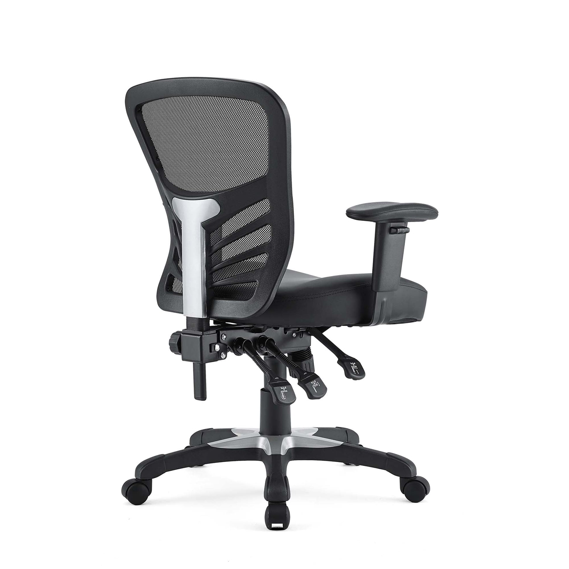 Mark a turning point in your office tasks with this upright and ergonomic mesh office chair. Let the breathable mesh back and plush vinyl seat serve as a simple extension to your everyday work ventures. The back height and seat depth are both easily adjustable to fit your height and size, while two sturdy armrests are height adjustable to assist your vertical seat posturing. Articulate also includes tilt tension and lock functions to recline and incline comfortably as needed. Fitted with five hooded dual-caster wheels, give yourself the ability to easily glide over carpeted floors while naturally performing tasks without exertion.