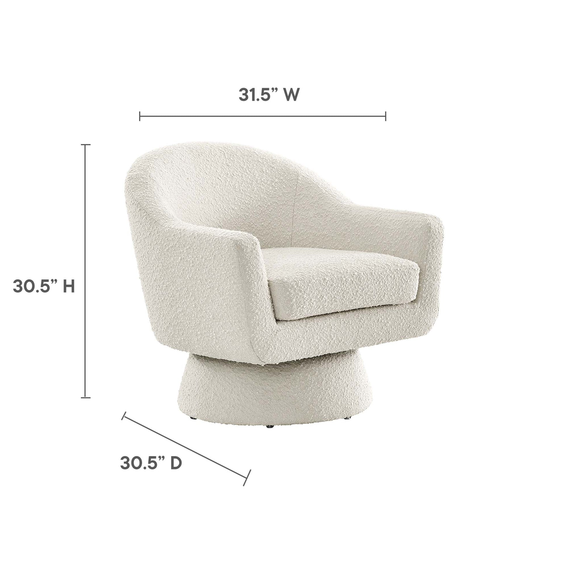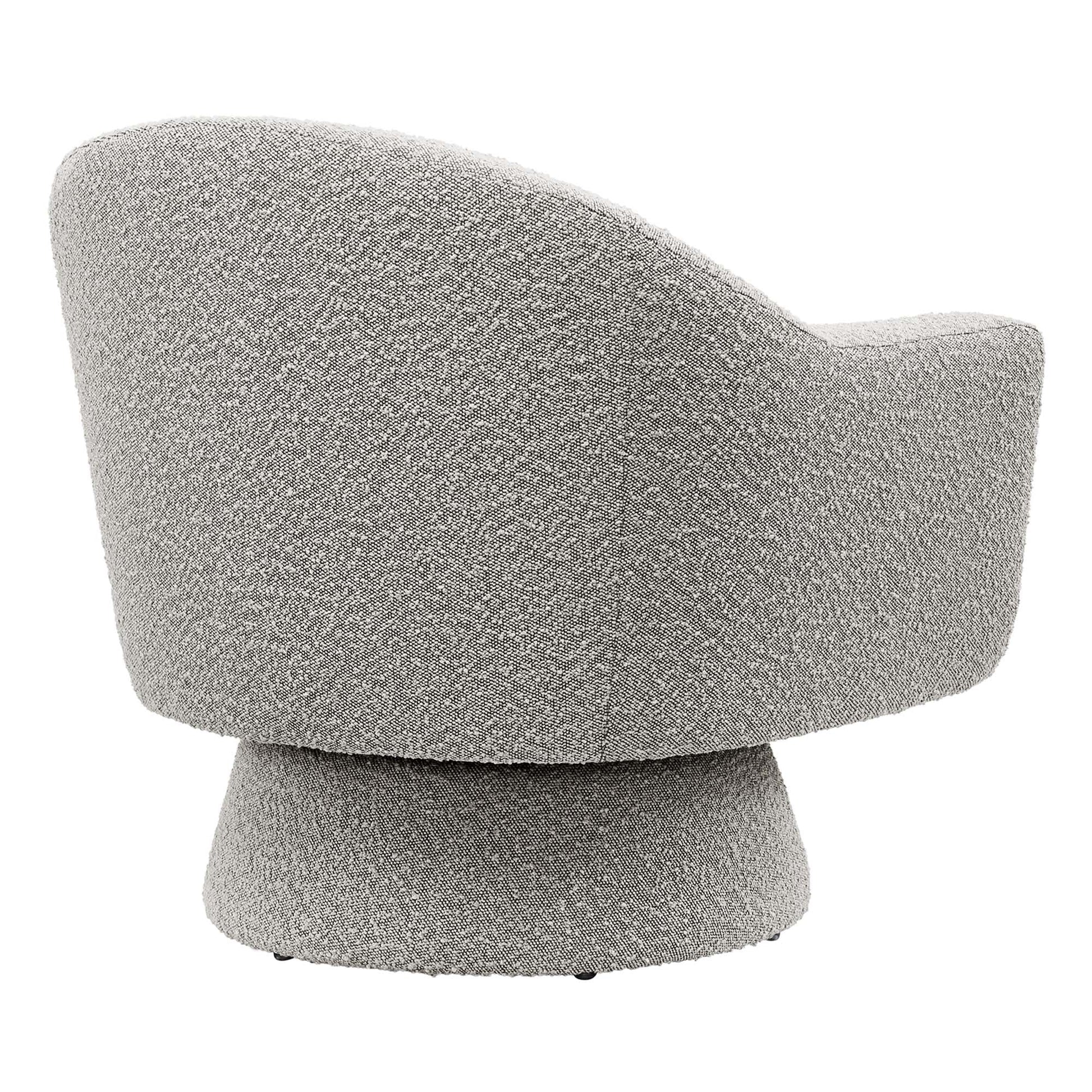 Initiate charming texture and a modern silhouette to your living room, bedroom, office, or other seating areas with the Astral Boucle Swivel Chair. Boasting sweeping armrests and a tailored profile, this accent chair is upholstered in boucle fabric that boasts a beautiful nubby texture. Dense foam pads the chair and the removable seat cushion to offer a premium seating experience. Suiting the needs of any moment, this upholstered chair rests on a tapered base complete with 360º swivel. Includes non-marking foot pins to protect flooring. Minimal assembly required. Weight Capacity: 330 lbs.