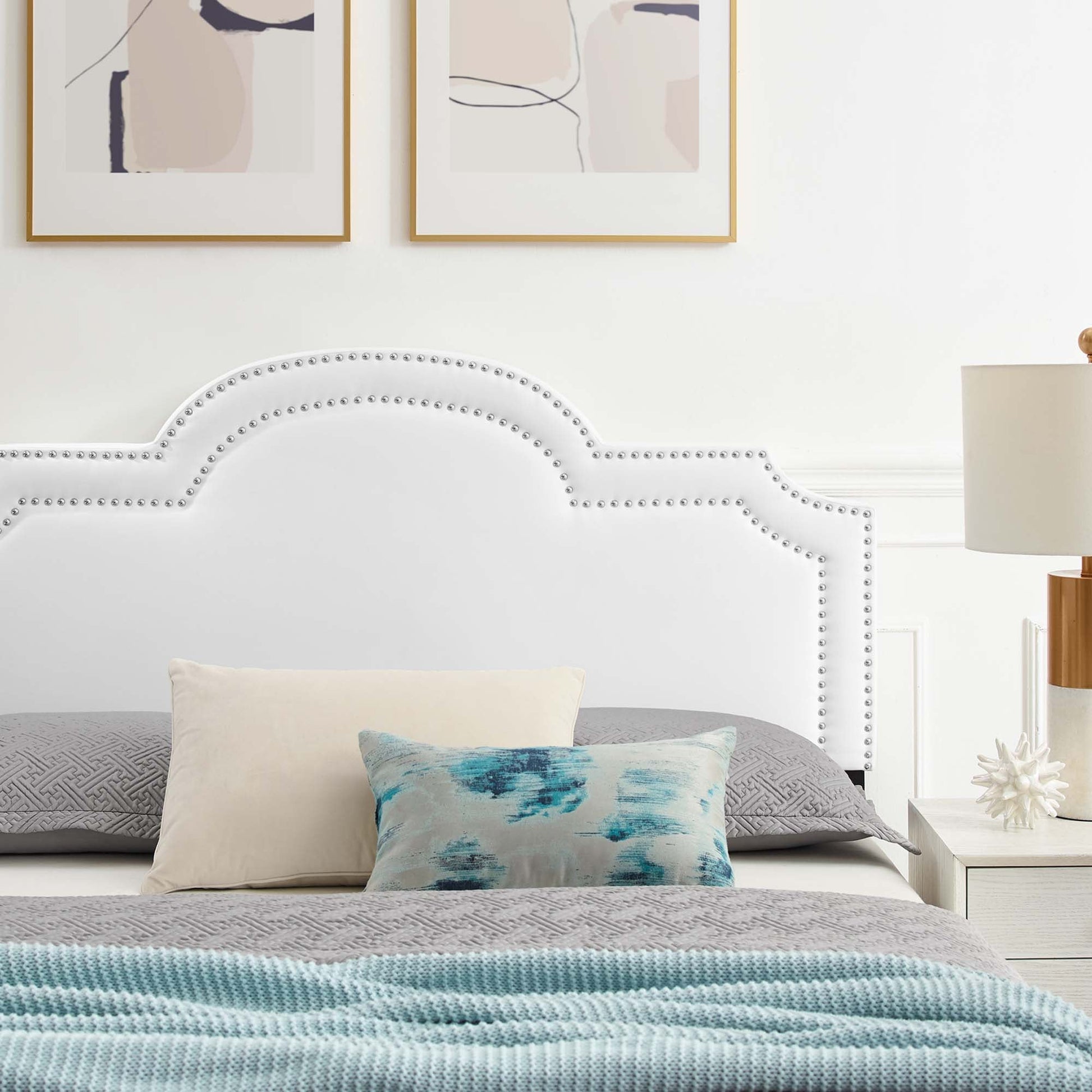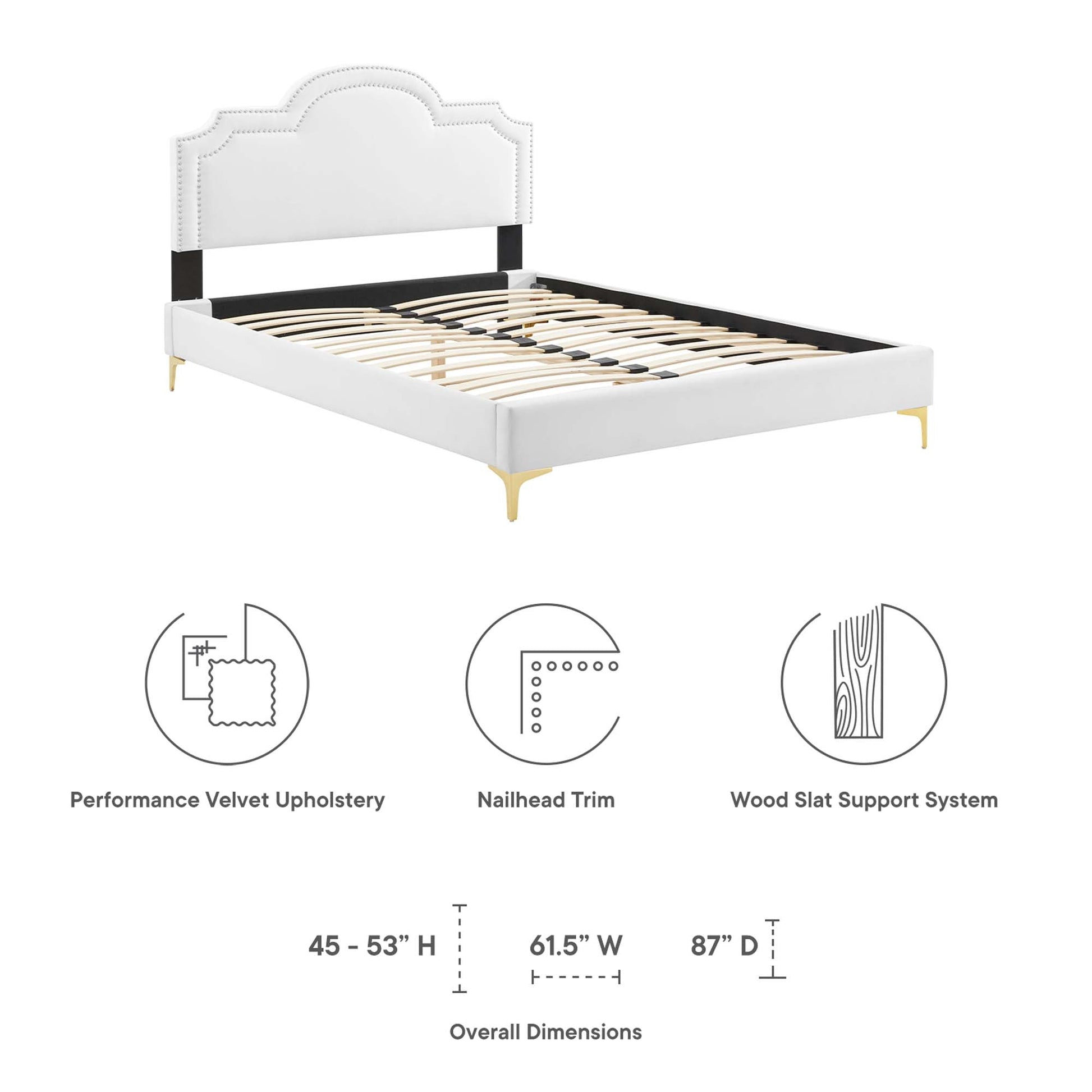 Usher quiet elegance into your master bedroom or guest room with the Aviana Performance Velvet King Bed. The gently undulating headboard with dense foam padding is accentuated by a precise nailhead trim, complementing mid-century modern, contemporary, or eclectic decors. Aviana brims with glam deco appeal, finely tailored in stain-resistant performance velvet. The well-constructed MDF frame provides a sturdy foundation for memory foam, innerspring, latex, and hybrid mattresses. This modern king bed features a well-crafted poplar wood slat support system, eliminating the need for a box spring, and a reinforced center beam with two support legs for enhanced stability. Aviana stands on gold metal legs with non-marking foot caps. Assembly required. Weight Capacity: 800 lbs.