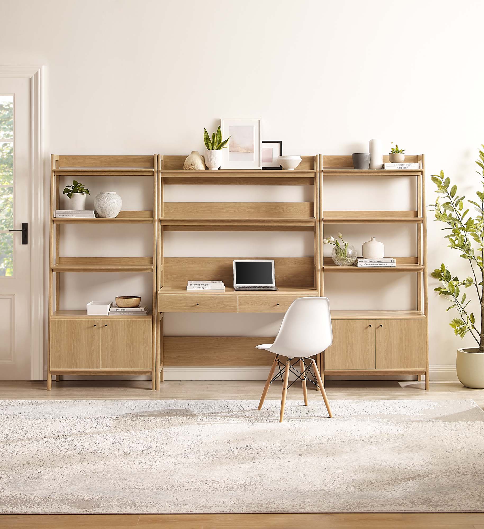 Let productivity take centerstage in your home office with the Bixby Collection. Stack your favorite reads and display home accessories on the stylish bookshelf while you focus on the task at hand seated at the spacious desk. Featuring a slim, tiered silhouette, the Bixby Office Collection blends organic wood grain with the sleek lines of the shelves to create beautiful contrast. With plenty of room for storage and display, each bookshelf is complete with three spacious shelves and a concealed storage area on the bottom. The desk boasts three shelves and two pull-out drawers. This set is crafted with particleboard and MDF for a sturdy construction that's built to last.