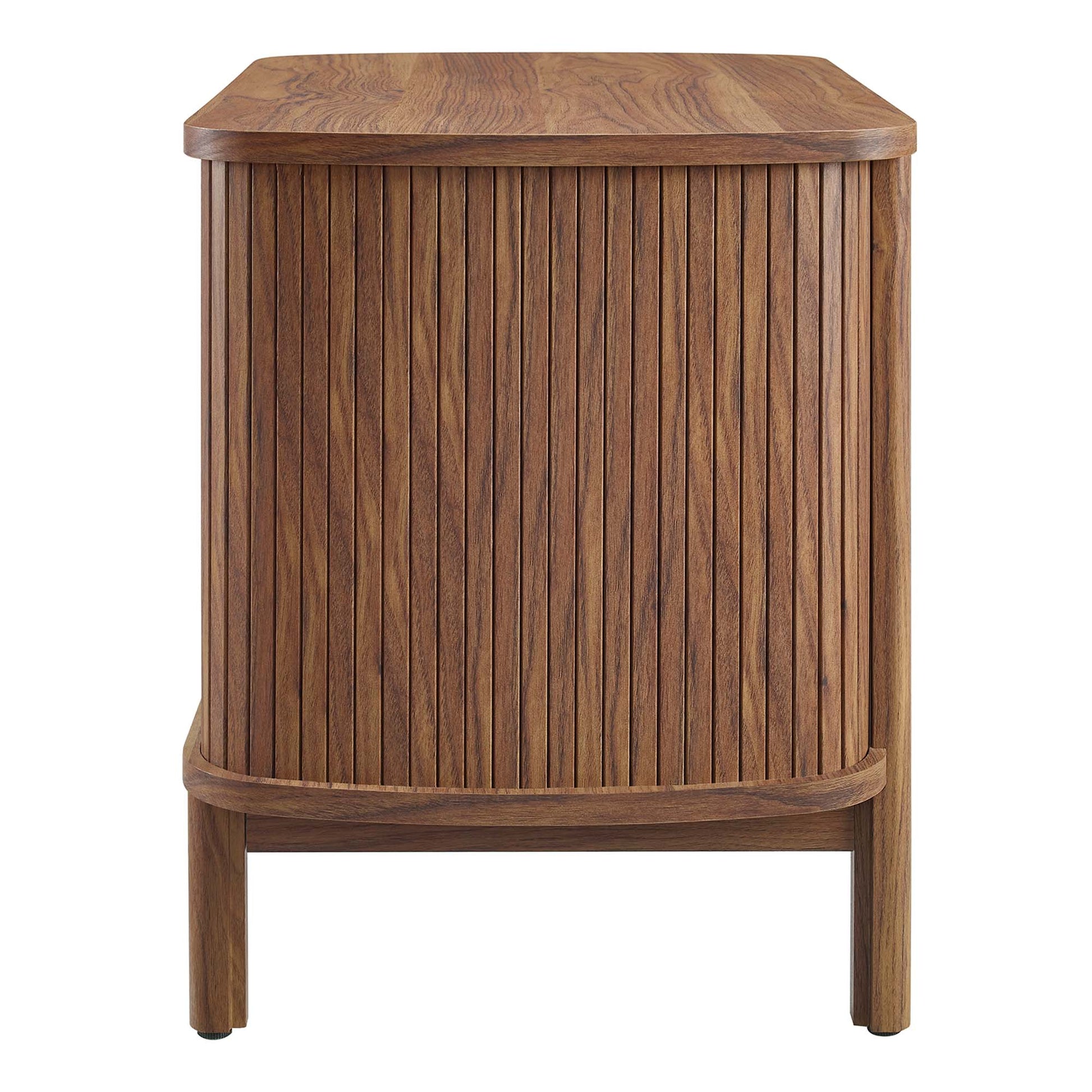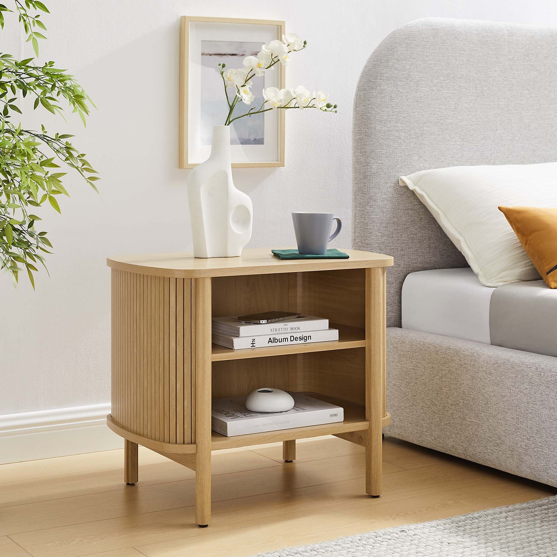 Revolutionize your bedroom or apartment decor with the Cadence Open Storage Nightstand. This modern nightstand is perfect at your bedside, offering both style and functionality. The unique design features rounded corners and fluted details, adding a stylish flair to any space. Crafted from high-quality materials such as rubberwood, particleboard, and MDF, the Cadence boho nightstand is designed for longevity and showcases a beautiful wood grain laminate, enhancing the organic aesthetics of your bedroom or living space. This open shelf nightstand has two storage compartments to comfortably support books, decorative items, or nighttime essentials. It includes non-marking foot glides for added stability. The Cadence fluted nightstand is a multi-functional piece that elegantly combines practicality with elegance and is versatile enough to serve as an open shelf side table, living room end table, or small accent table. Assembly required. Tabletop Weight Capacity: 79 lbs. Each Shelf Weight Capacity: 57 lbs.