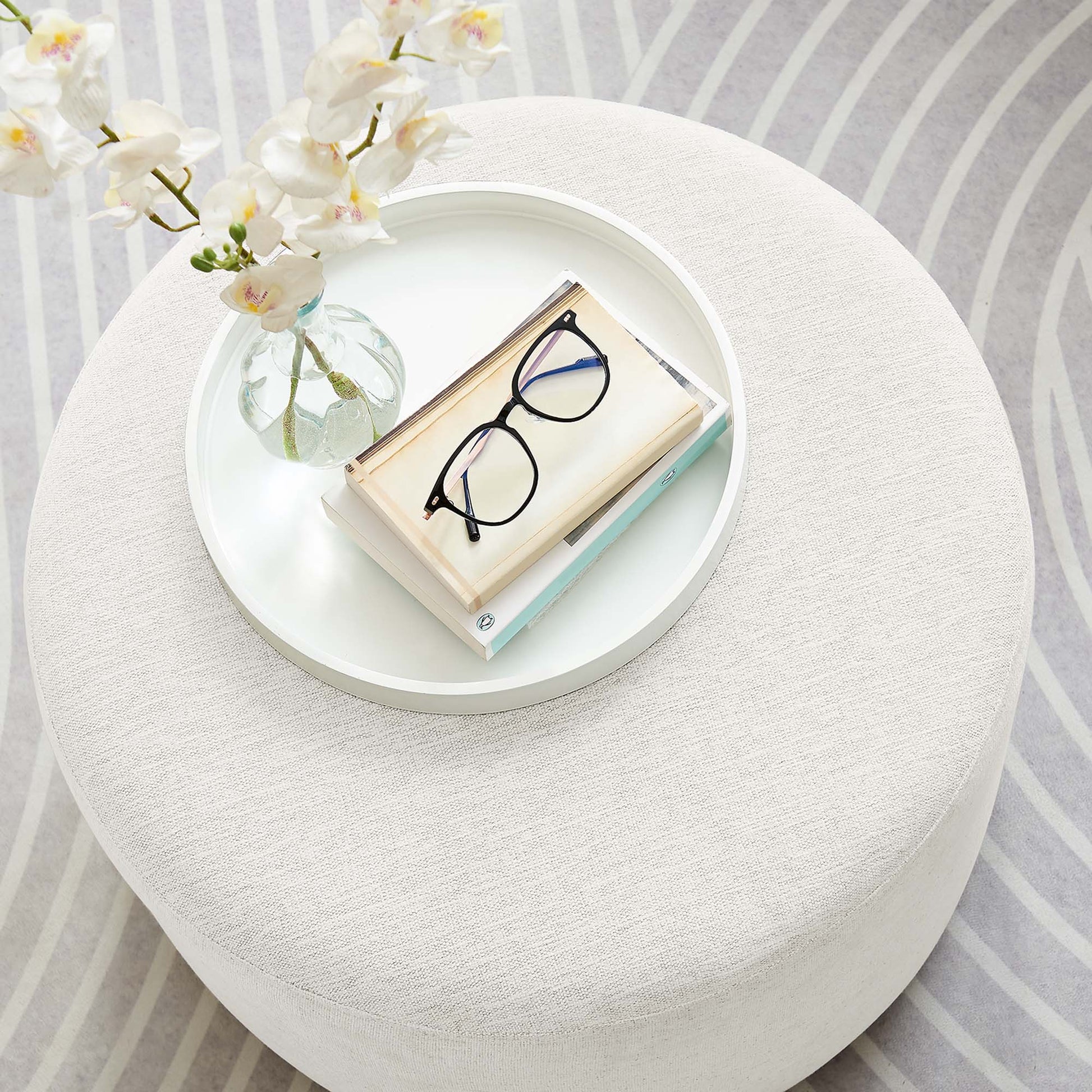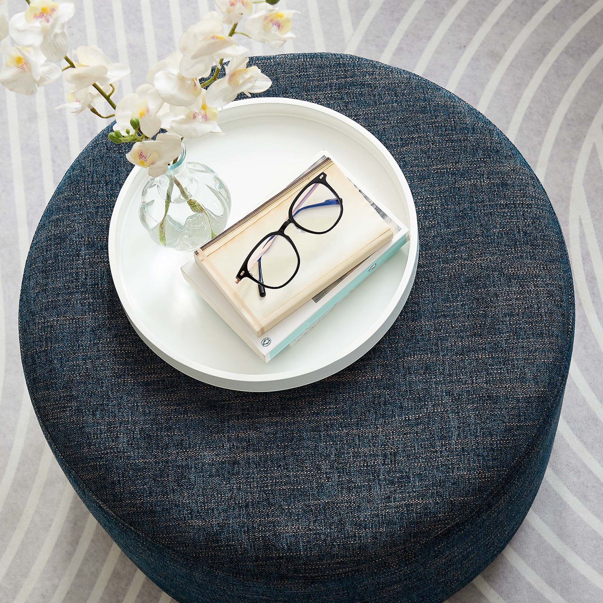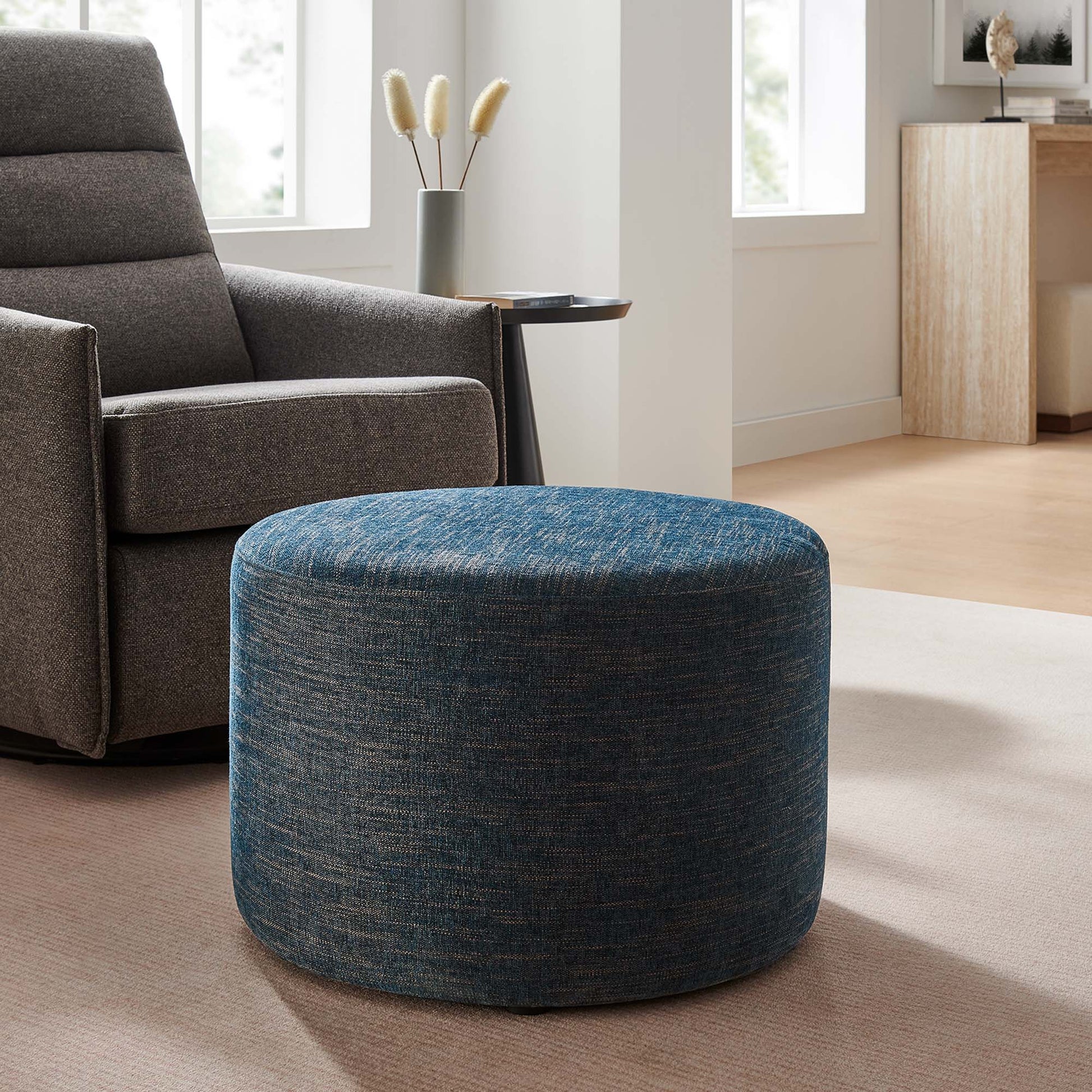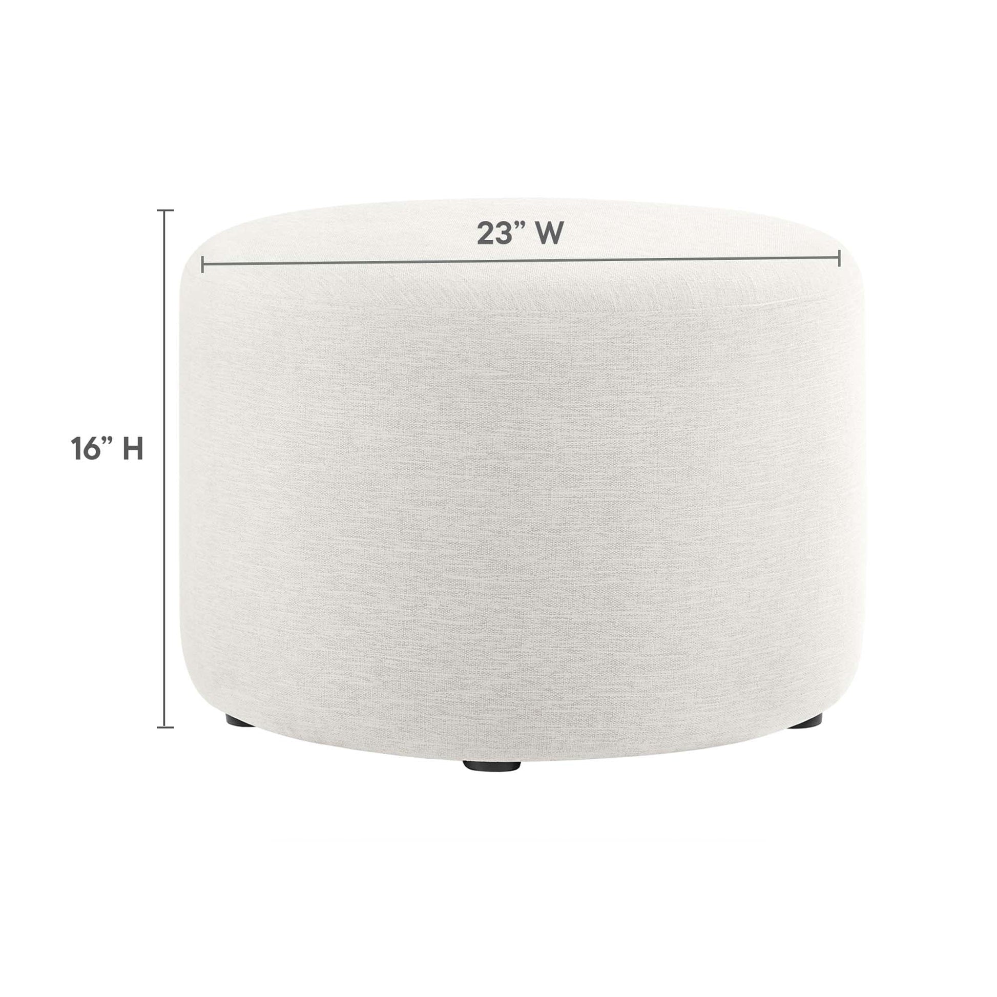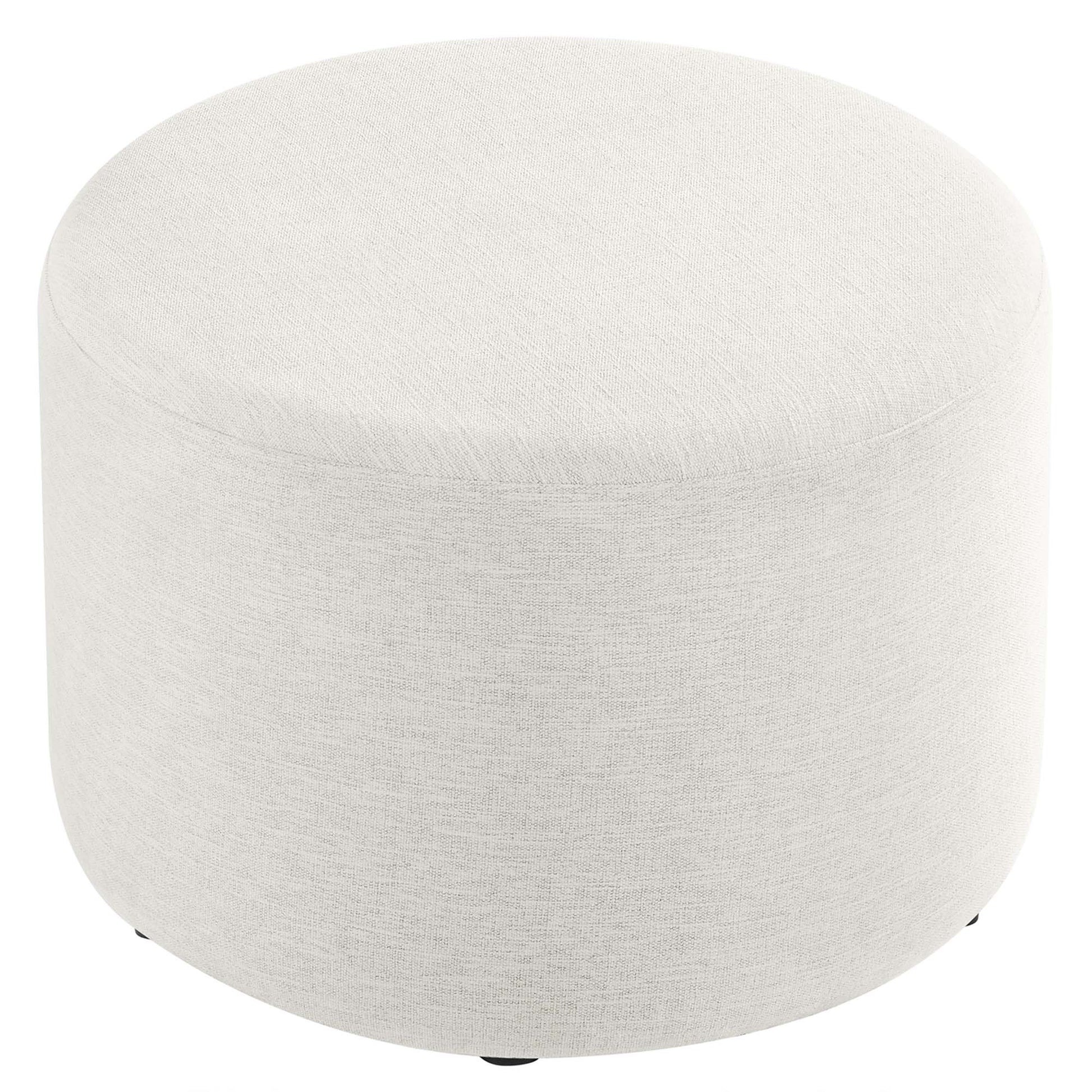 Experience refined comfort with the Callum 23" Round Upholstered Ottoman, a sleek accent ottoman designed for the contemporary home, apartment, or office. Crafted with beautifully textured woven heathered fabric upholstery, this versatile round ottoman exudes subtle elegance with its tailored silhouette, perfect for any modern furniture decor. Inside, dense foam padding offers a comfortable ottoman seat while entertaining or footrest as you sit back and relax. The Callum ottoman stool’s thoughtful design includes low-profile plastic legs with non-marking glides to protect your floors from scuffs and scratches. Arriving fully assembled, this ottoman foot rest seamlessly blends upscale style with everyday functionality. Its size and shape also make it an ideal choice for a small side table, or small living room ottoman coffee table. Weight Capacity: 506 lbs.