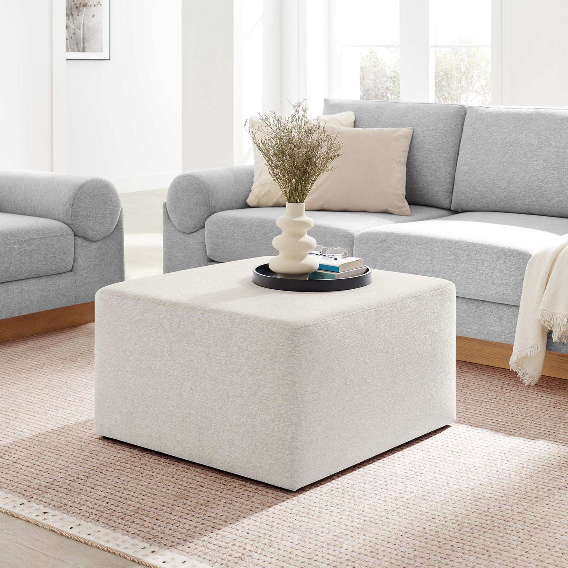Experience refined comfort with the Callum 28" Square Upholstered Ottoman, a sleek ottoman coffee table designed for the contemporary home, apartment, or office. Crafted with beautifully textured woven heathered fabric upholstery, this versatile square ottoman exudes subtle elegance with its tailored silhouette, perfect for modern furniture decor. Inside, dense foam padding serves not only as a comfortable ottoman seat for entertaining or as a relaxing footrest for unwinding, but also seamlessly transforms into a stylish ottoman coffee table, great for any living room setting. The Callum upholstered ottoman coffee table’s thoughtful design includes low-profile plastic legs with non-marking glides to protect your floors from scuffs and scratches. Arriving fully assembled, this couch ottoman seamlessly blends upscale style with everyday functionality. Weight Capacity: 506 lbs.