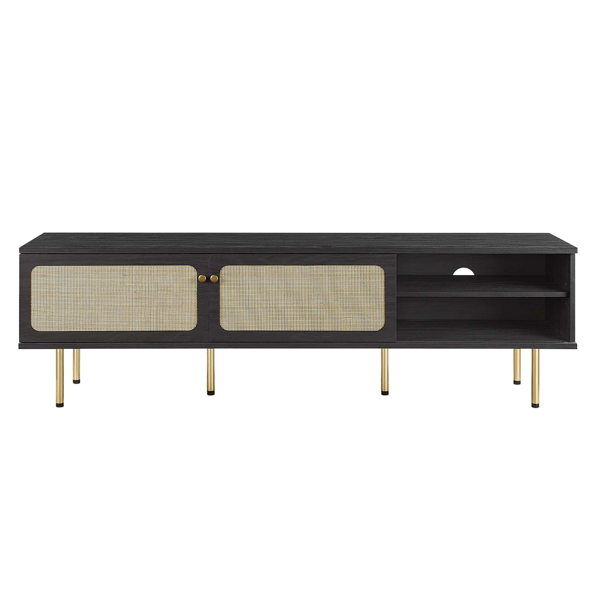 Bring trending organic aesthetics to your living space with the Cambria TV Stand. This entertainment center rests on cylindrical metal legs with non-marking foot caps and features a natural rattan weave along the front of two sliding doors that partially conceal the shelving area. A versatile addition to a living room, bedroom, home office, or lounge area, this media console is crafted with durable particleboard and features three cable management holes that also allow for flow-through ventilation. Keep visual space clean with the ample storage space for media essentials. This entertainment stand accommodates flat screen TVs up to 76". Assembly required. Weight Limit: 220 lbs.