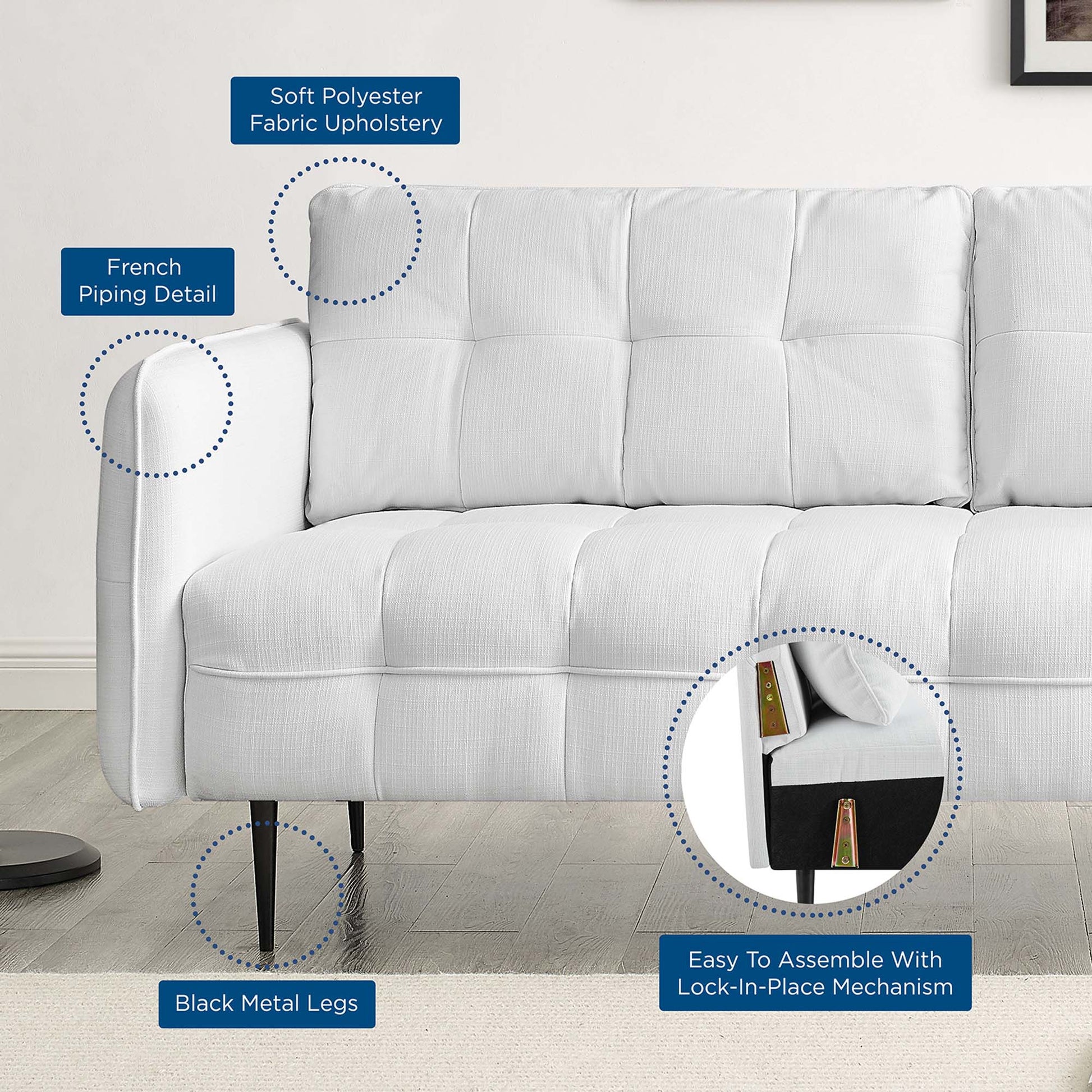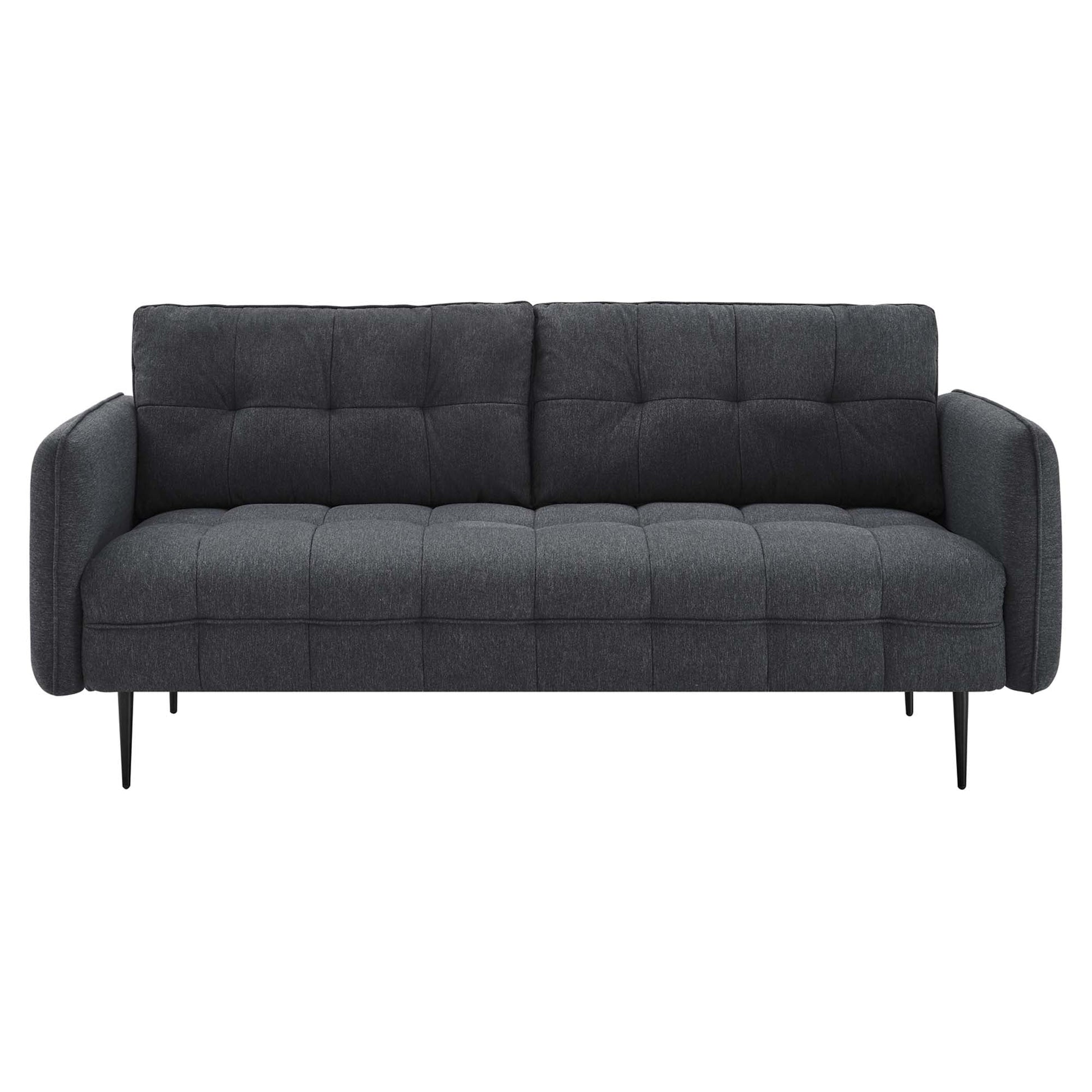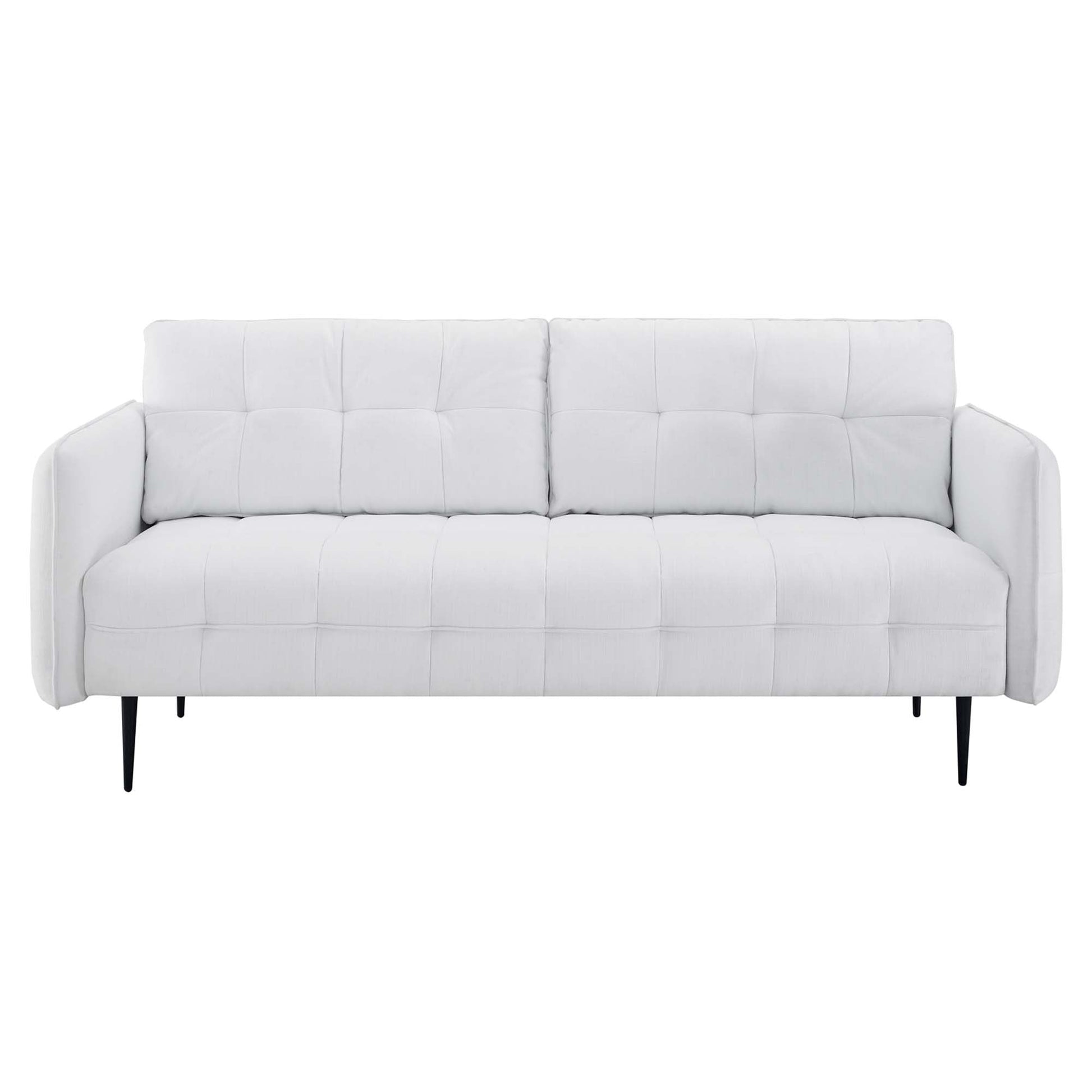 Heighten your living space with the Cameron Tufted Fabric Sofa. Displaying square tufting and French piping detail, this upholstered sofa is rich in contemporary charm and mid-century modern inspiration. Covered in soft polyester fabric, this tufted sofa features dense foam padding and a sinuous spring support system to create a premium seating experience for you and your guests. Sturdily constructed from solid wood, this fabric sofa sits atop black metal legs with non-marking foot pins. Modernizing the traditional furniture shopping experience, this sofa-in-a-box ships directly to your doorstep in a conveniently portable box with easy-to-follow instructions. This retro modern sofa is an ideal addition to your living room, lounge room, or home office. Assembly required. Sofa Weight Capacity: 900 lbs.