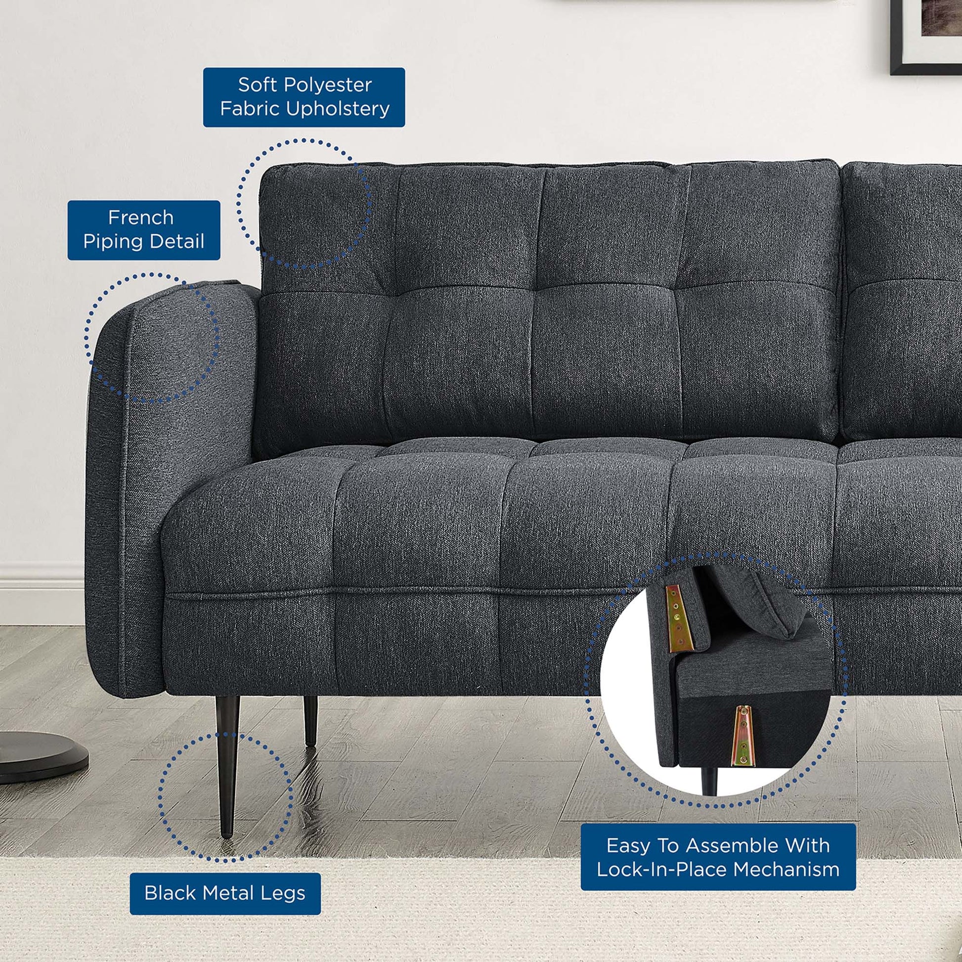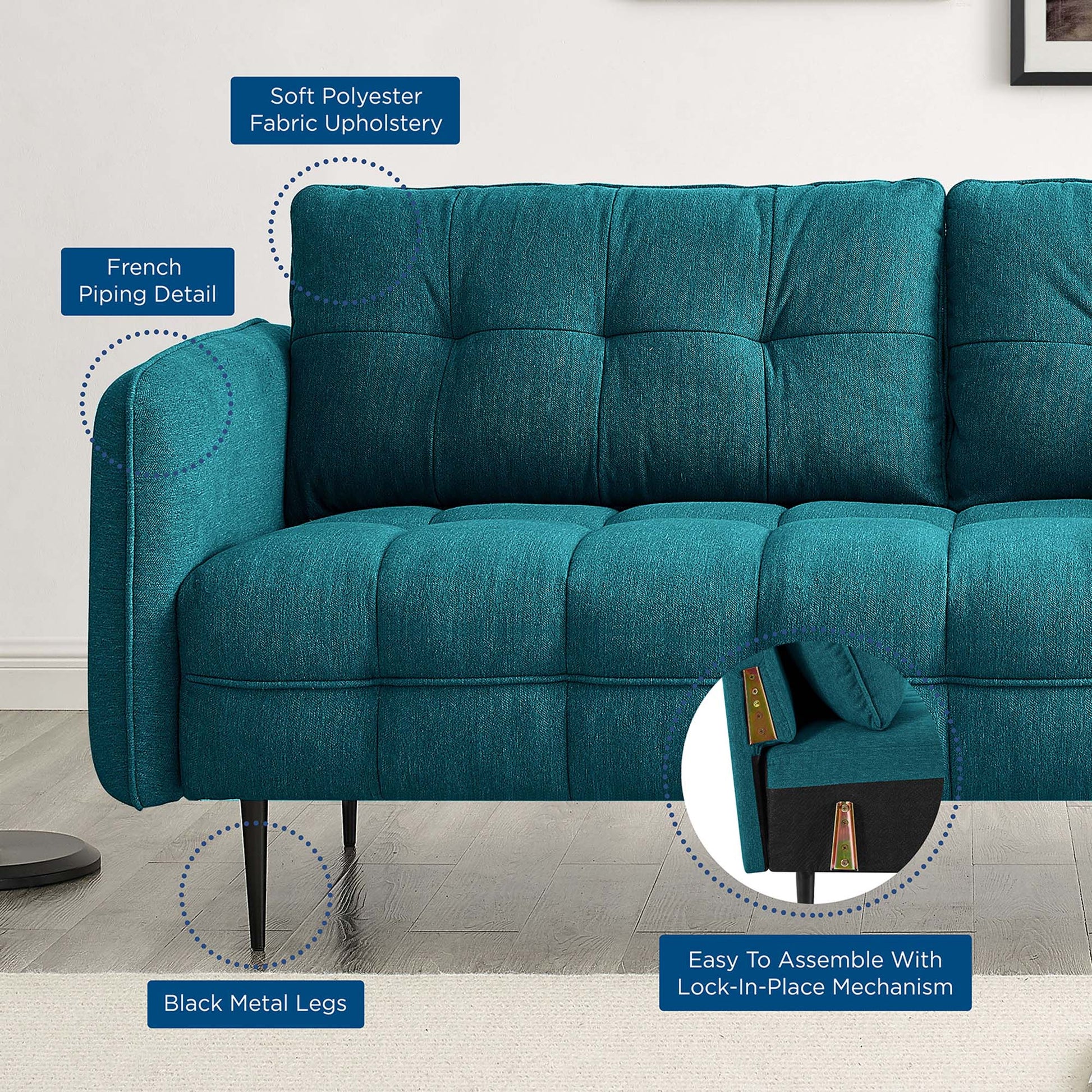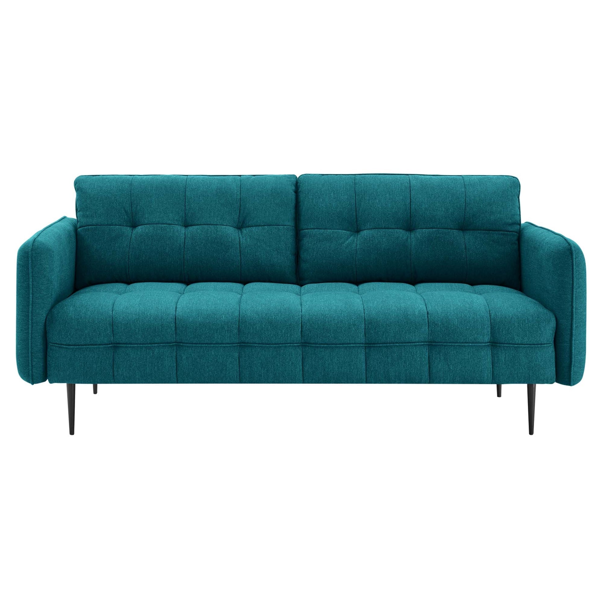 Heighten your living space with the Cameron Tufted Fabric Sofa. Displaying square tufting and French piping detail, this upholstered sofa is rich in contemporary charm and mid-century modern inspiration. Covered in soft polyester fabric, this tufted sofa features dense foam padding and a sinuous spring support system to create a premium seating experience for you and your guests. Sturdily constructed from solid wood, this fabric sofa sits atop black metal legs with non-marking foot pins. Modernizing the traditional furniture shopping experience, this sofa-in-a-box ships directly to your doorstep in a conveniently portable box with easy-to-follow instructions. This retro modern sofa is an ideal addition to your living room, lounge room, or home office. Assembly required. Sofa Weight Capacity: 900 lbs.