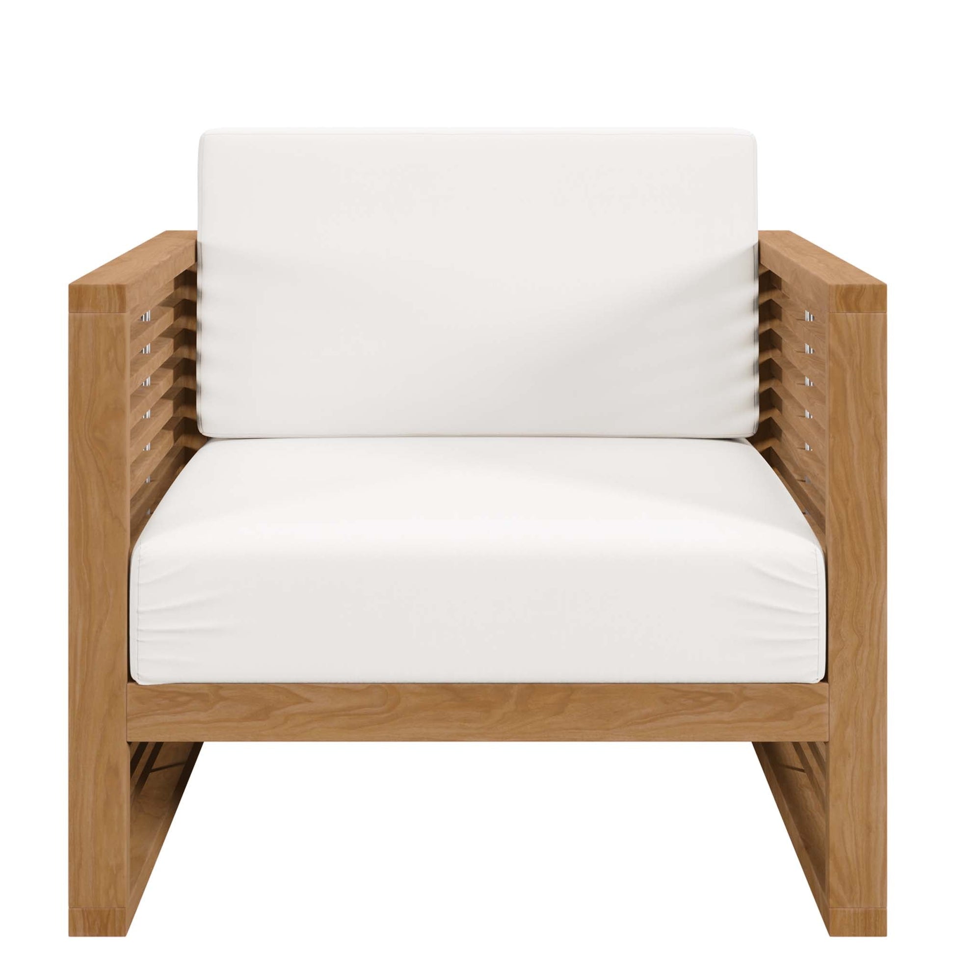 Enjoy warm weather and spirited conversation with the Carlsbad Teak Wood Outdoor Patio Furniture Set. A bold statement on the porch, in your backyard, or poolside, this patio set abounds in contemporary style with a slatted, clean-lined design. Ideal for al fresco entertaining or relaxing by the pool, the Carlsbad Outdoor Patio Furniture Collection is crafted with durable Premium Grade A teak wood and complete with comfortable cushions covered in machine washable sun, stain, water, and fade resistant Sunproof® fabric covers. Includes non-marking plastic foot glides. Patio Set Includes: Loveseat, Armchair, Coffee Table