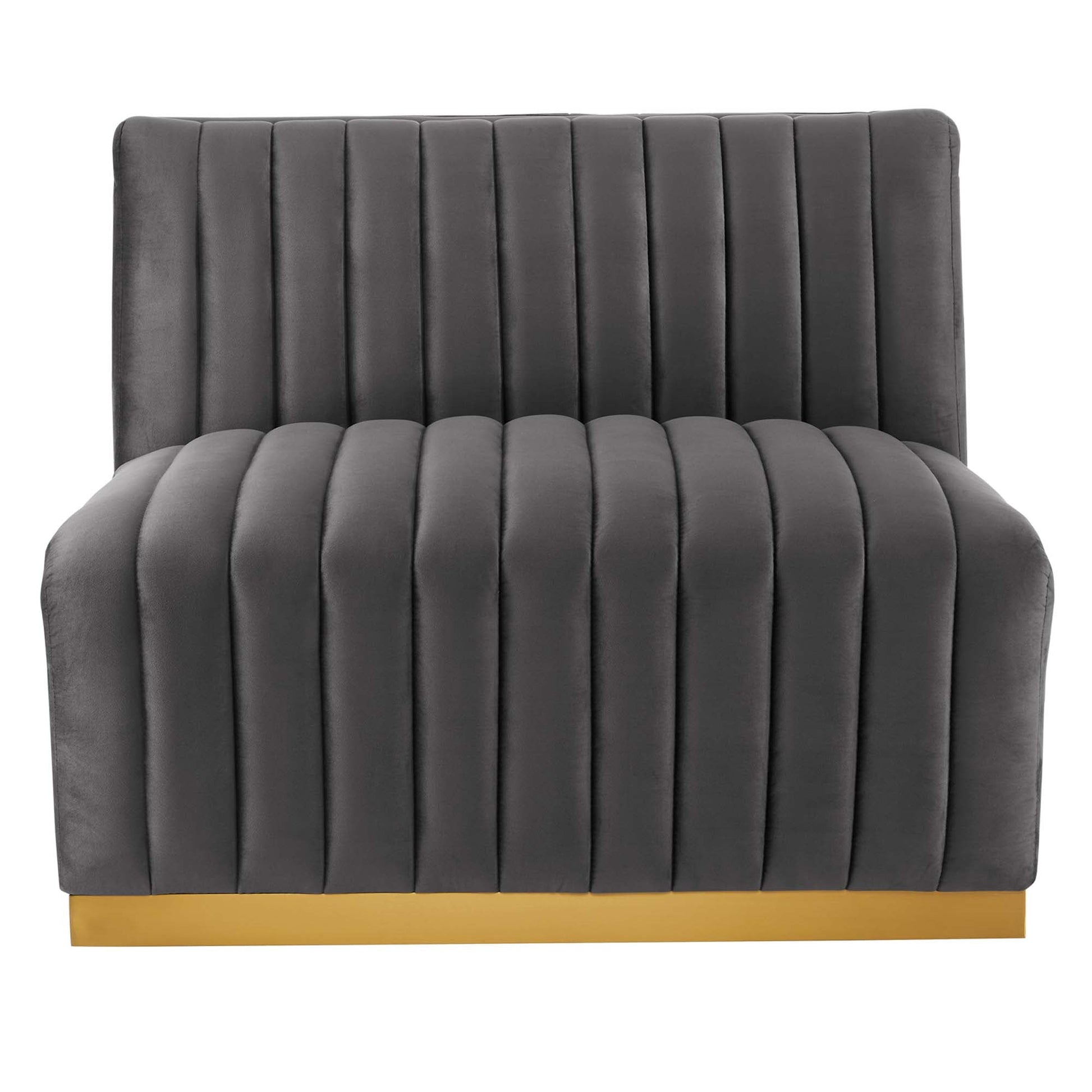 Modern appeal surrounds the Conjure Channel Tufted Performance Velvet Upholstered Armless Chair. Luxuriously soft, stain-resistant performance velvet upholstery covers dense foam padding and an individually wrapped spring coil system for a supportive living room chair that will become the go-to lounge spot for family and friends. Vertical channel tufting and subtle French piping adds depth to this vintage inspired sectional piece that effortlessly becomes the focal point in your living room. Solidly constructed from wood and plywood, this armless chair features non-marking foot caps and boasts a brushed gold stainless steel base. Versatile and elegant, this sectional sofa piece is ideally suited for a variety of decor styles in your living room, lounge, or home office. Chair Weight Capacity: 331 lbs.