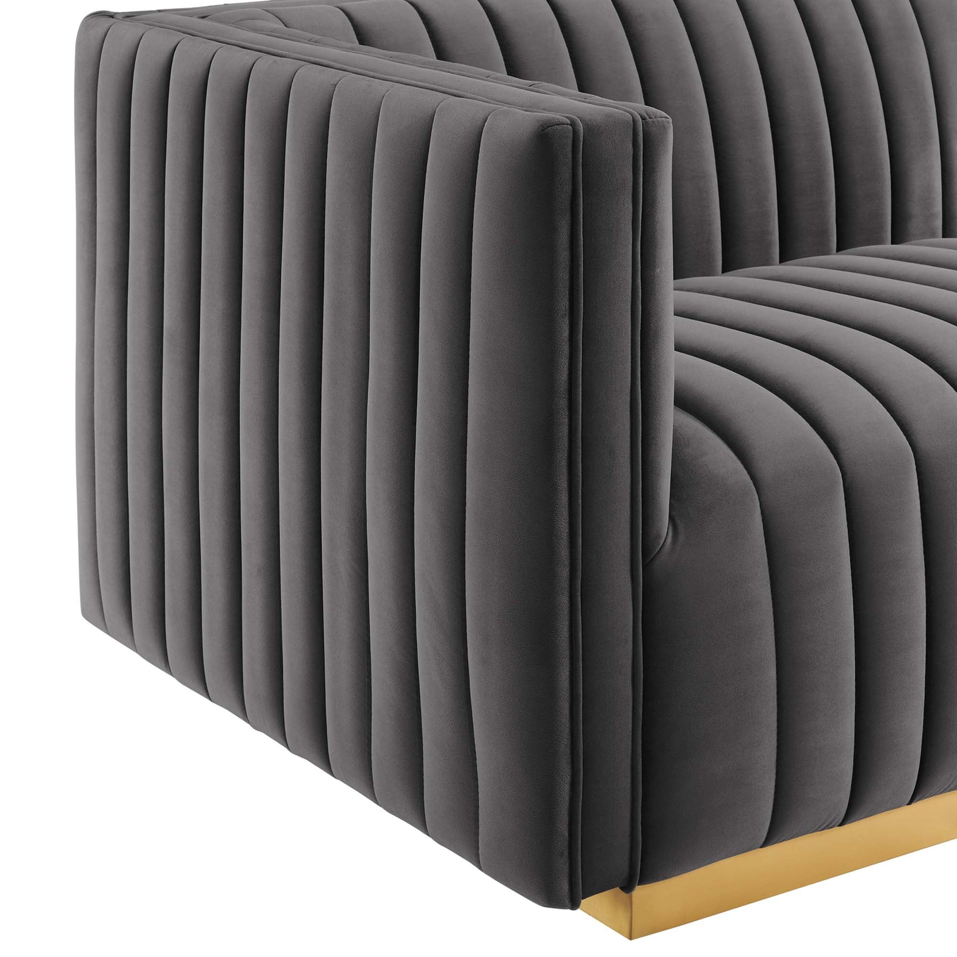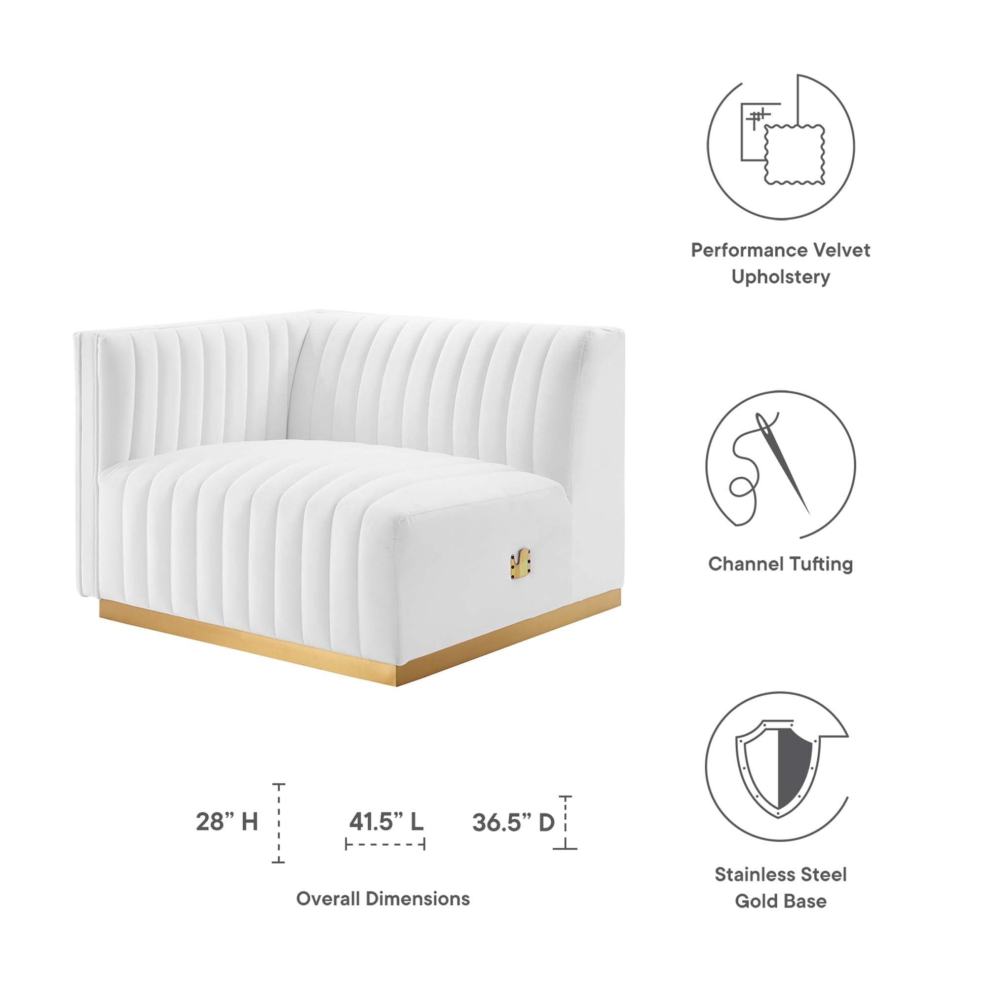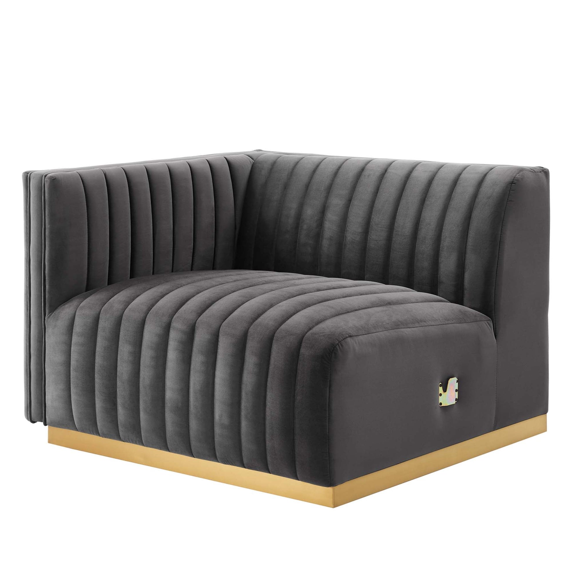 Modern appeal surrounds the Conjure Channel Tufted Performance Velvet Upholstered Left-Arm Chair. Luxuriously soft, stain-resistant performance velvet upholstery covers dense foam padding and an individually wrapped spring coil system for a supportive living room chair that will become the go-to lounge spot for family and friends. Vertical channel tufting and subtle French piping adds depth to this vintage inspired sectional piece that effortlessly becomes the focal point in your living room. Solidly constructed from wood and plywood, this armchair features non-marking foot caps and boasts a brushed gold stainless steel base. Versatile and elegant, this sectional sofa piece is ideally suited for a variety of decor styles in your living room, lounge, or home office. Chair Weight Capacity: 331 lbs.