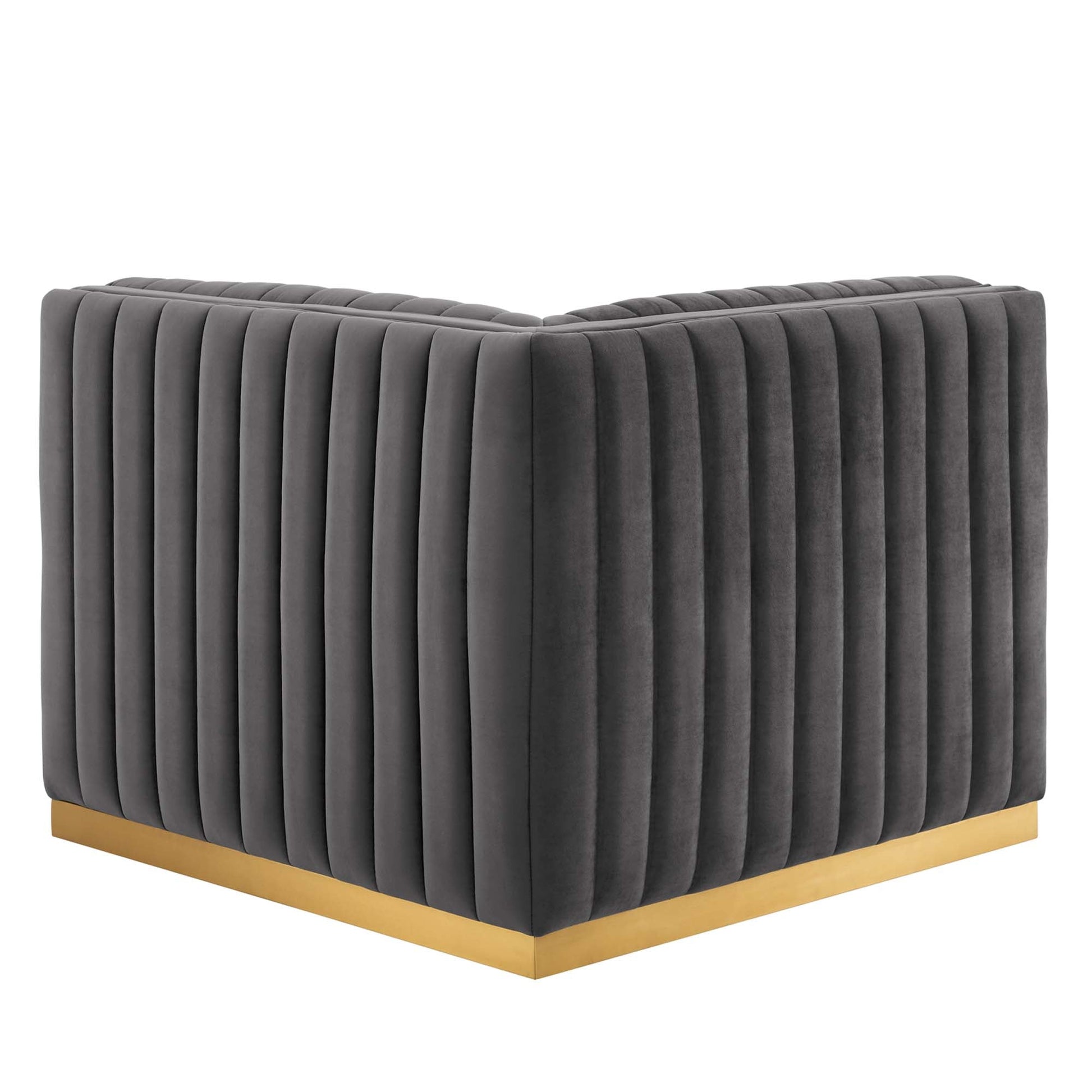 Modern appeal surrounds the Conjure Channel Tufted Performance Velvet Upholstered Left Corner Chair. Luxuriously soft, stain-resistant performance velvet upholstery covers dense foam padding and an individually wrapped spring coil system for a supportive living room chair that will become the go-to lounge spot for family and friends. Vertical channel tufting and subtle French piping adds depth to this vintage inspired sectional piece that effortlessly becomes the focal point in your living room. Solidly constructed from wood and plywood, this corner chair features non-marking foot caps and boasts a brushed gold stainless steel base. Versatile and elegant, this sectional sofa piece is ideally suited for a variety of decor styles in your living room, lounge, or home office. Chair Weight Capacity: 331 lbs.
