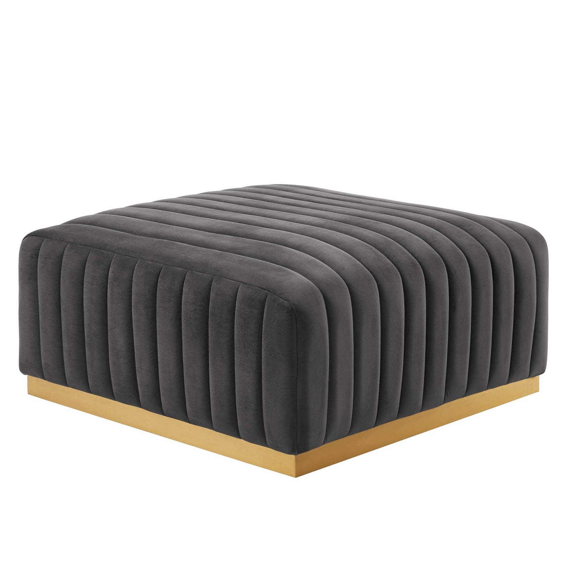 Modern appeal surrounds the Conjure Channel Tufted Performance Velvet Upholstered Ottoman. Luxuriously soft, stain-resistant performance velvet upholstery covers dense foam padding and an individually wrapped spring coil system for a supportive living room ottoman that will become the go-to lounge spot for family and friends. Vertical channel tufting and subtle French piping adds depth to this vintage inspired sectional piece that effortlessly becomes the focal point in your living room. Solidly constructed from wood and plywood, this ottoman features non-marking foot caps and boasts a brushed gold stainless steel base. Versatile and elegant, this sectional sofa piece is ideally suited for a variety of decor styles in your living room, lounge, or home office. Chair Weight Capacity: 331 lbs.