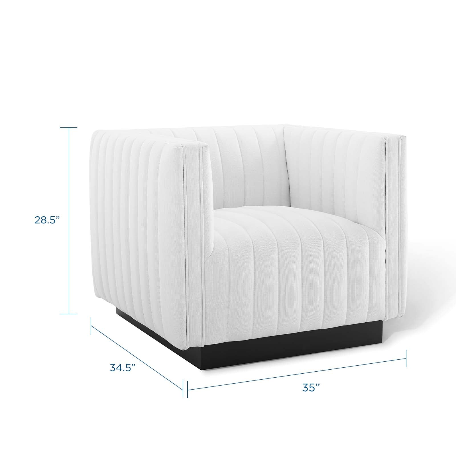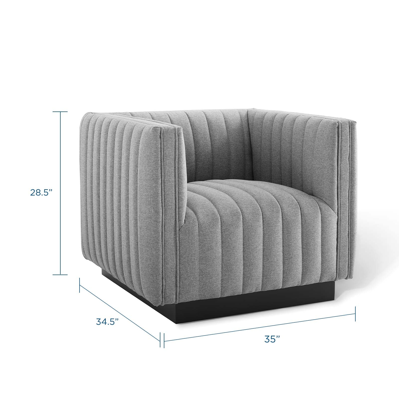 Follow the organic linear design of the Conjure Channel Tufted Fabric Upholstered Armchair. Relax into the glam deco style and allow the streamlined effect of the vertical channel tufting details to direct your living room decor. Conjure Armchair adds a charming retro modern style to your living room, lounge room, or home office. Individually wrapped spring coils are covered with dense foam padding and soft polyester fabric upholstery for a premium seating experience. This elegant living room accent chair rests securely on a matte black wooden base that complements any modern home or apartment. Armchair Weight Capacity: 441 lbs. Comes Fully Assembled.