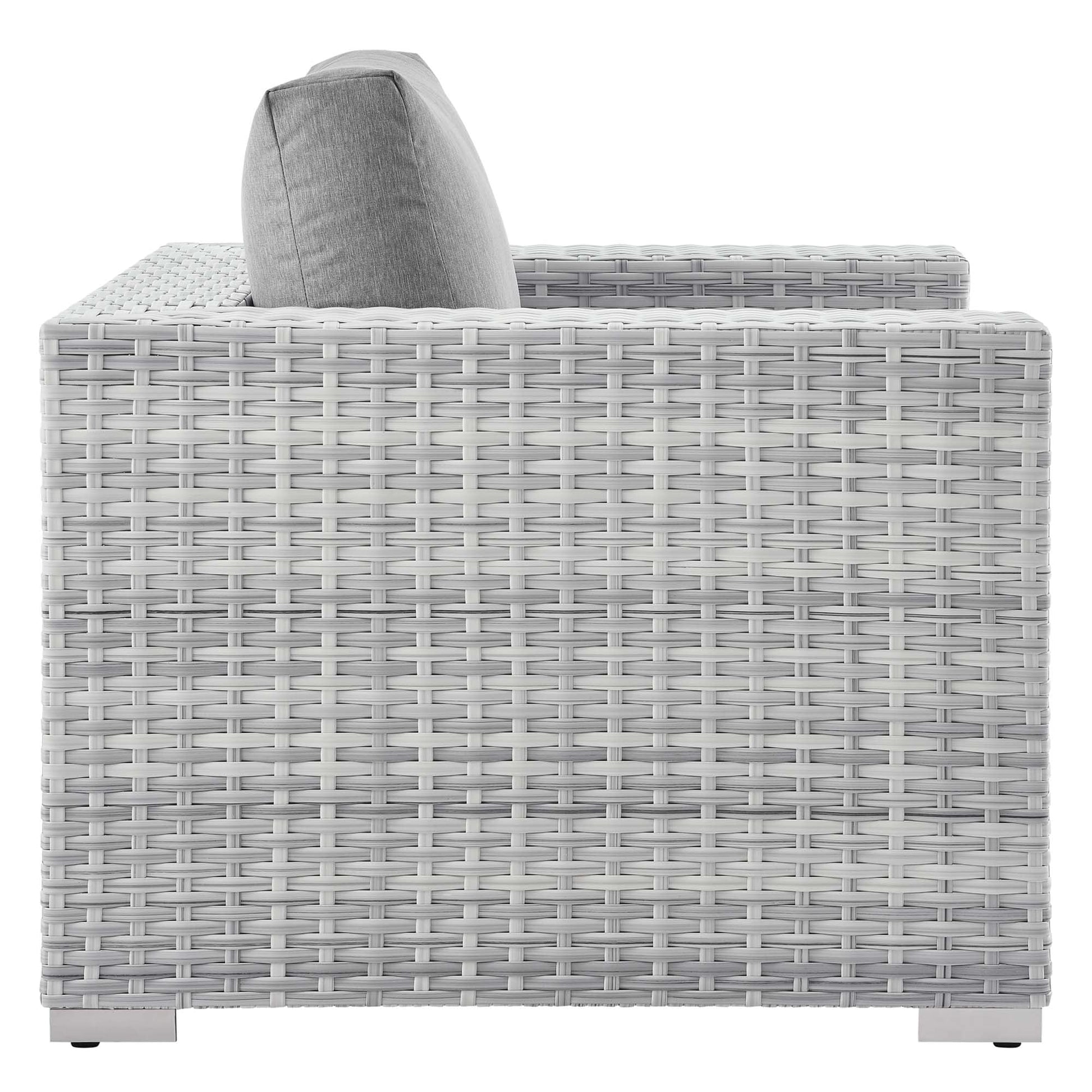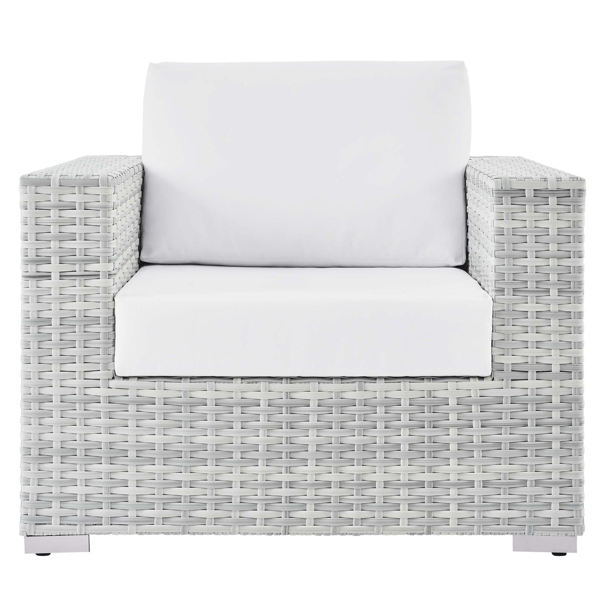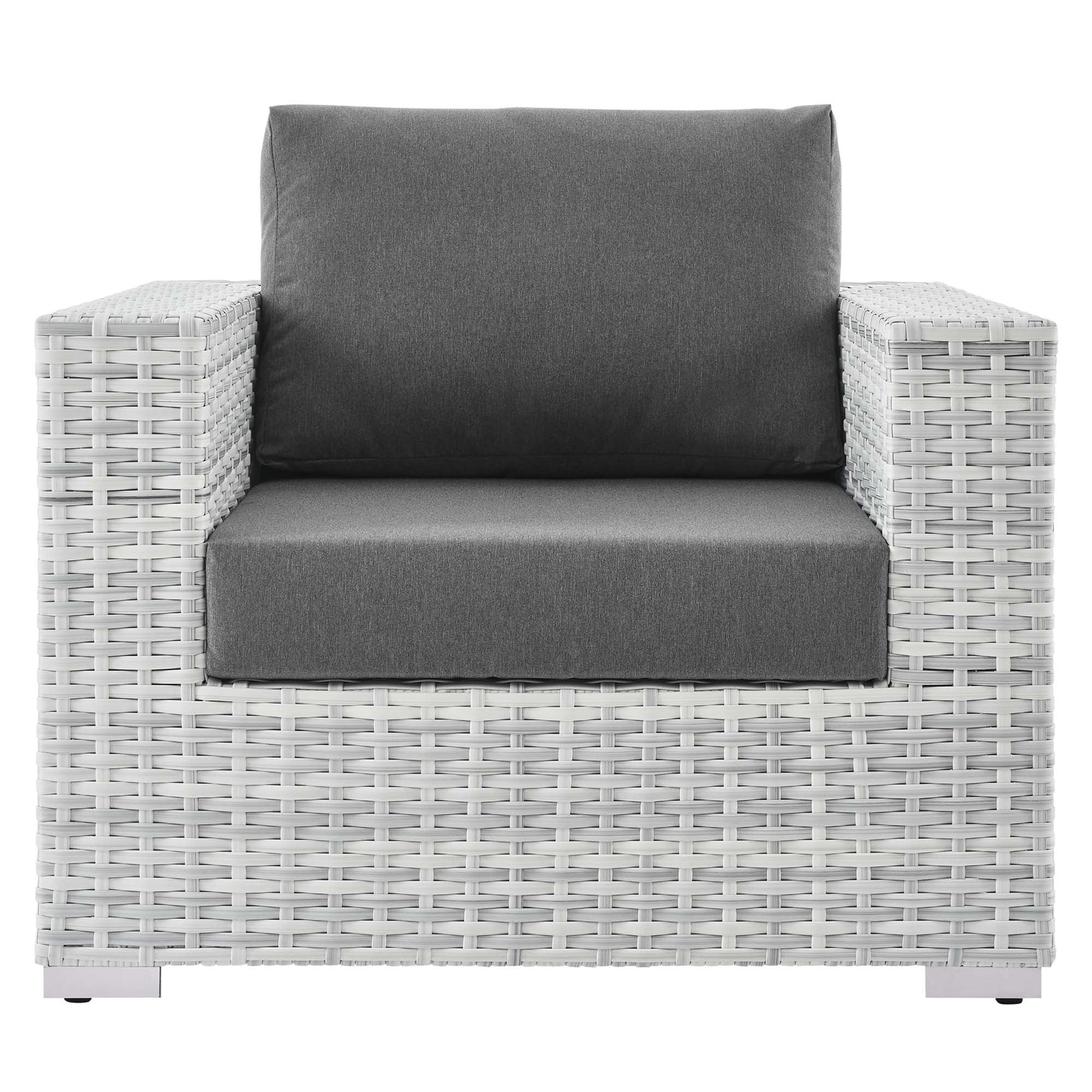 Gather stages of sensitivity with the Convene Outdoor Sectional series. Made with a synthetic rattan weave and a powder-coated aluminum frame, Convene is a versatile patio armchair from an outdoor collection that shifts and combines according to the spontaneous needs of the moment. Outfitted with all-weather fabric cushions, the Convene Armchair leaves a positive impression on friends and family while enhancing your patio, backyard, or poolside retreat with palpable distinction.