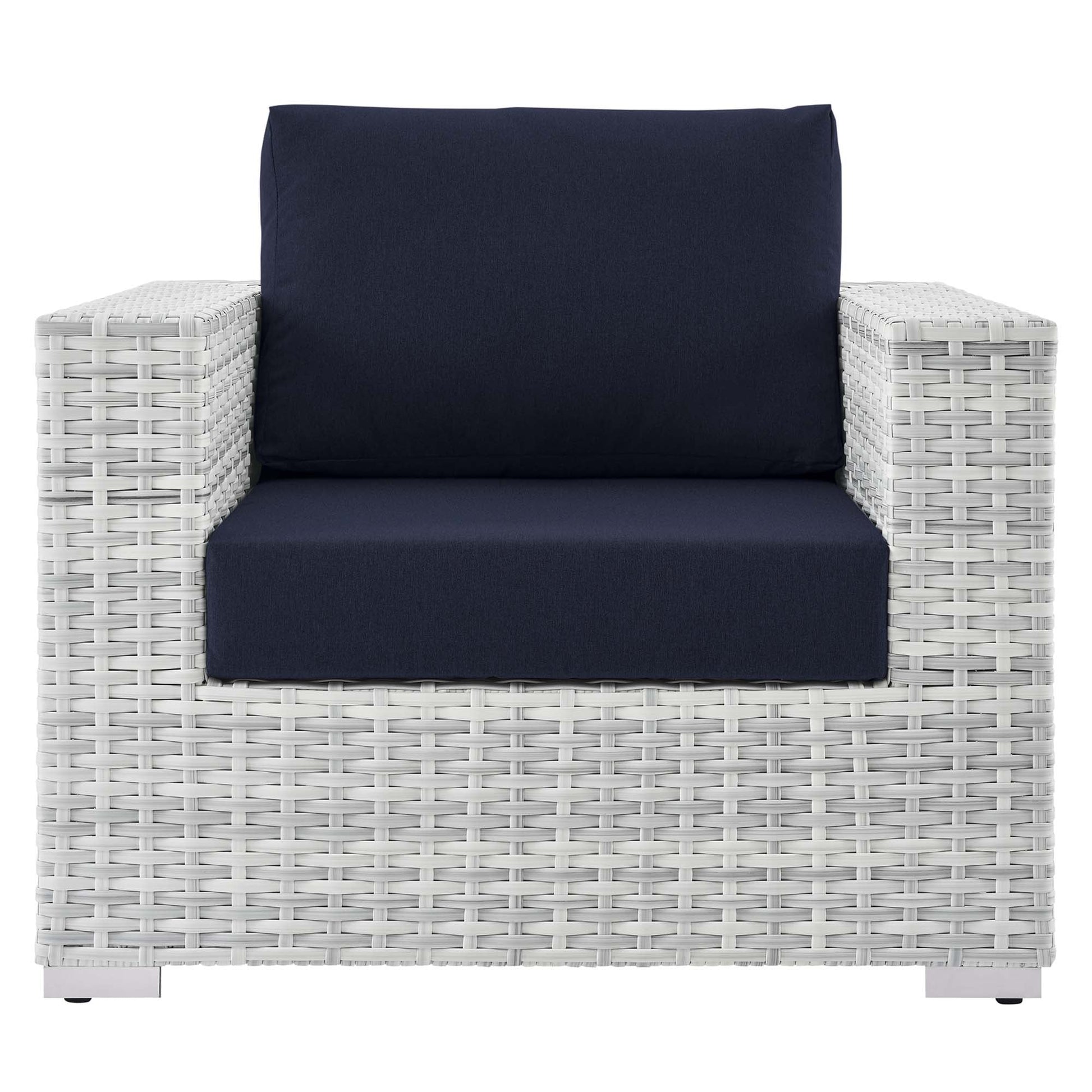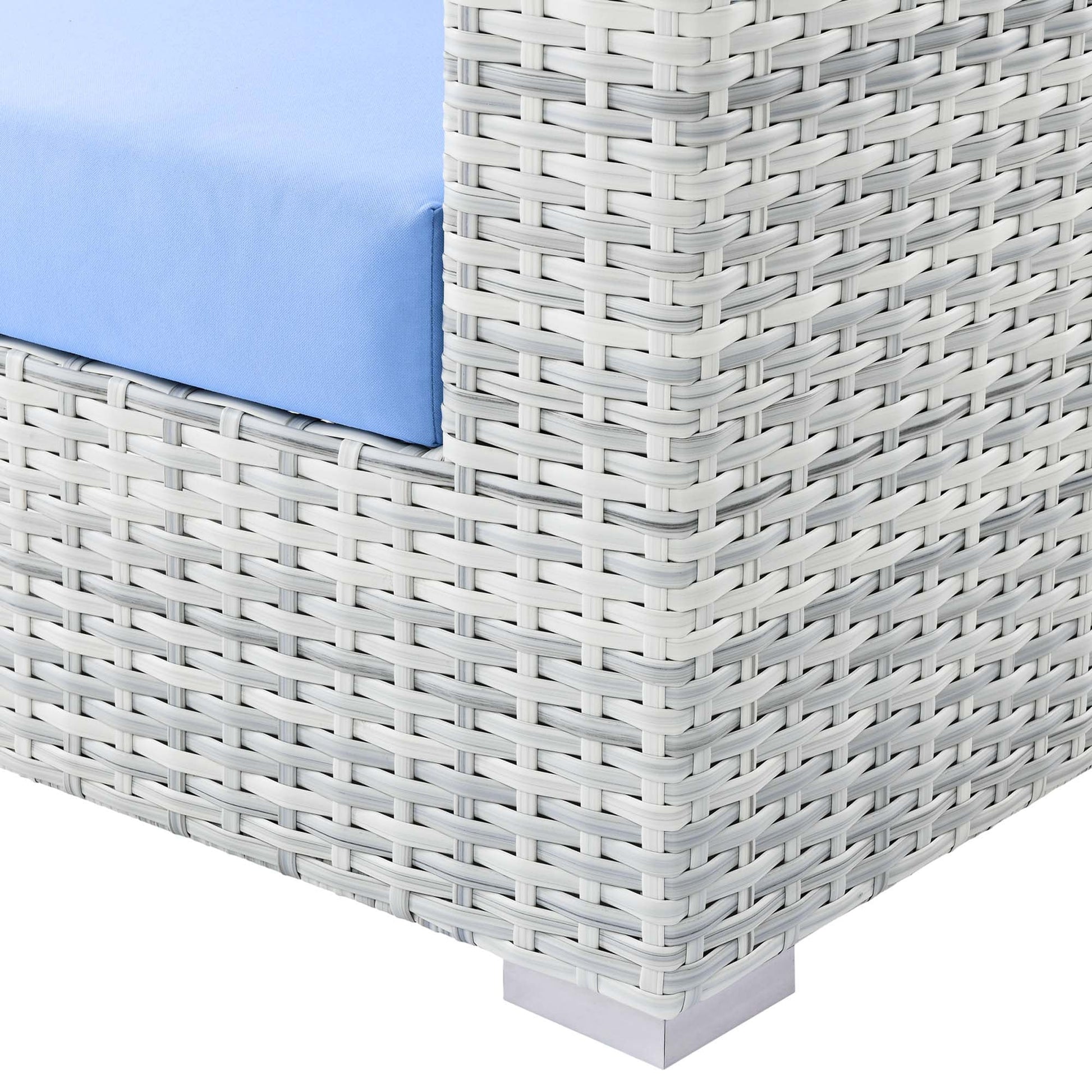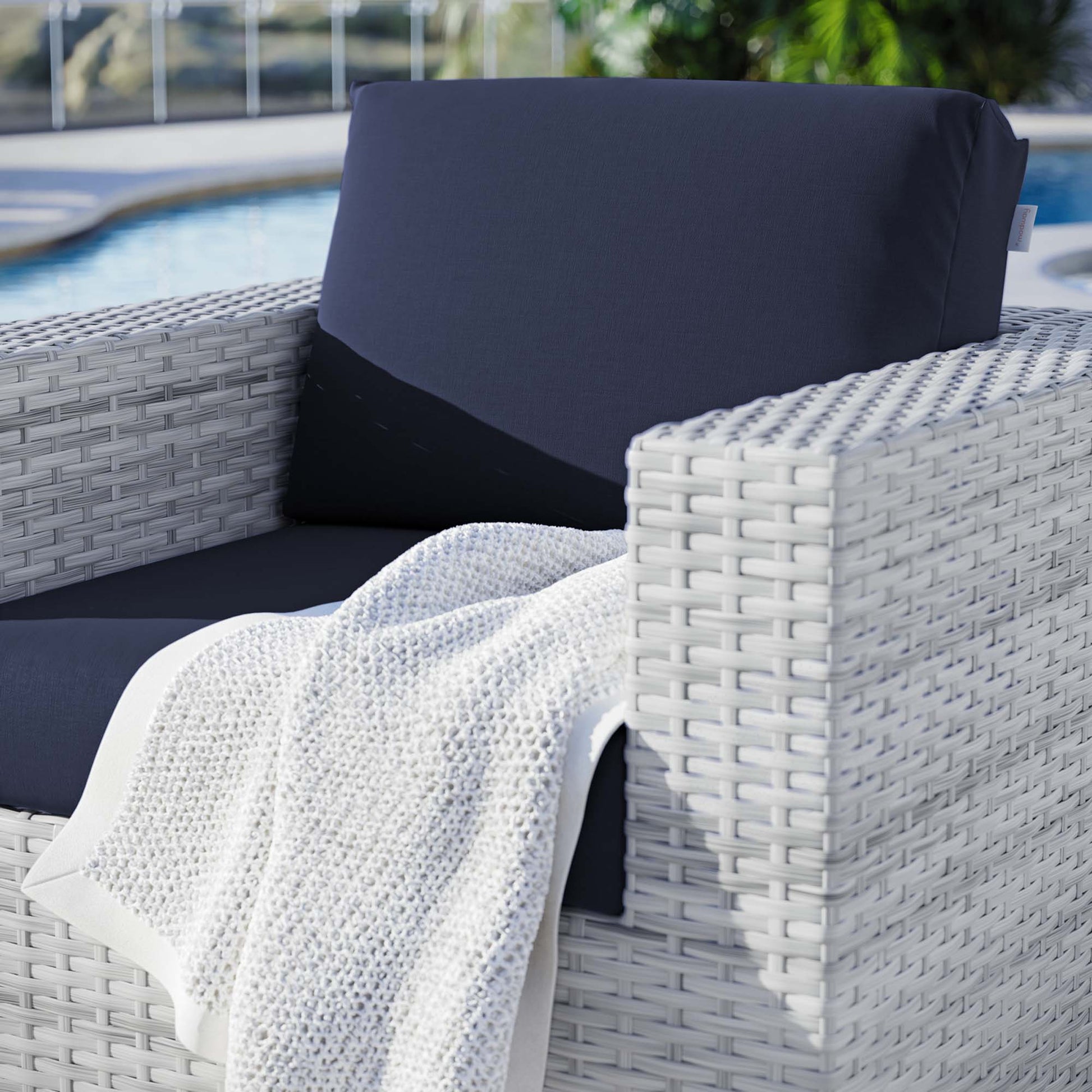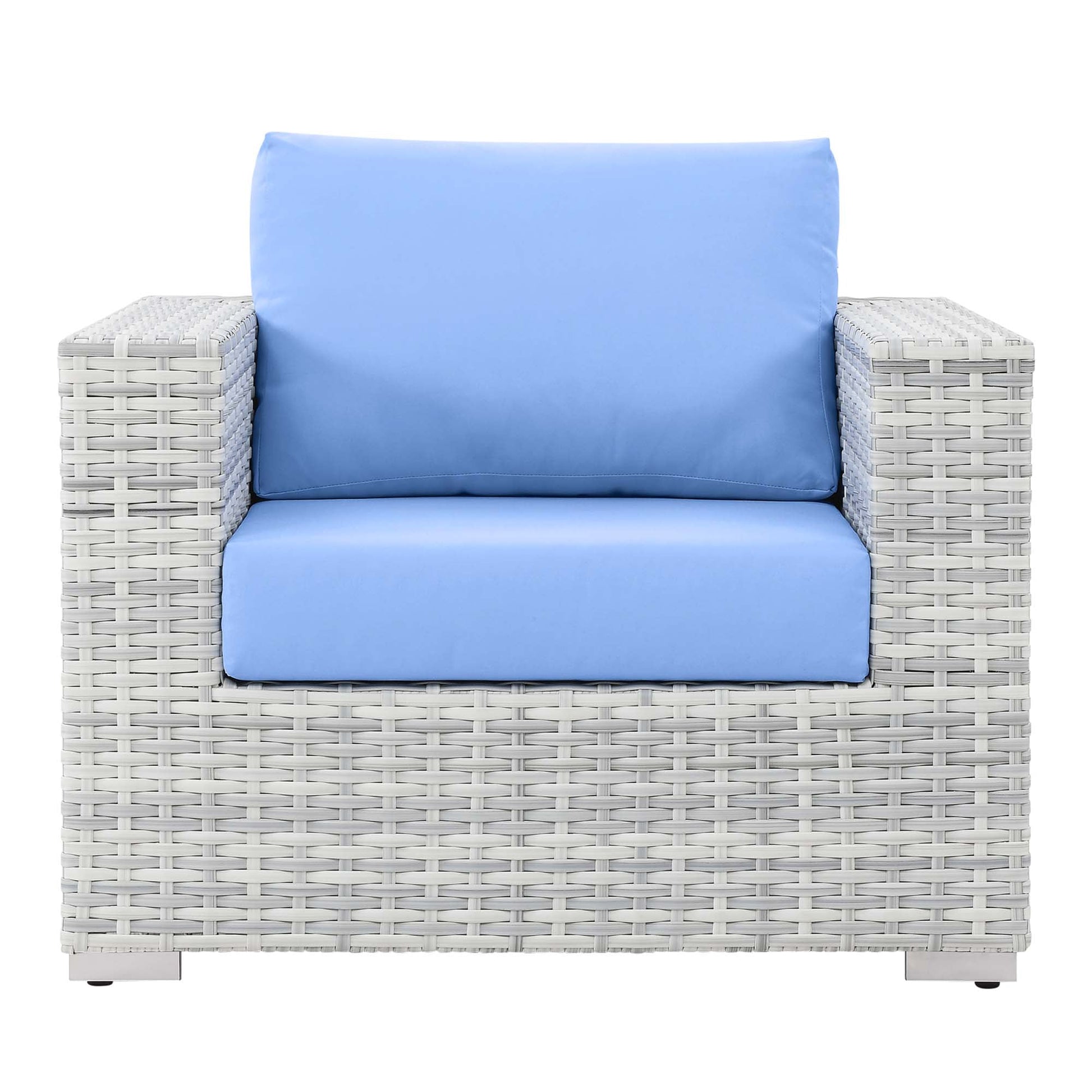 Gather stages of sensitivity with the Convene Outdoor Sectional series. Made with a synthetic rattan weave and a powder-coated aluminum frame, Convene is a versatile patio armchair from an outdoor collection that shifts and combines according to the spontaneous needs of the moment. Outfitted with all-weather fabric cushions, the Convene Armchair leaves a positive impression on friends and family while enhancing your patio, backyard, or poolside retreat with palpable distinction.