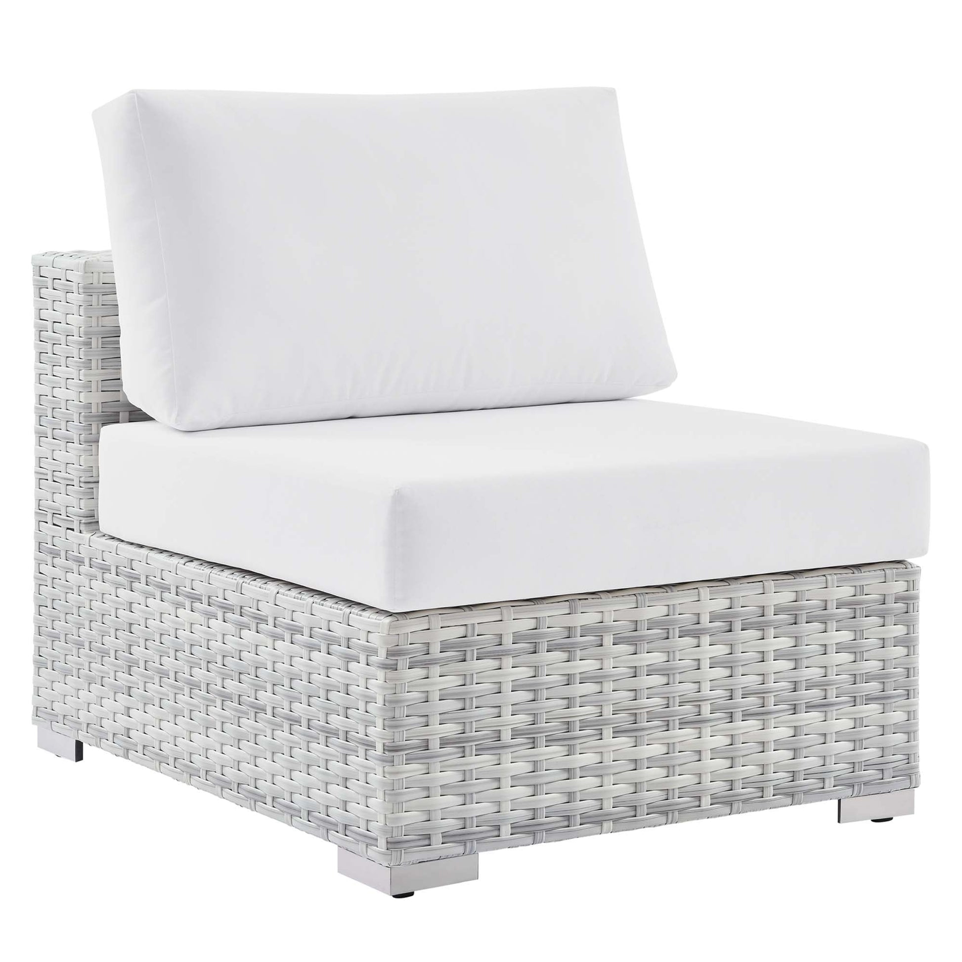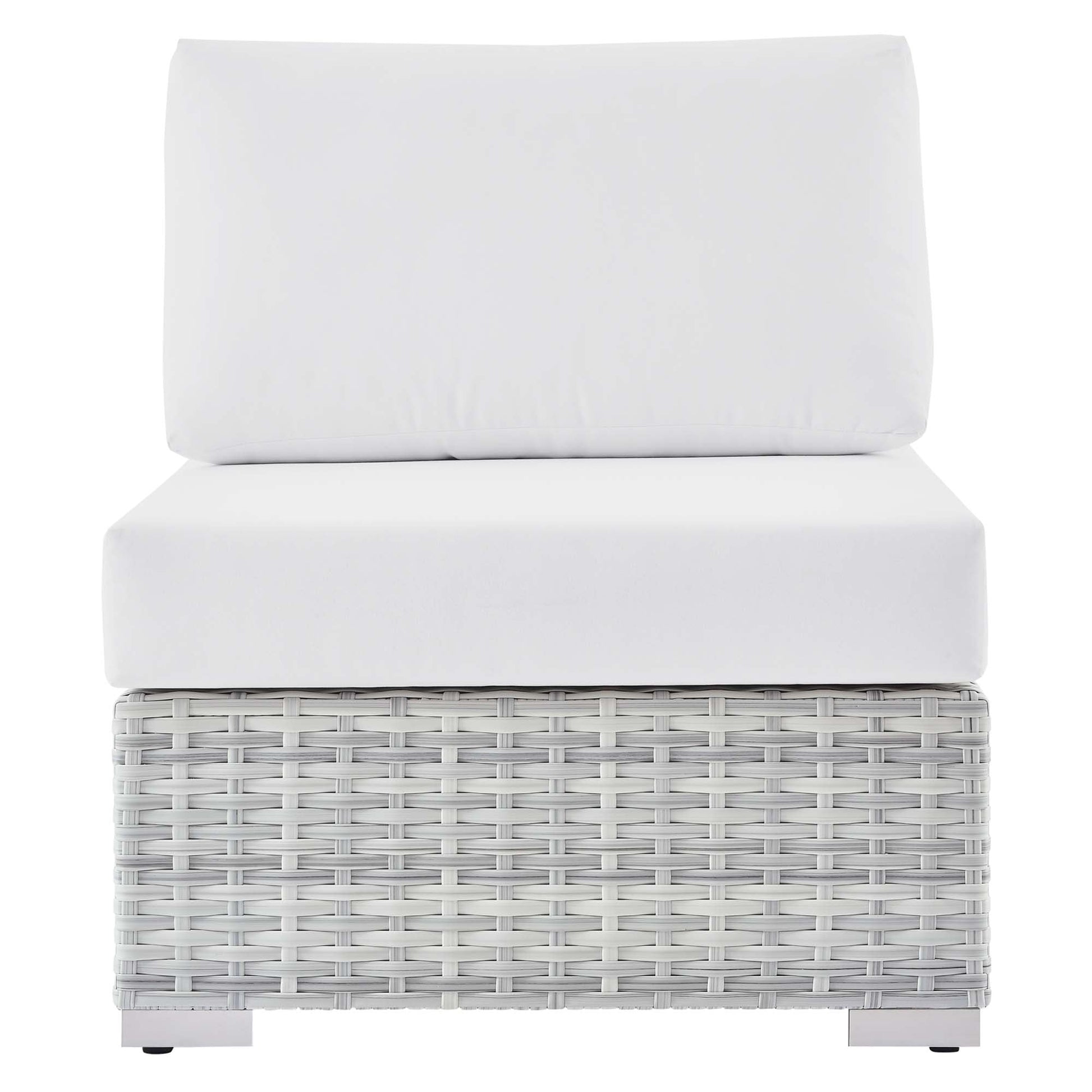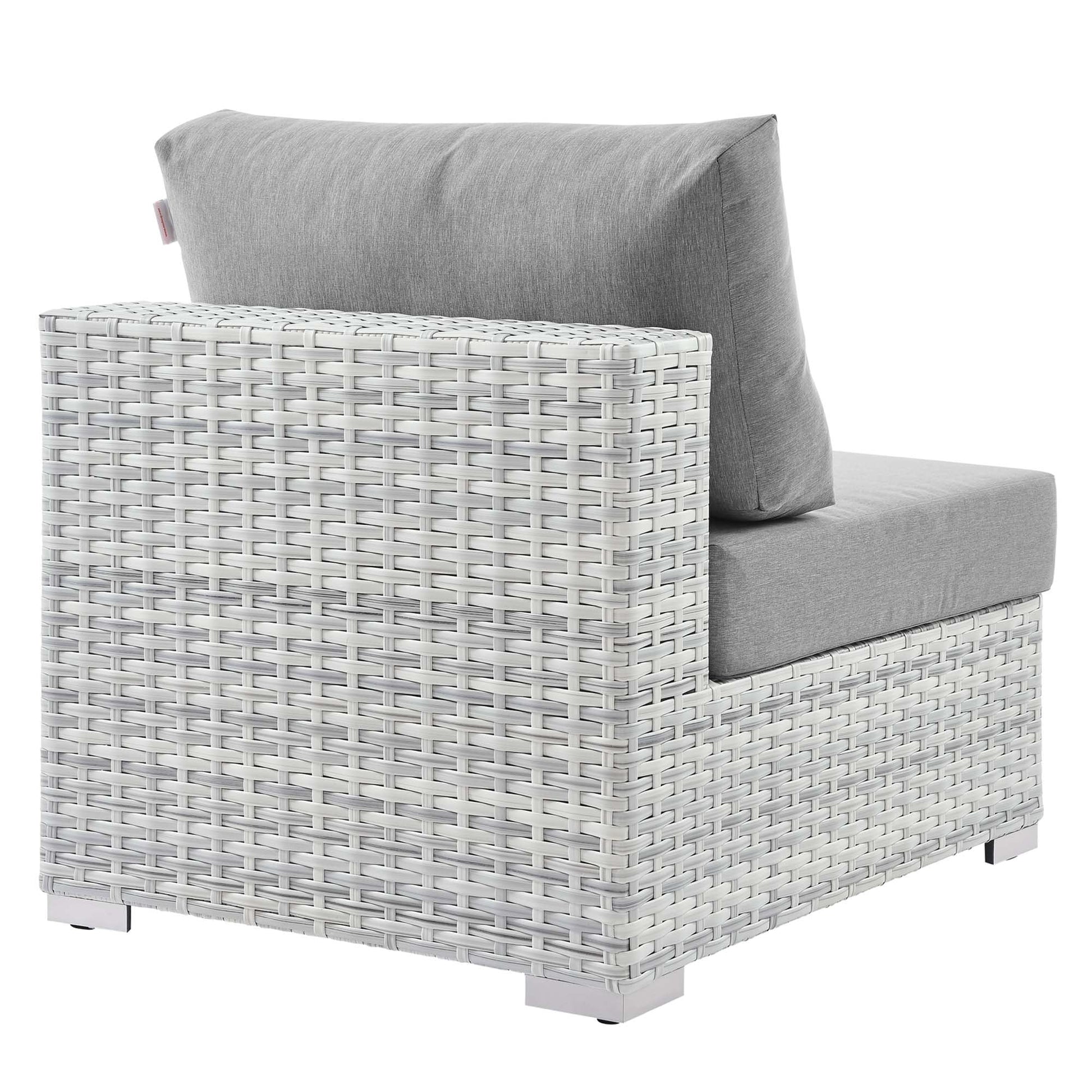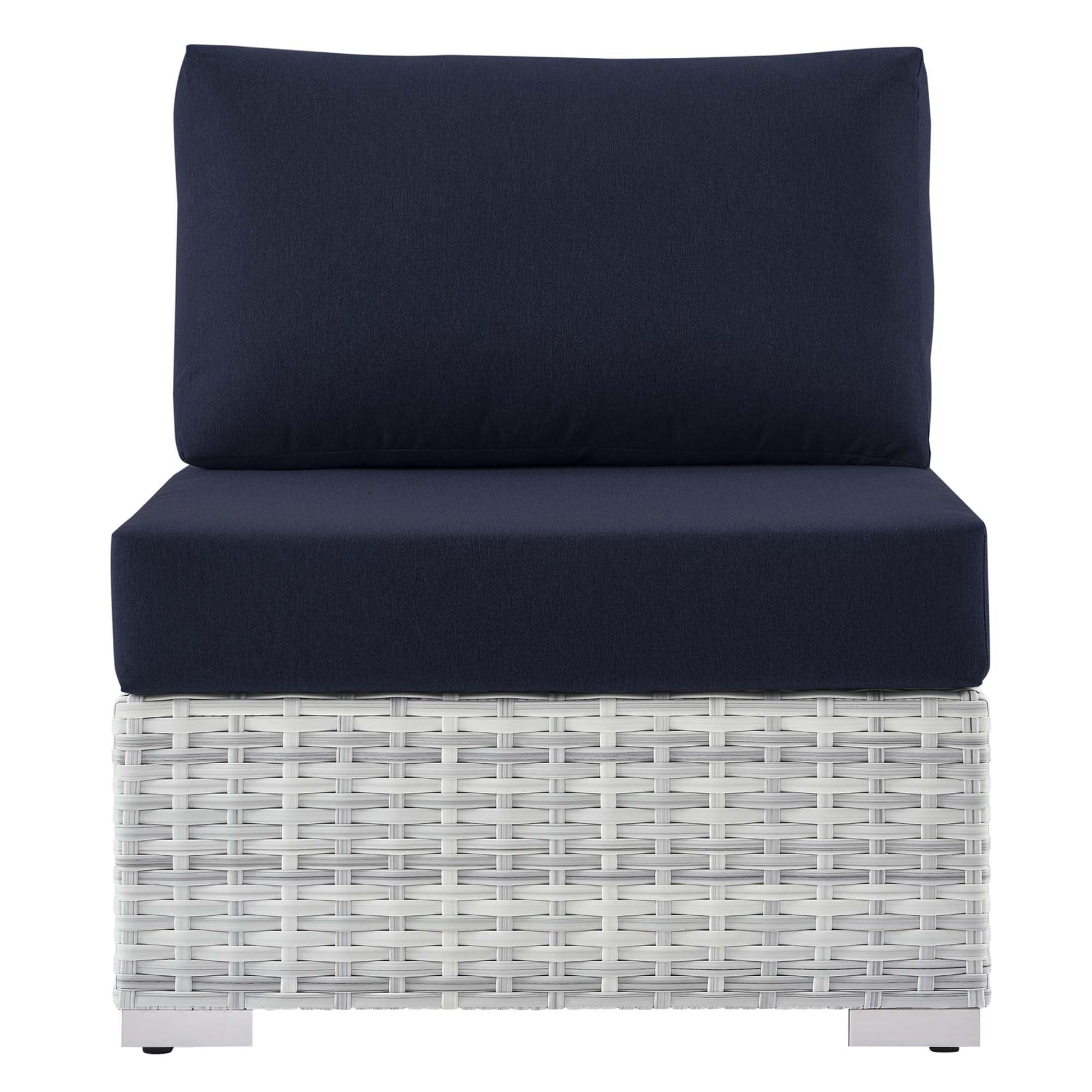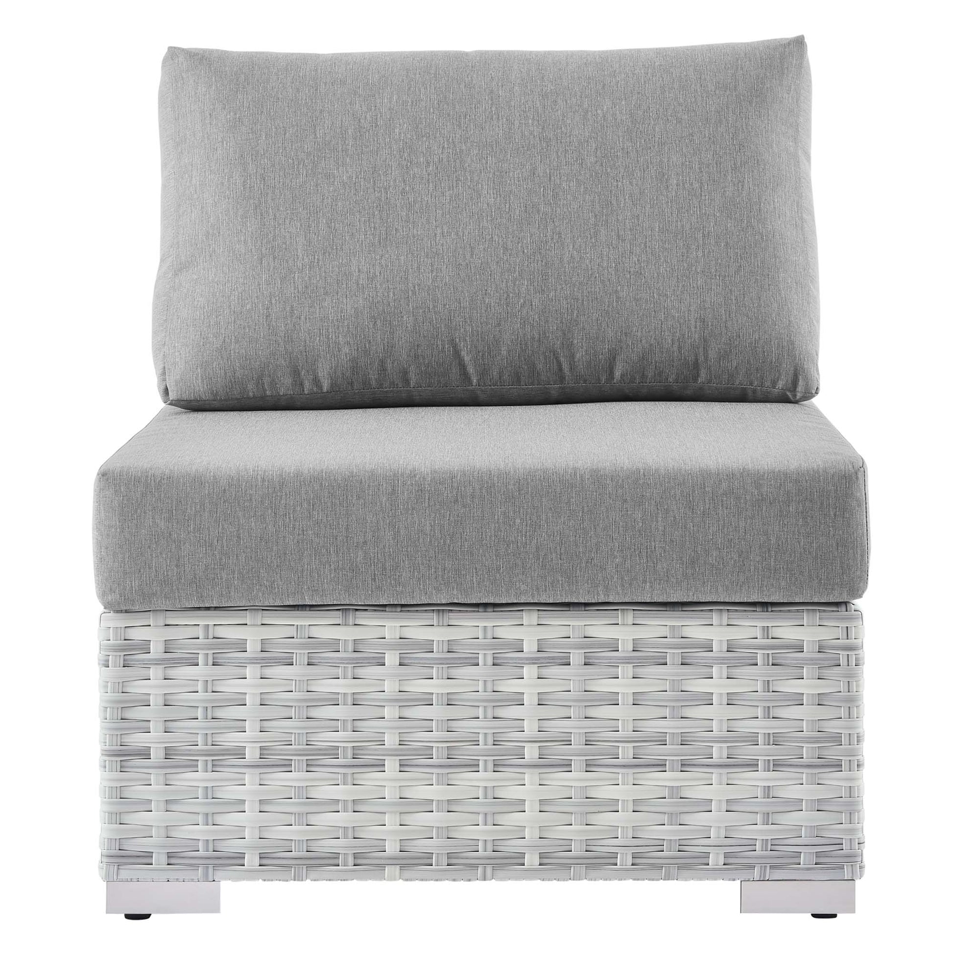 Gather stages of sensitivity with the Convene Outdoor Sectional series. Made with a synthetic rattan weave and a powder-coated aluminum frame, Convene is a versatile patio armless chair from an outdoor collection that shifts and combines according to the spontaneous needs of the moment. Outfitted with all-weather fabric cushions, the Convene Armless Chair leaves a positive impression on friends and family while enhancing your patio, backyard, or poolside retreat with palpable distinction.