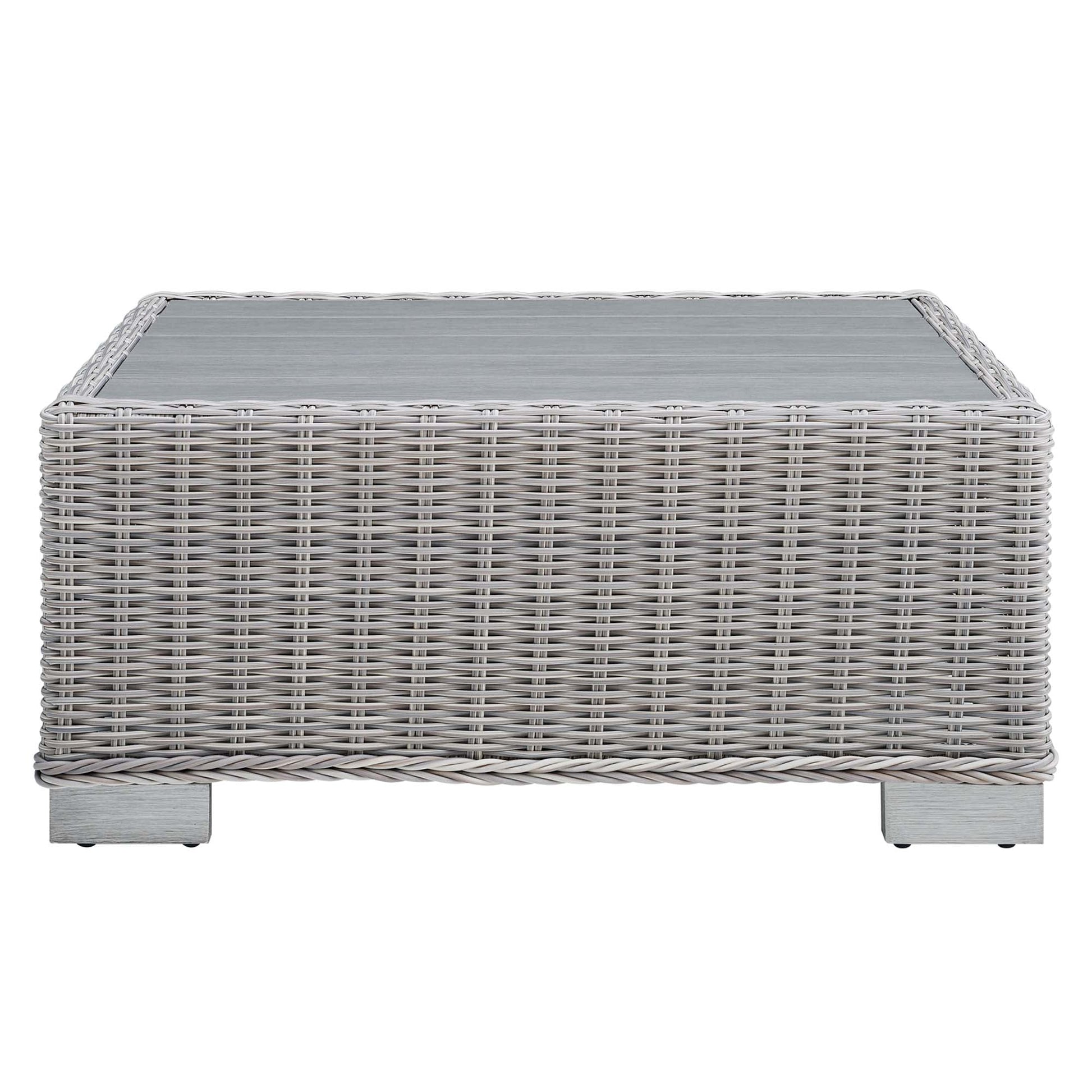Enjoy fresh air and alfresco relaxation with the Conway Outdoor Patio Wicker Rattan Coffee Table. Wrapped in UV-resistant light gray synthetic wicker rattan, this patio table boasts organic texture and a neutral hue that brings a calming presence to your outdoor space. The frame of this outdoor coffee table is crafted with durable powder-coated aluminum and rests on L-shaped legs with plastic foot glides. A planked tabletop that replicates the texture of wood offers the perfect place to rest a drink or plate while entertaining. Trending aesthetics and a classic design define this outdoor patio furniture collection making it a beautiful addition to any outdoor space including the backyard, patio, porch, balcony, or poolside.
