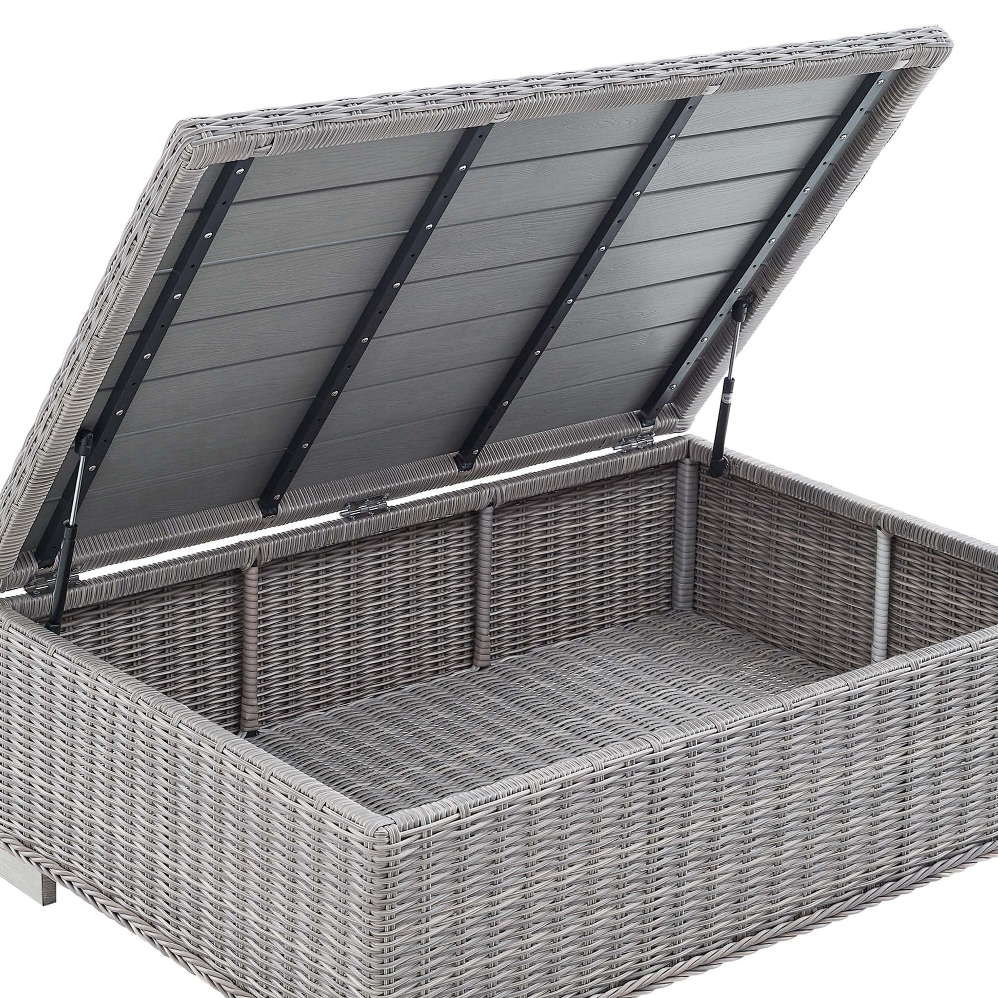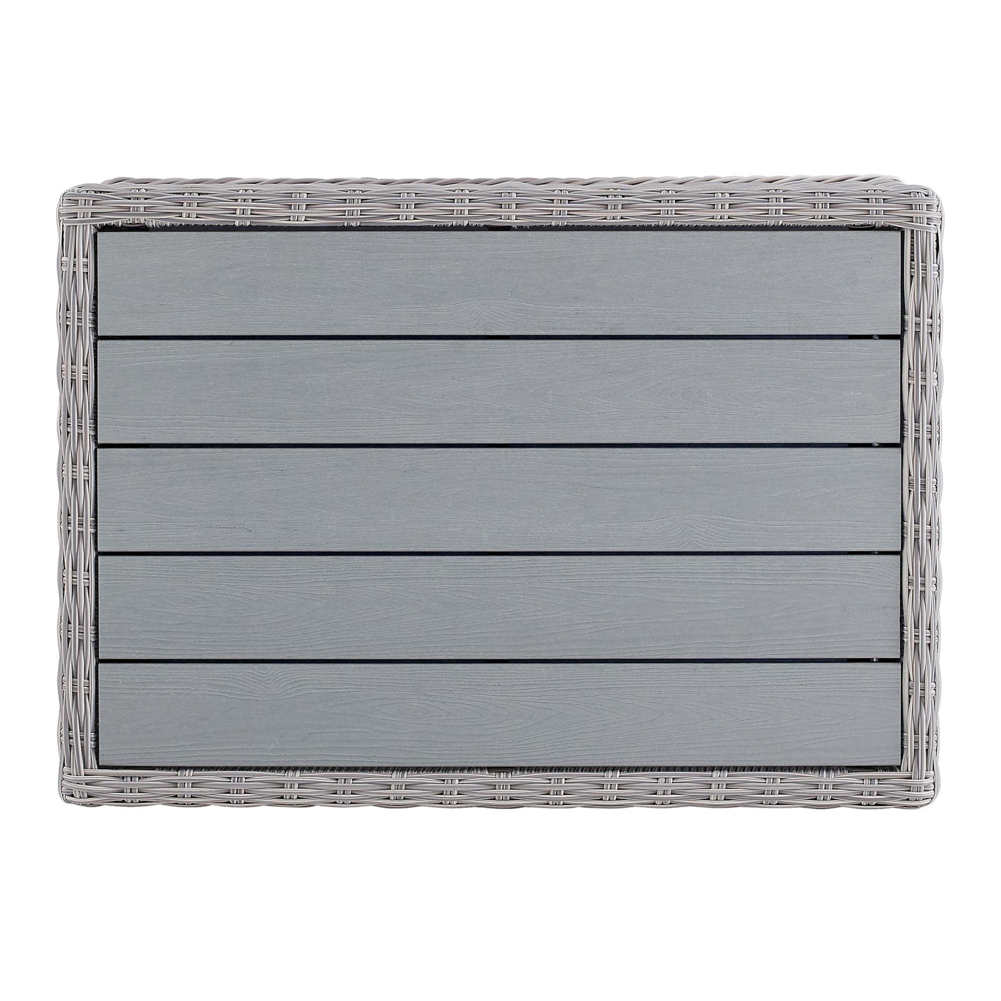 Enjoy fresh air and alfresco relaxation with the Conway Outdoor Patio Wicker Rattan Coffee Table. Wrapped in UV-resistant light gray synthetic wicker rattan, this patio table boasts organic texture and a neutral hue that brings a calming presence to your outdoor space. The frame of this outdoor coffee table is crafted with durable powder-coated aluminum and rests on L-shaped legs with plastic foot glides. A planked tabletop that replicates the texture of wood offers the perfect place to rest a drink or plate while entertaining. Trending aesthetics and a classic design define this outdoor patio furniture collection making it a beautiful addition to any outdoor space including the backyard, patio, porch, balcony, or poolside.