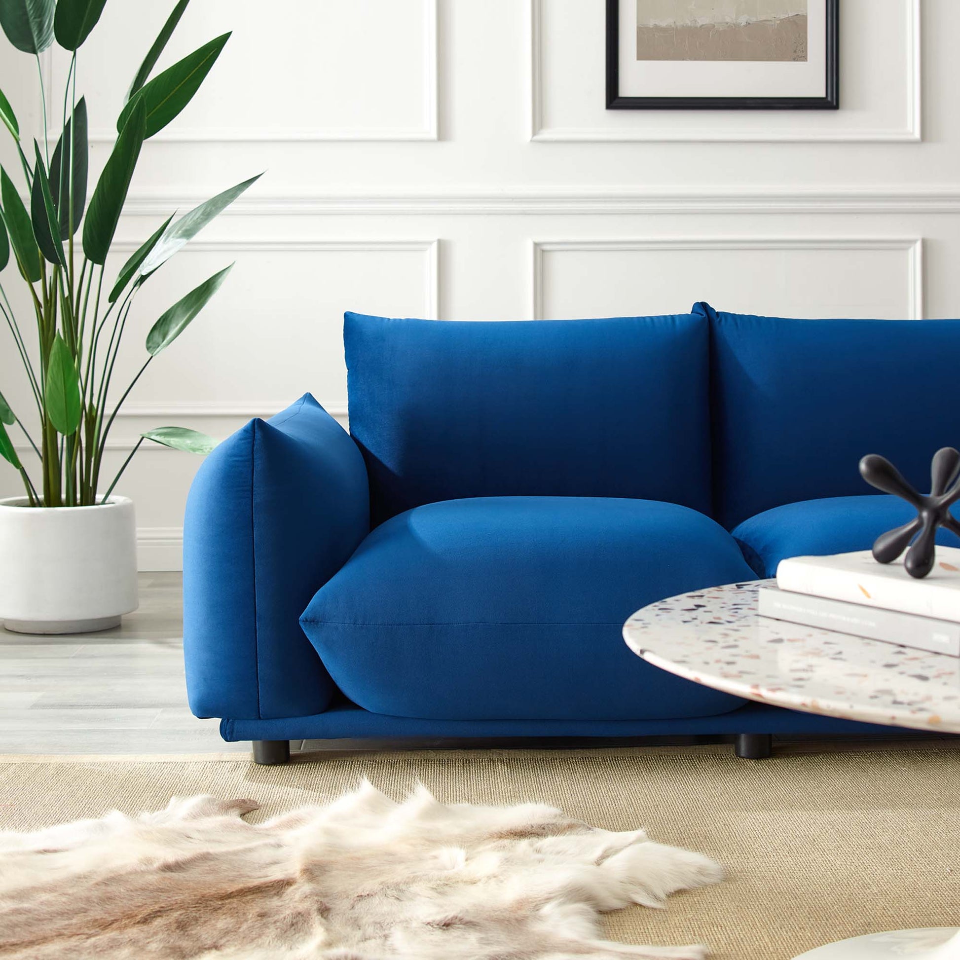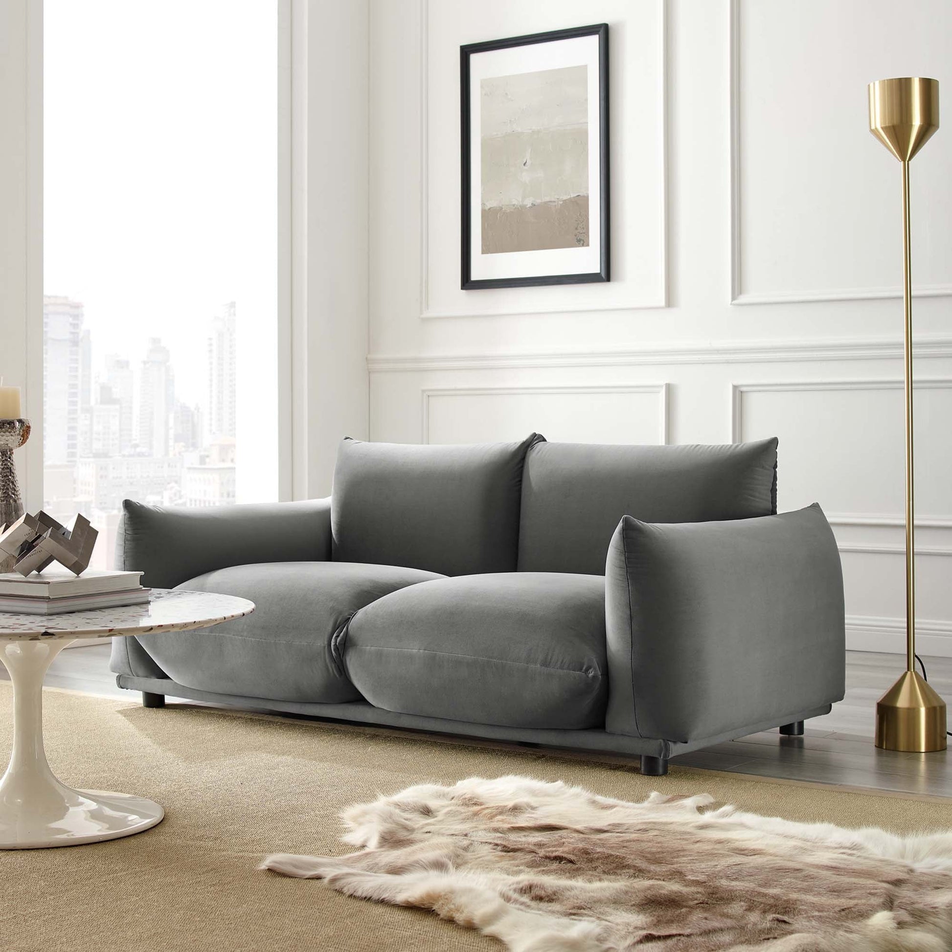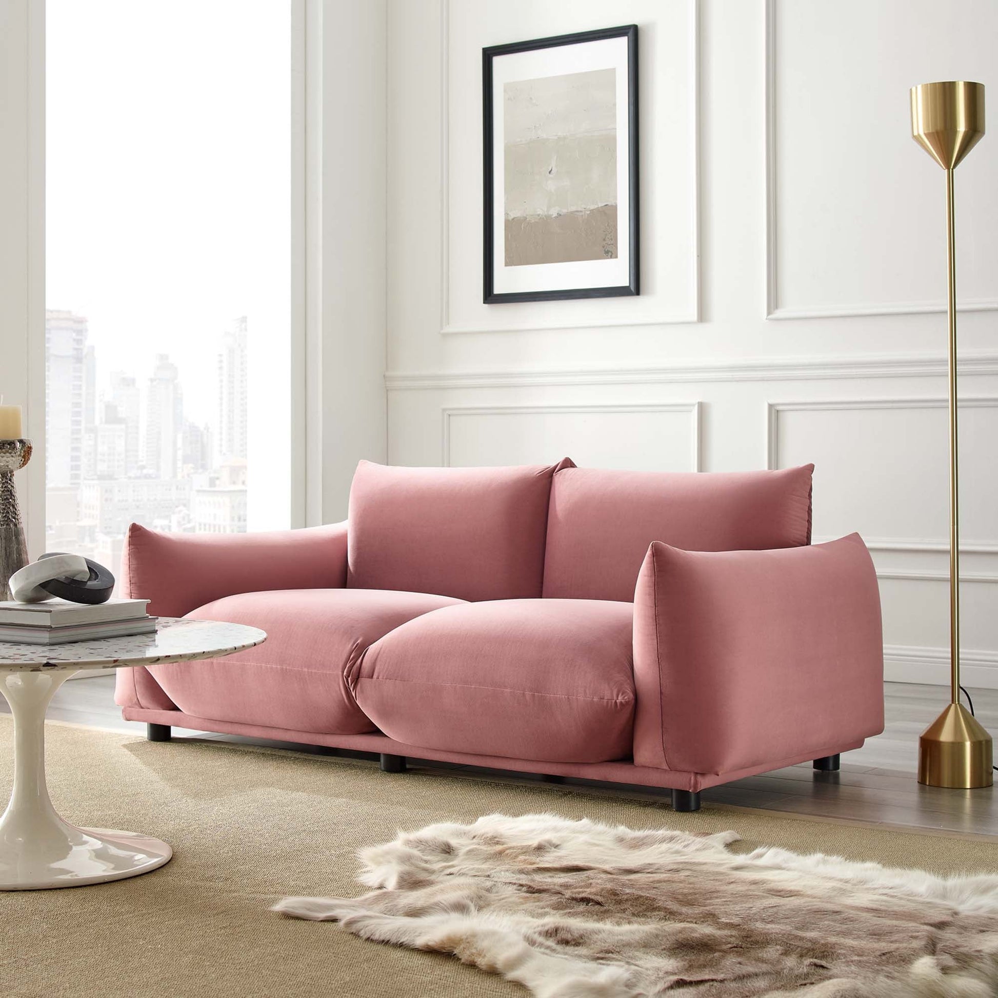 Sink into pillowy plush comfort with the Copious Performance Velvet Loveseat. Featuring an overstuffed design, this loveseat offers premium comfort with its plump cushions and soft, stain-resistant performance velvet upholstery. This cozy loveseat is made for lounging and makes a bold statement in the living room, family room, bedroom, or other lounge area. Resting atop rubberwood legs with non-marking foot caps, this two-seater sofa is crafted with dense foam padding and a solid wood and plywood frame for lasting durability. Weight Capacity: 662 lbs.