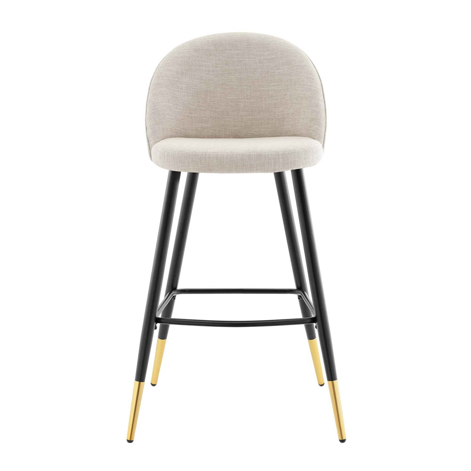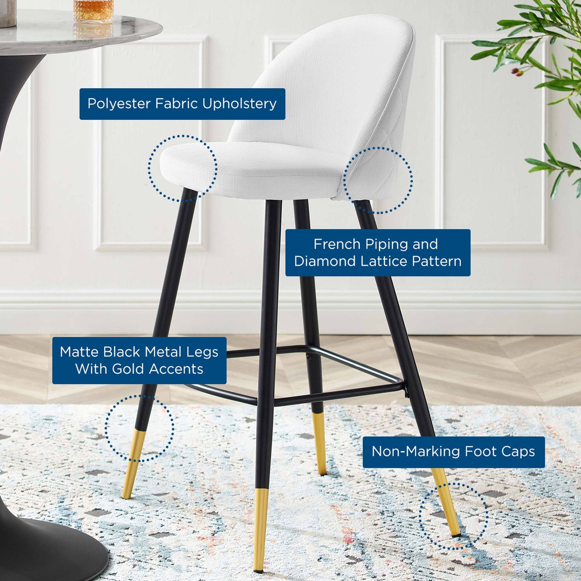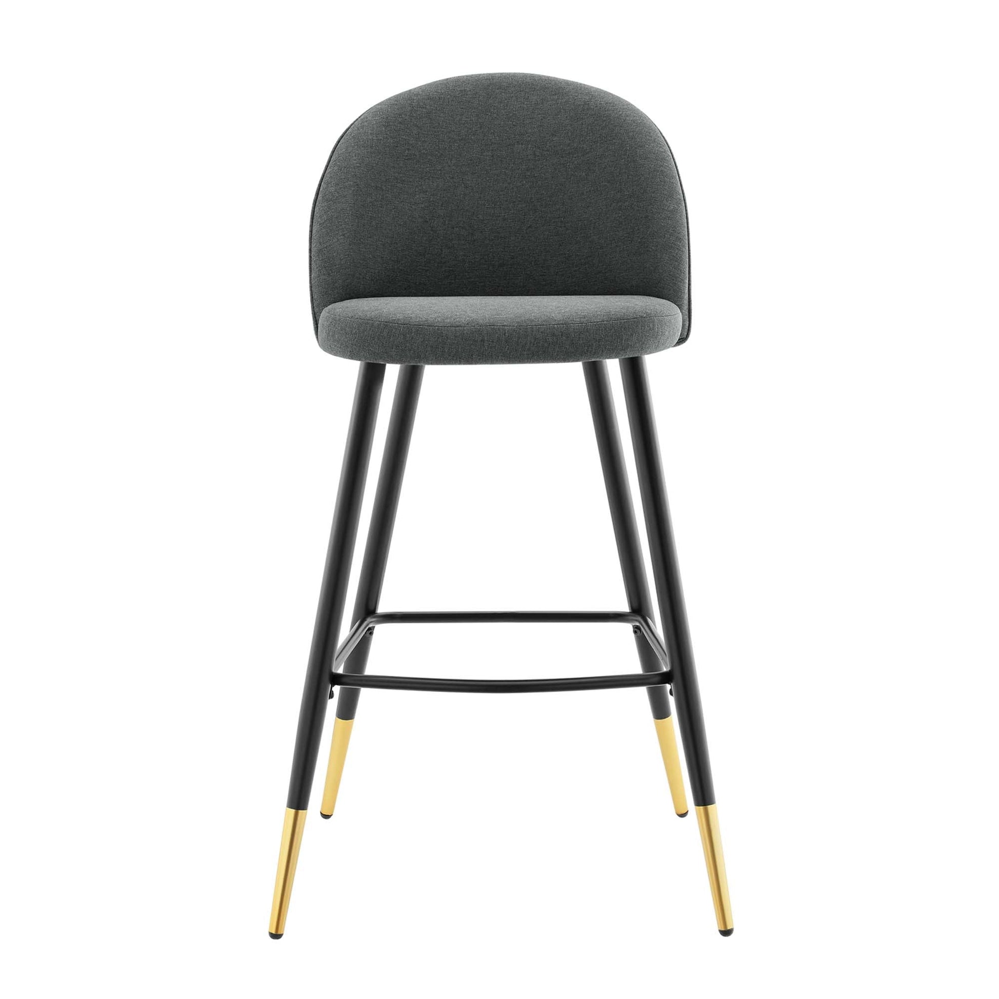 Inspire whimsical dining and functional style with the Cordial Fabric Upholstered Bar Stools- Set of 2. Featuring a rounded silhouette with French piping detail and a diamond lattice pattern along the back, these upholstered bar stools are covered in soft polyester fabric and padded in dense foam to grant supportive comfort while dining or relaxing. A versatile addition to a kitchen counter or bar table, this bar stool set rests atop black metal legs with gold accents and non-marking foot caps. Bar Stool Weight Capacity: 300 lbs.
