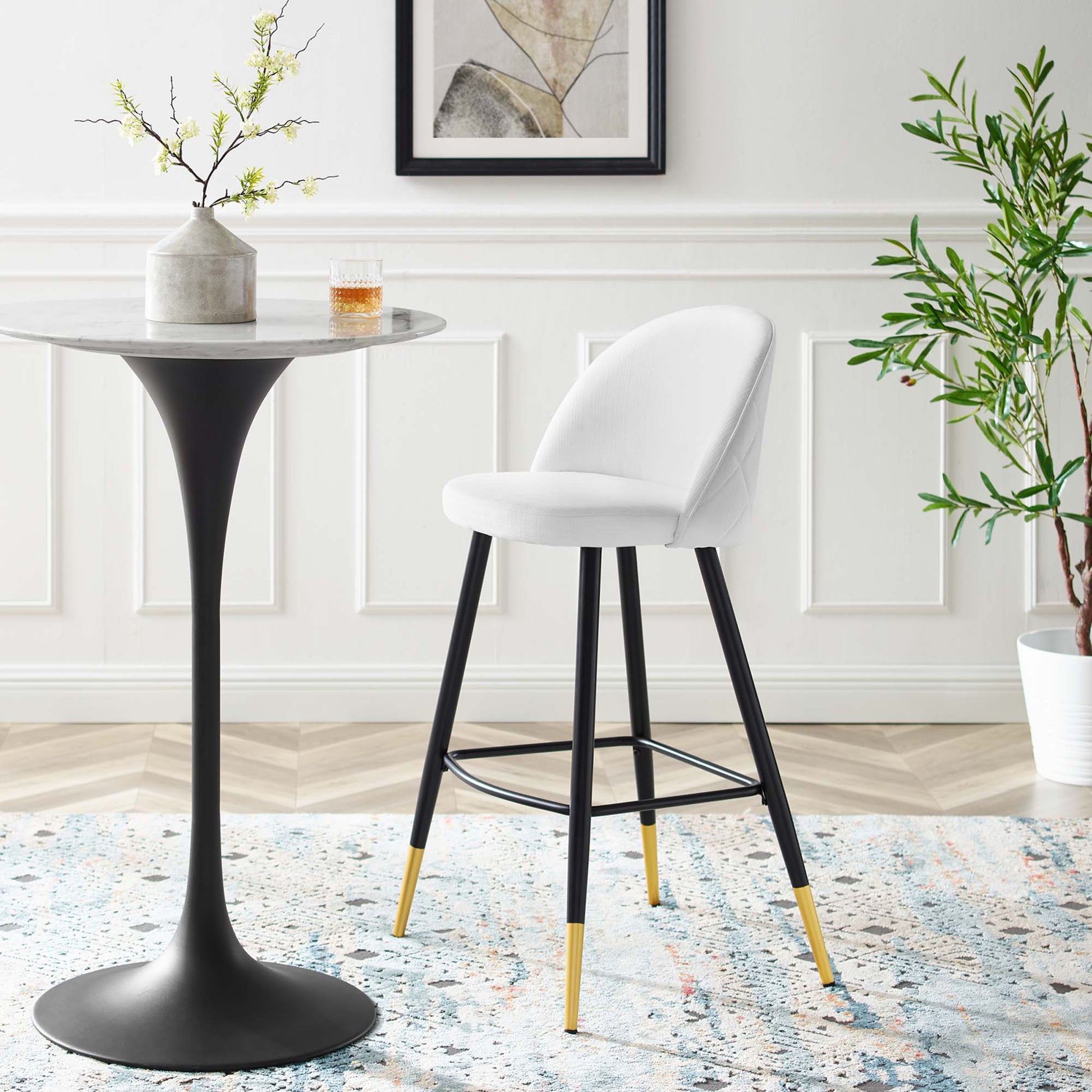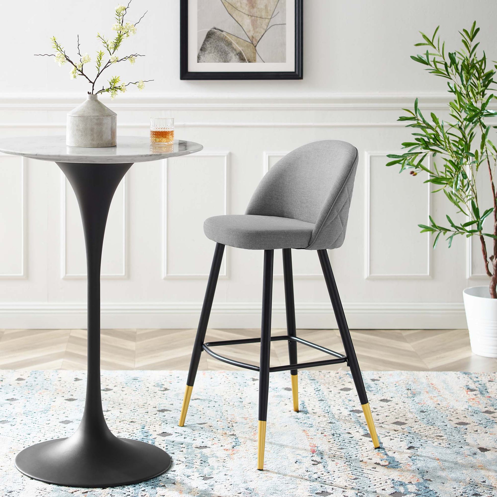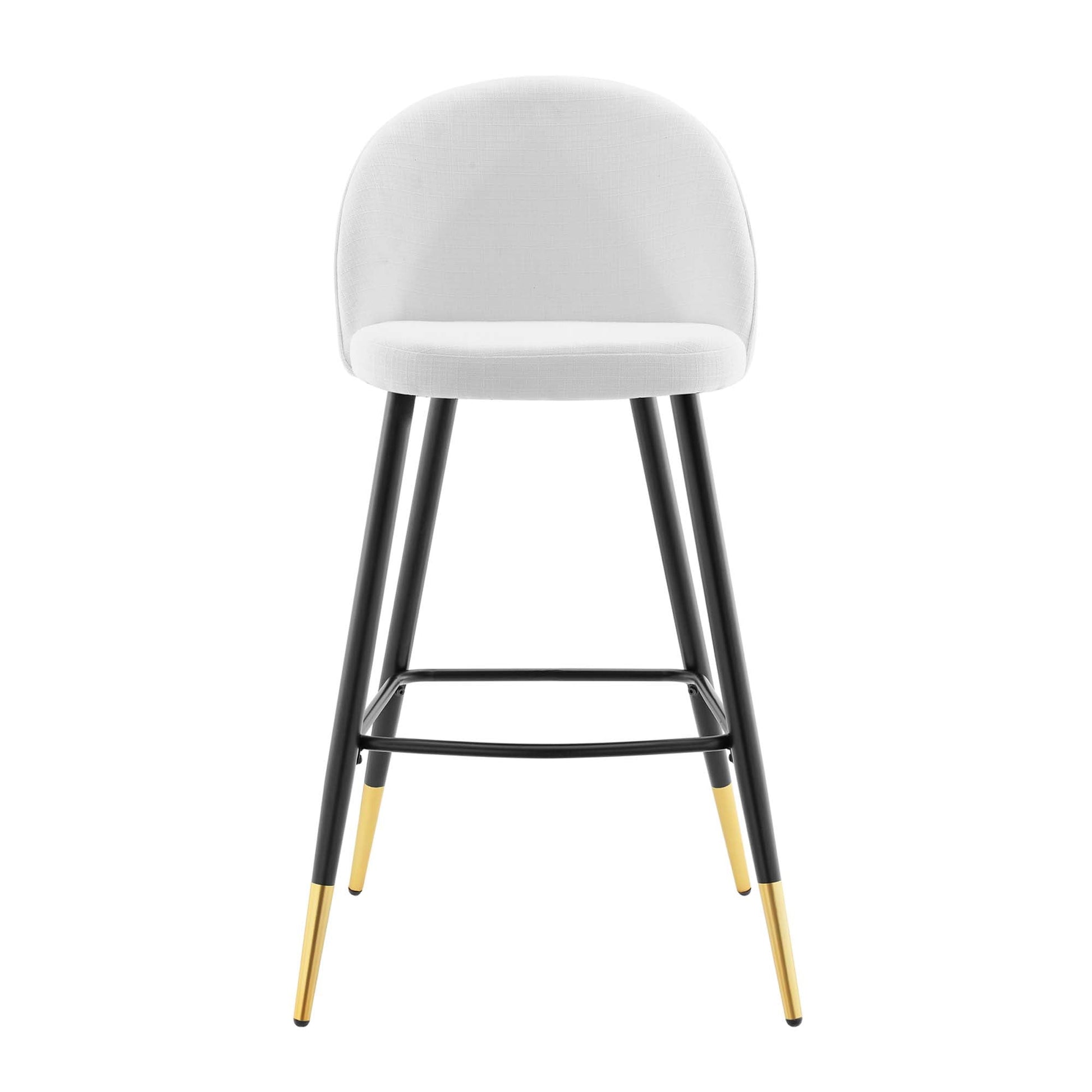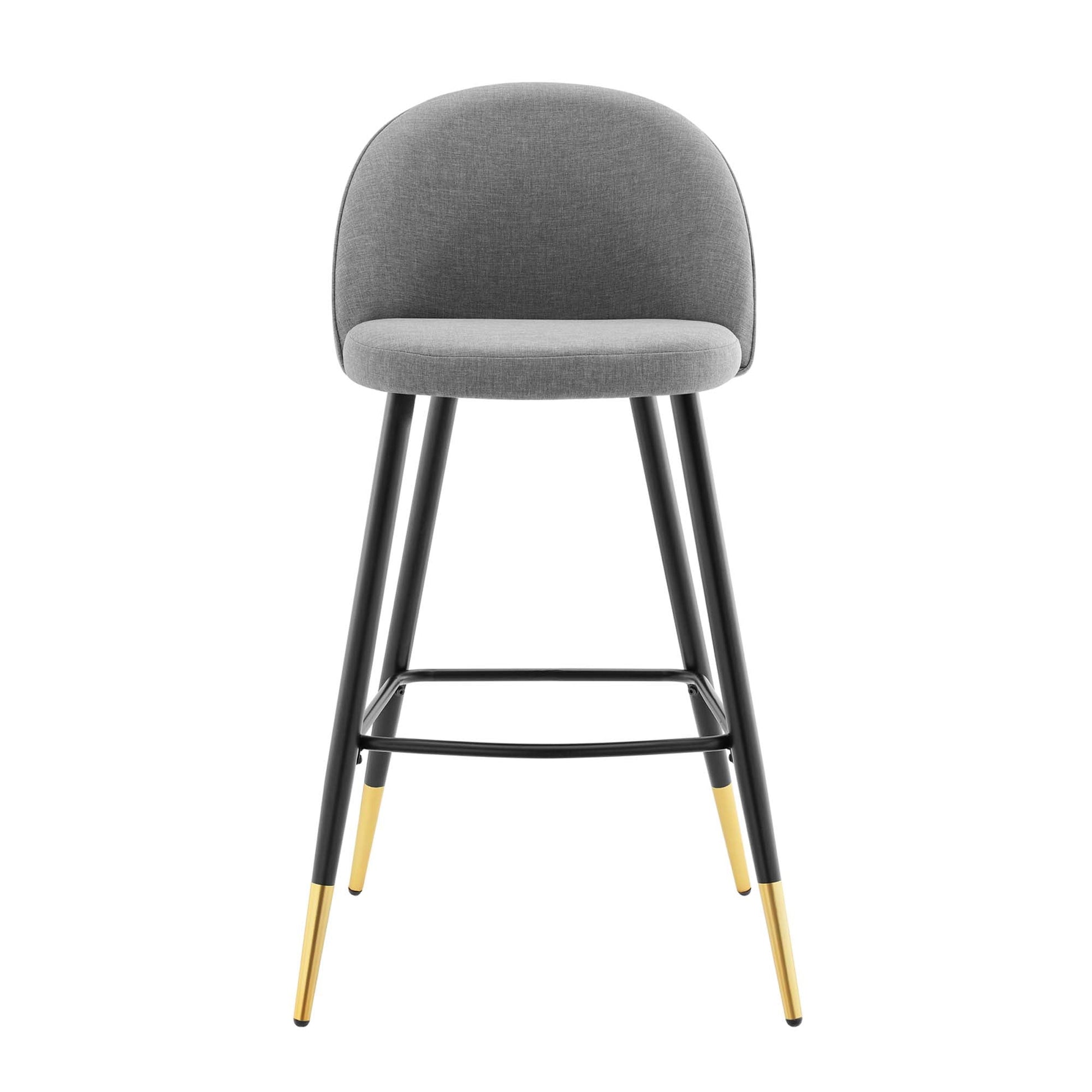 Inspire whimsical dining and functional style with the Cordial Fabric Upholstered Bar Stools- Set of 2. Featuring a rounded silhouette with French piping detail and a diamond lattice pattern along the back, these upholstered bar stools are covered in soft polyester fabric and padded in dense foam to grant supportive comfort while dining or relaxing. A versatile addition to a kitchen counter or bar table, this bar stool set rests atop black metal legs with gold accents and non-marking foot caps. Bar Stool Weight Capacity: 300 lbs.
