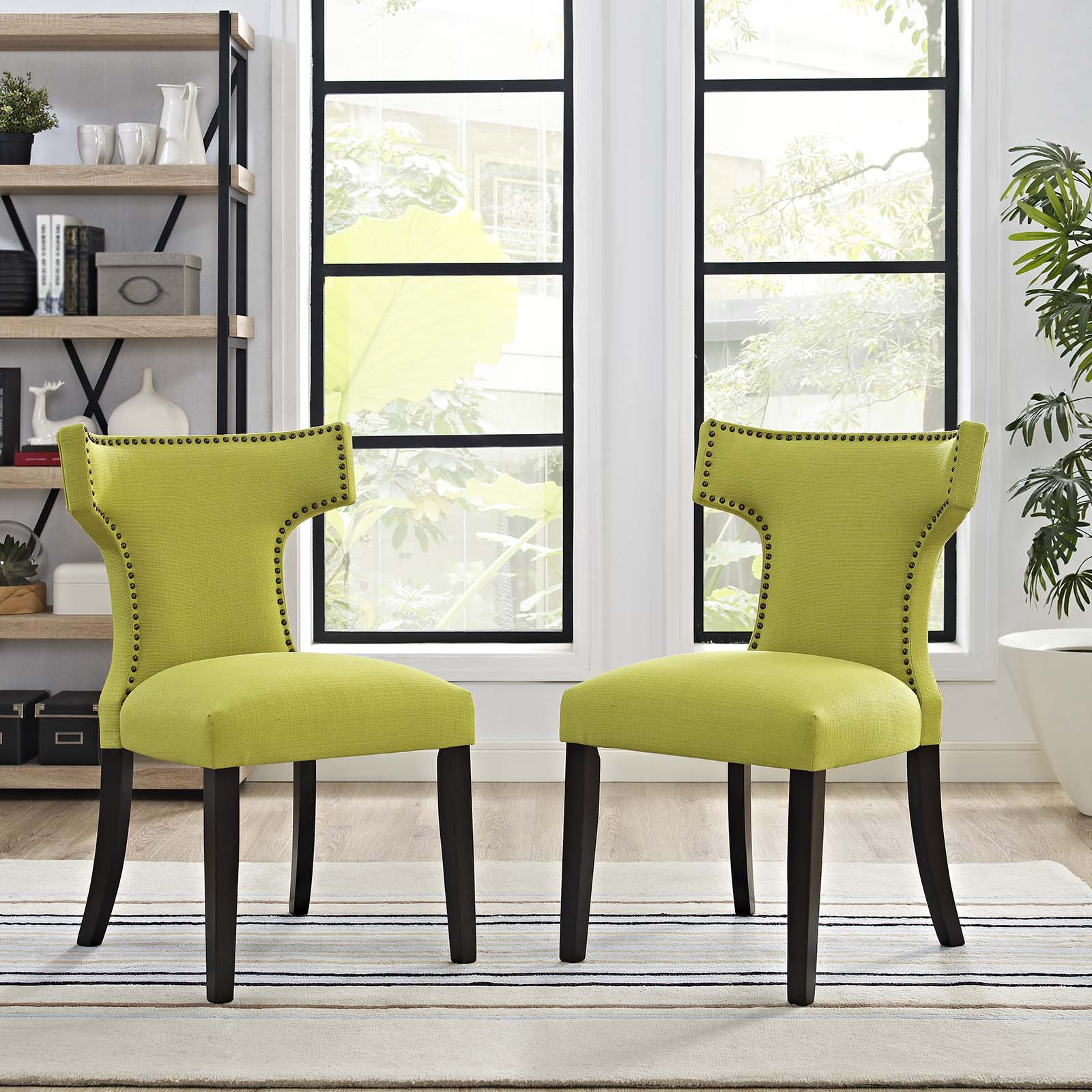 Transform your dining décor with the broadly designed Curve Dining Side Chair. Sweeping lines complement a minimalist shape for a chic look studded with nailhead trim. Curve comes generously padded with dense foam covered in polyester fabric, non-marking foot caps, and delivers just the right touch of finesse with tapered wood legs. Sporting an hourglass shape, Curve works well in a variety of dining room arrangements.