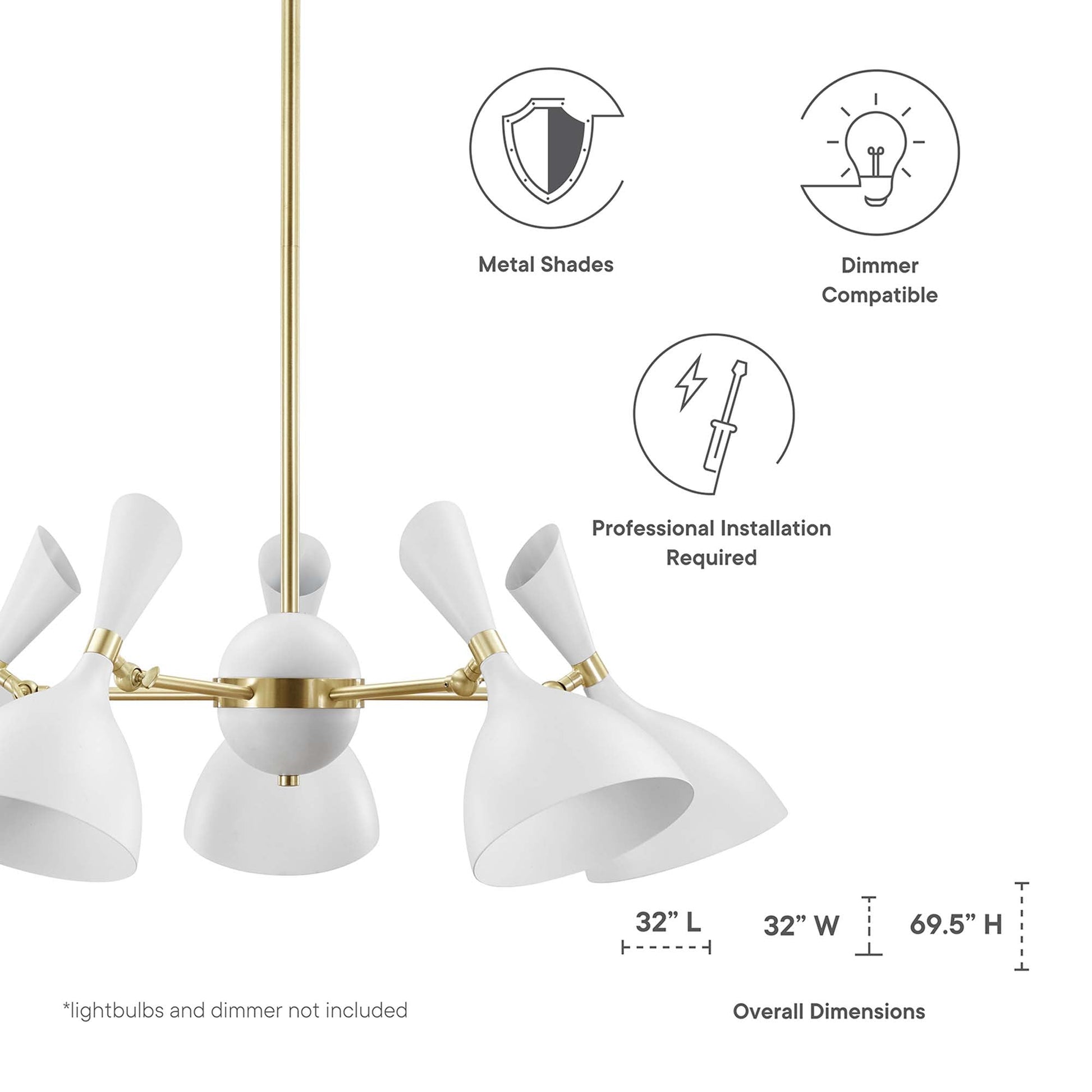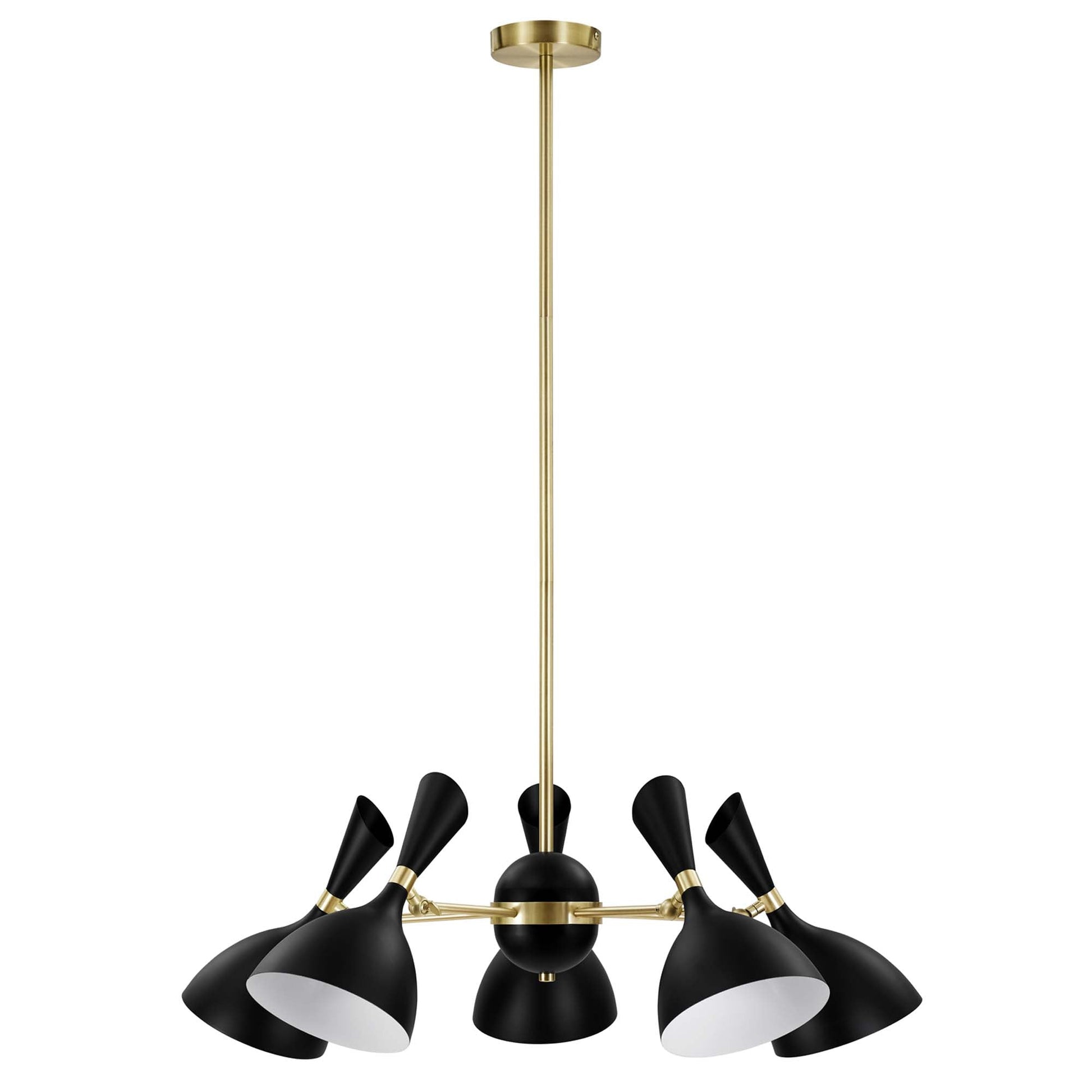 Feel inspired with illuminating bouquets of light in your living room, bedroom, or entryway with the Declare 5-Light Pendant. This modern ceiling light fixture glows with 5 round tapered powder-coated metal shades, enhanced by a narrow satin brass ring, for a bouquet-like silhouette. Sophisticated adjustable shades spark visual interest to this living room chandelier, complementing mid-century modern or eclectic decors. The Declare ceiling pendant light is fully dimmable and height adjustable in your dining room or above a kitchen island. Requires 5 E26 bulbs, 40W max, or LED equivalent (not included). Compatible with dimmer switches (not included). Professional installation required.