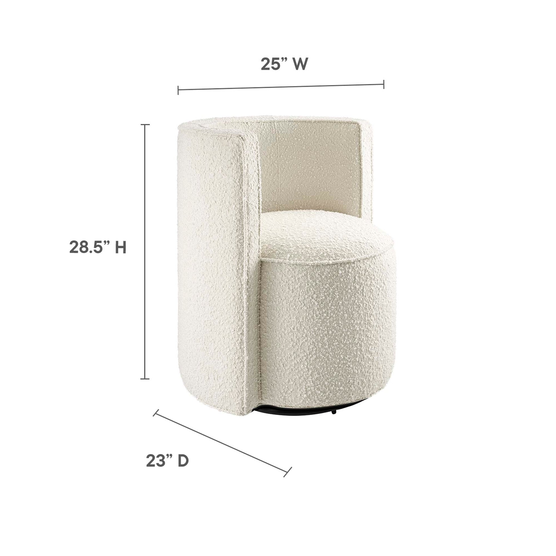 Stunning from every angle, the Della Boucle Swivel Chair brings textured charm and tailored elegance to your living room, entryway, bedroom, office, or other seating area. This boucle accent chair makes a statement with modern lines, French piping trim, and subtle channel tufting along the backrest. Featuring dense foam padding, this swivel chair is upholstered in beautifully textured boucle fabric offering a premium seating experience. This accent chair rests on a matte black iron base that features non-marking foot caps to protect your flooring and swivels 360º to survey your surroundings. Weight Capacity: 330 lbs.