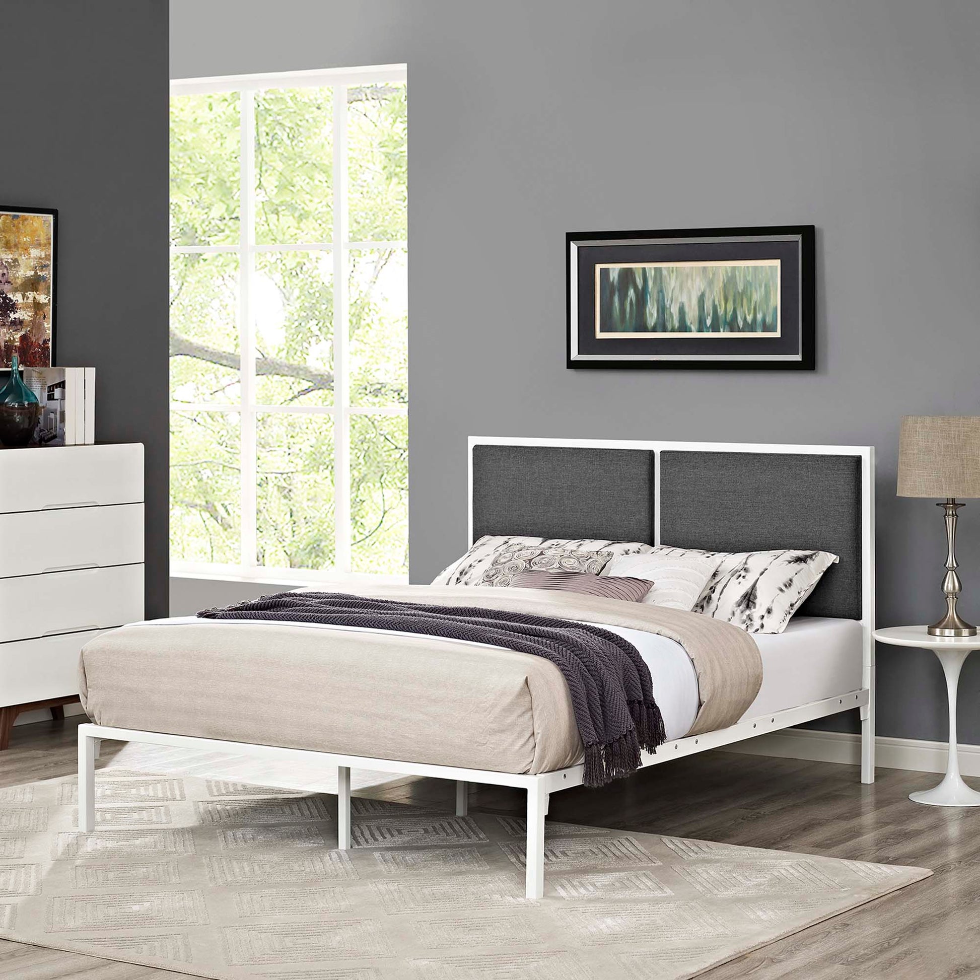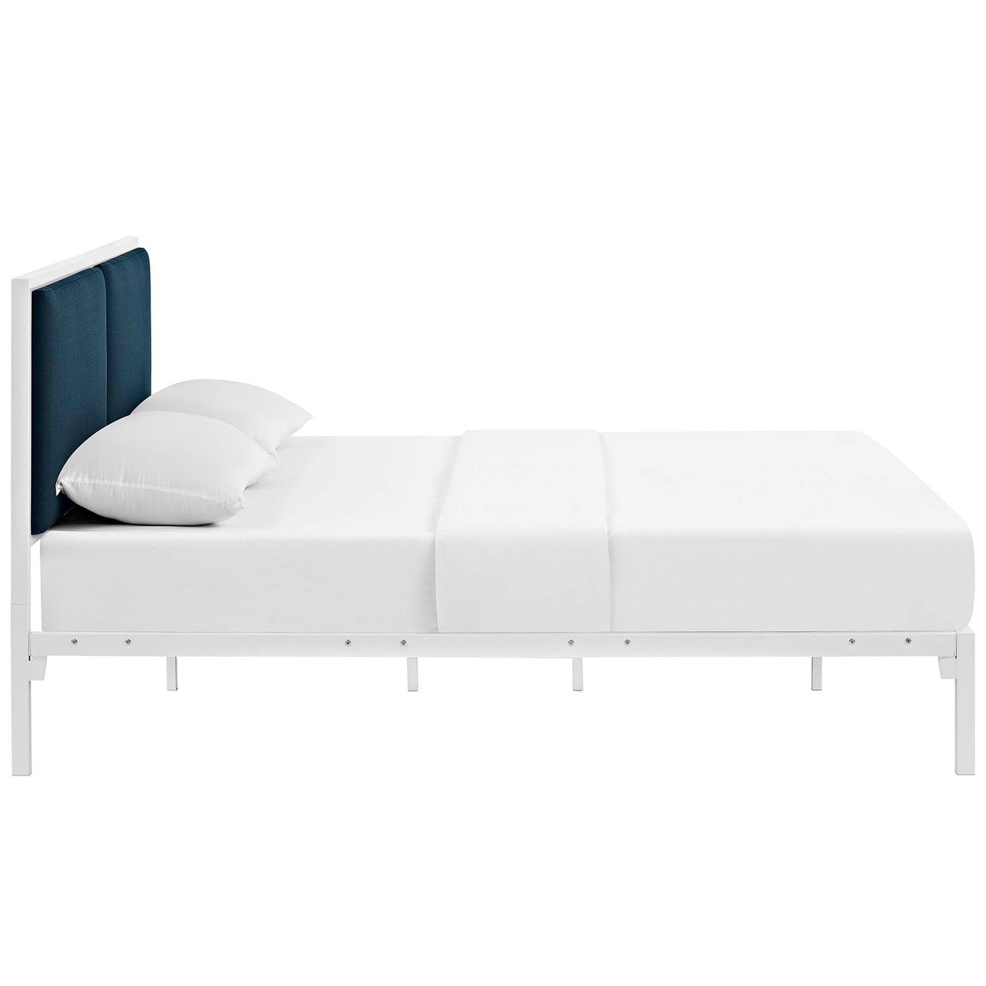 Sleep soundly with the Della Platform Bed. With a touch of charm and delight, Della’s paired headboard design imparts a refreshing look while a reinforced steel frame admirably supports from beneath. Complete with a rod system that eliminates the need for a box spring, Della serves the various mattress types on the market such as memory foam, spring, latex and hybrid, and sustains a weight capacity of up to 1300lbs. Della’s paired headboard comes finely upholstered in fabric with a base that features non-marking foot caps. Durable and sturdy, Della is a bedroom anchor fitting for the modern home. Mattress Not Included.