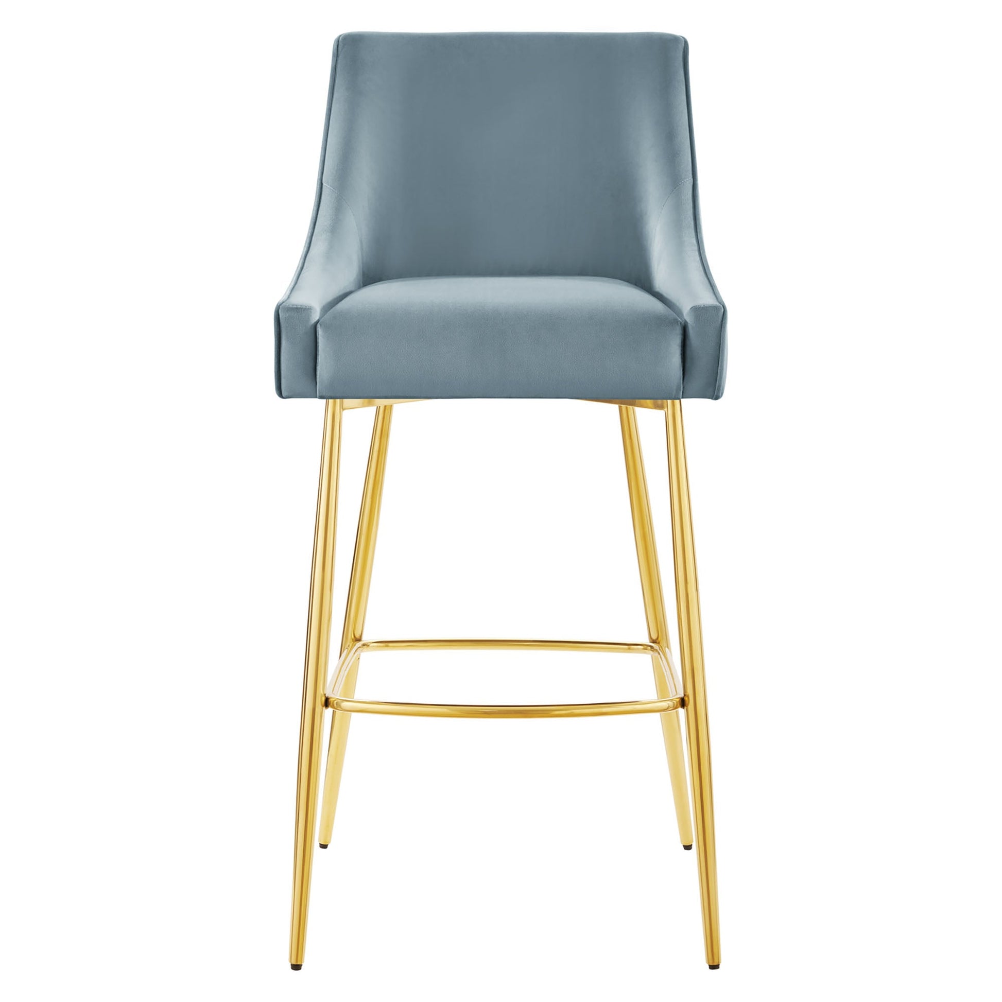 The dashingly handsome Discern Performance Velvet Bar Stool brings substance and charisma into your dining space. Standing confidently on brushed gold stainless steel legs braced by a matching stretcher, the Discern Bar Stool enthralls with subtle details and a stylish retro modern vibe that fits well with mid-century modern decor. Stain-resistant performance velvet upholstery envelopes the seat and backrest of this bar-height stool, perfect for a pub table or kitchen bar. The curved armrest and precise tailoring signal an attention to detail that makes this velvet bar stool irresistible. The Discern Bar Stool features protective foot pads, a decorative handle, and dense foam padding.