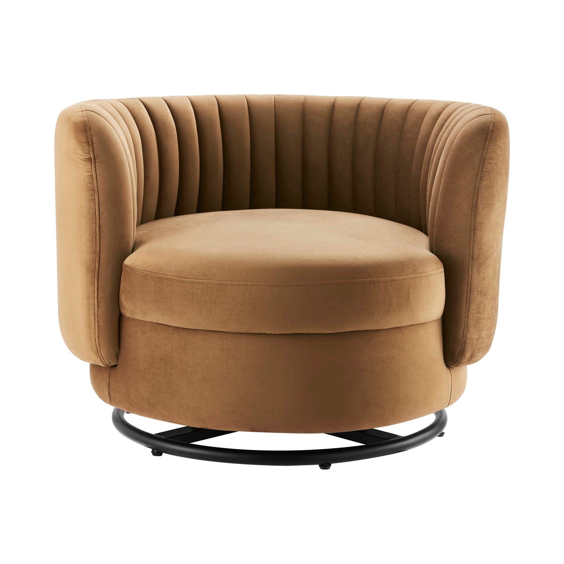 Relax amidst luxury with the Embrace Channel Tufted Performance Velvet Swivel Chair. Adorned with vertical channel tufting and a beautiful curved silhouette, this velvet accent chair brings vintage modern luxury and glam deco style to a living room, bedroom, entryway, home office, or seating area. This upholstered chair is covered in soft, stain-resistant performance velvet and is padded with dense foam and a spring support system to create a premium seating experience. Resting on a black metal swivel base, this swivel chair effortlessly maneuvers to suit the needs of the moment. Weight Capacity: 300 lbs.