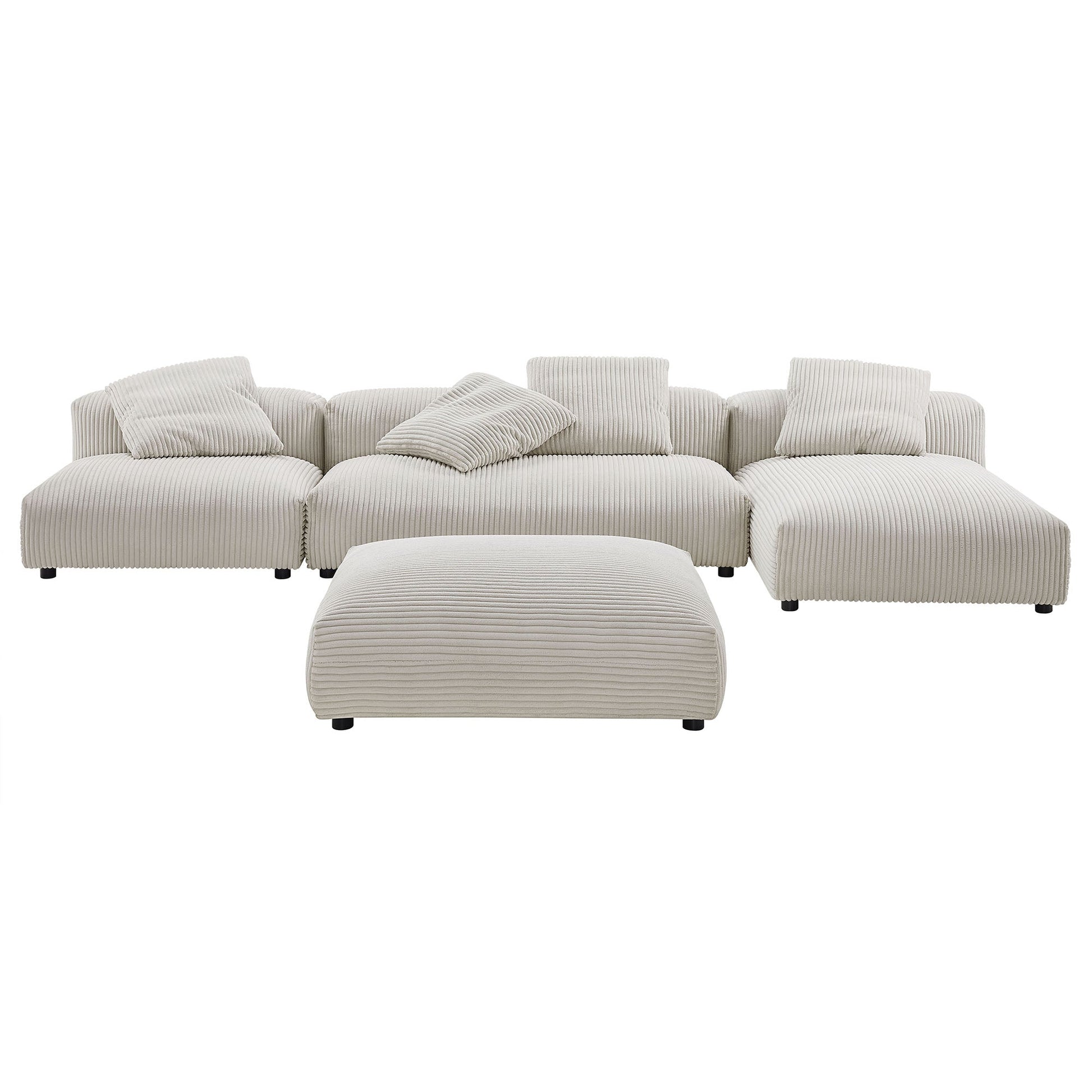 Revel in ultimate comfort and modern style with the Solace Modular Corduroy Sectional Sofa. This oversized corduroy sectional sofa is perfect for any living room, offering endless flexibility. Its modular furniture design allows you to change the arrangement to suit the needs of the moment or expand your seating by adding more pieces in the future. Featuring a sturdy frame, dense foam padding, and a sinuous spring support system, the Solace Large Sectional Sofa grants a premium seating experience. The comfy corduroy upholstery adds a cozy, casual vibe, making this deep sectional sofa a perfect addition to any living space or lounge area. Equipped with non-marking plastic glides and complementing accent pillows, this 4-piece sectional sofa set is both stylish and practical. With no assembly required, you can enjoy immediate relaxation with this L-shaped modular sectional sofa. Set Includes: 1 Armless Chair, 1 Armless Loveseat, 1 Armless Chaise, 1 Ottoman