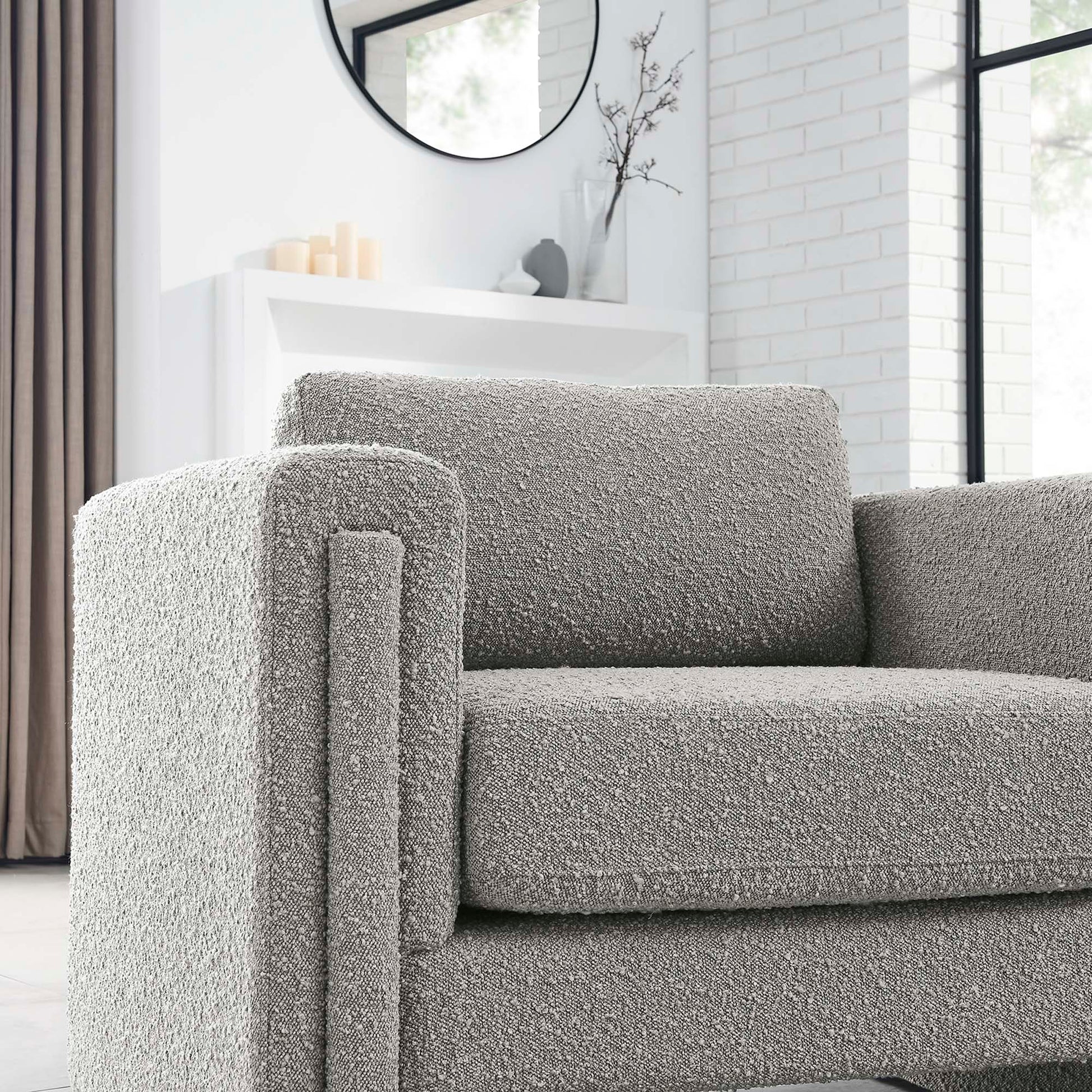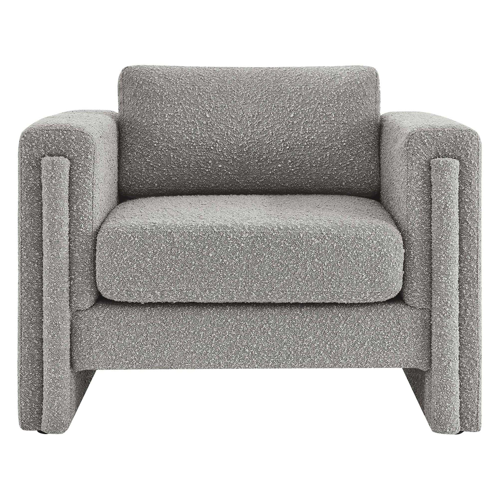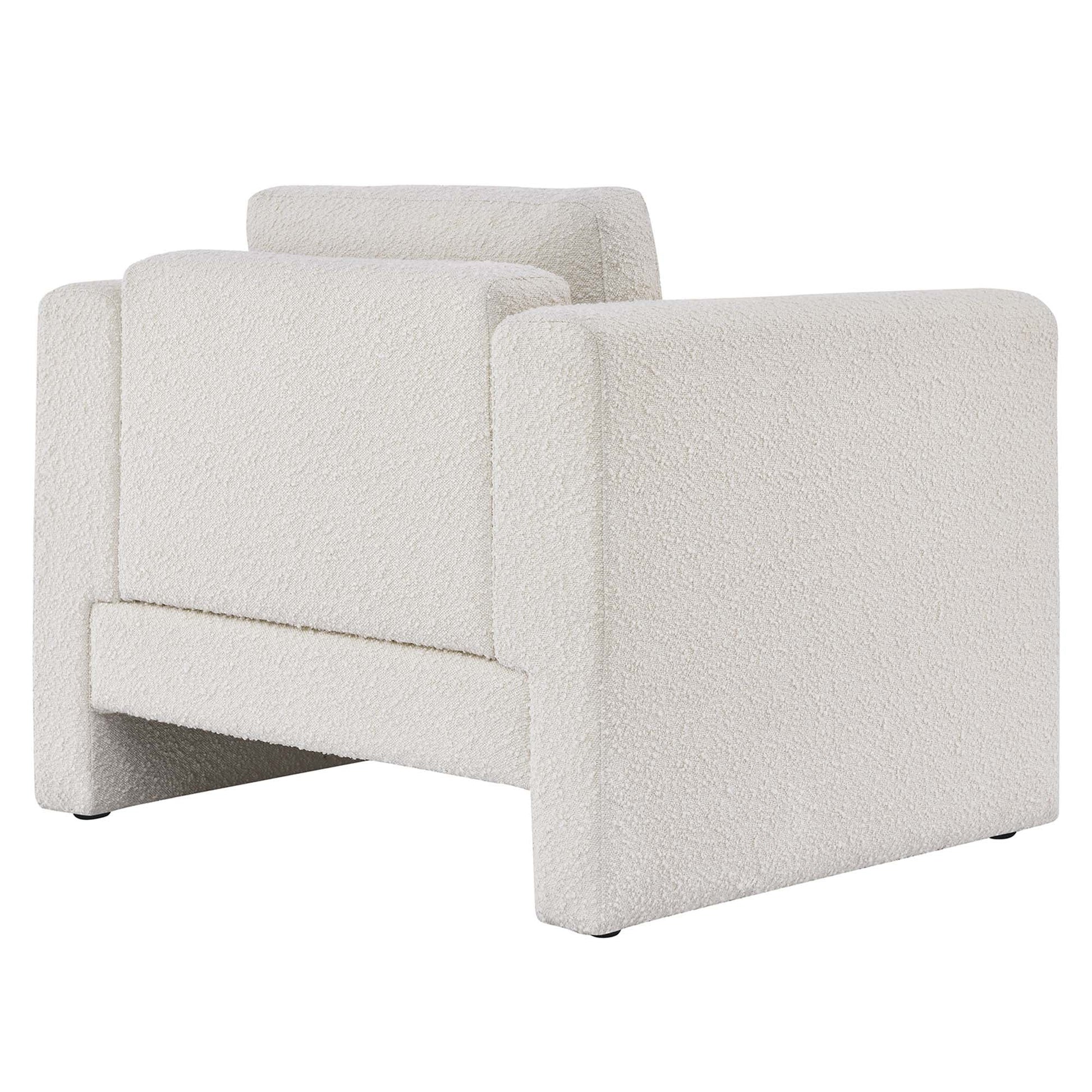Indulge in the epitome of modern luxury and sophistication with the Visible Boucle Accent Armchair. Crafted with a sturdy wood and plywood frame, this armchair exudes modern elegance with its sleek lines and tailored silhouette. The adjustable non-marking foot pads protect your flooring while providing sturdy stability. Sink into cozy comfort with the dense foam padding and durable boucle fabric upholstery with a charming nubby texture. The cushions and cushion covers are removable to make cleaning a breeze. Enjoy unmatched support with the pocket coil springs that offer a premium seating experience. Assembly is required with easy to follow assembly instructions. Weight Capacity: 330 lbs.
