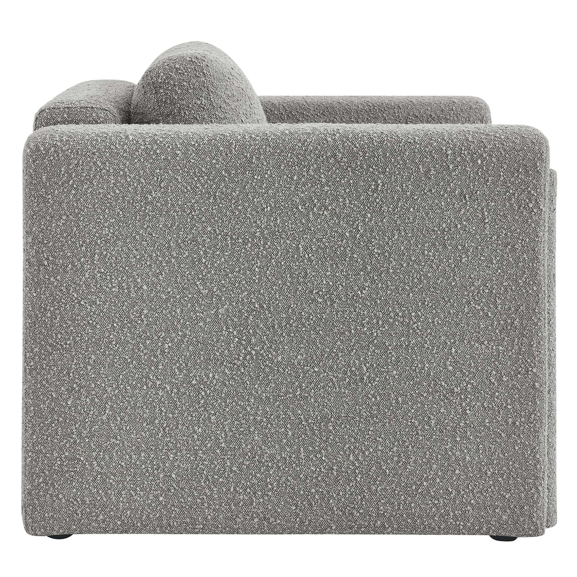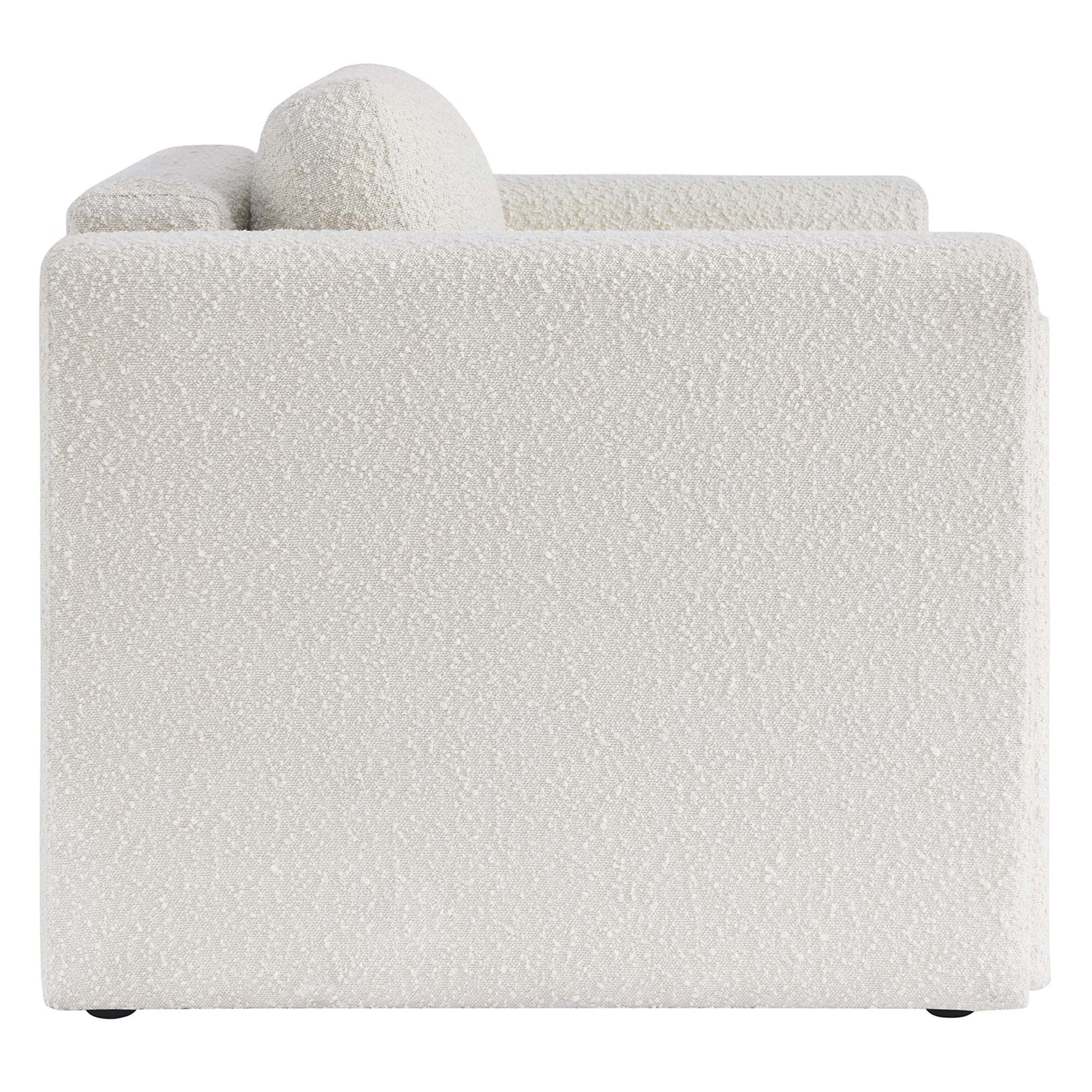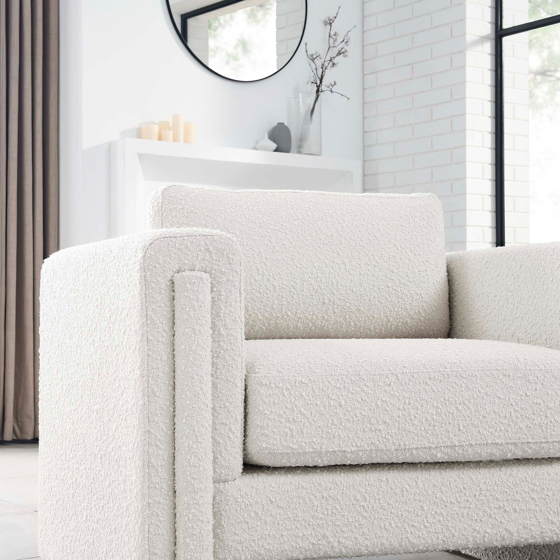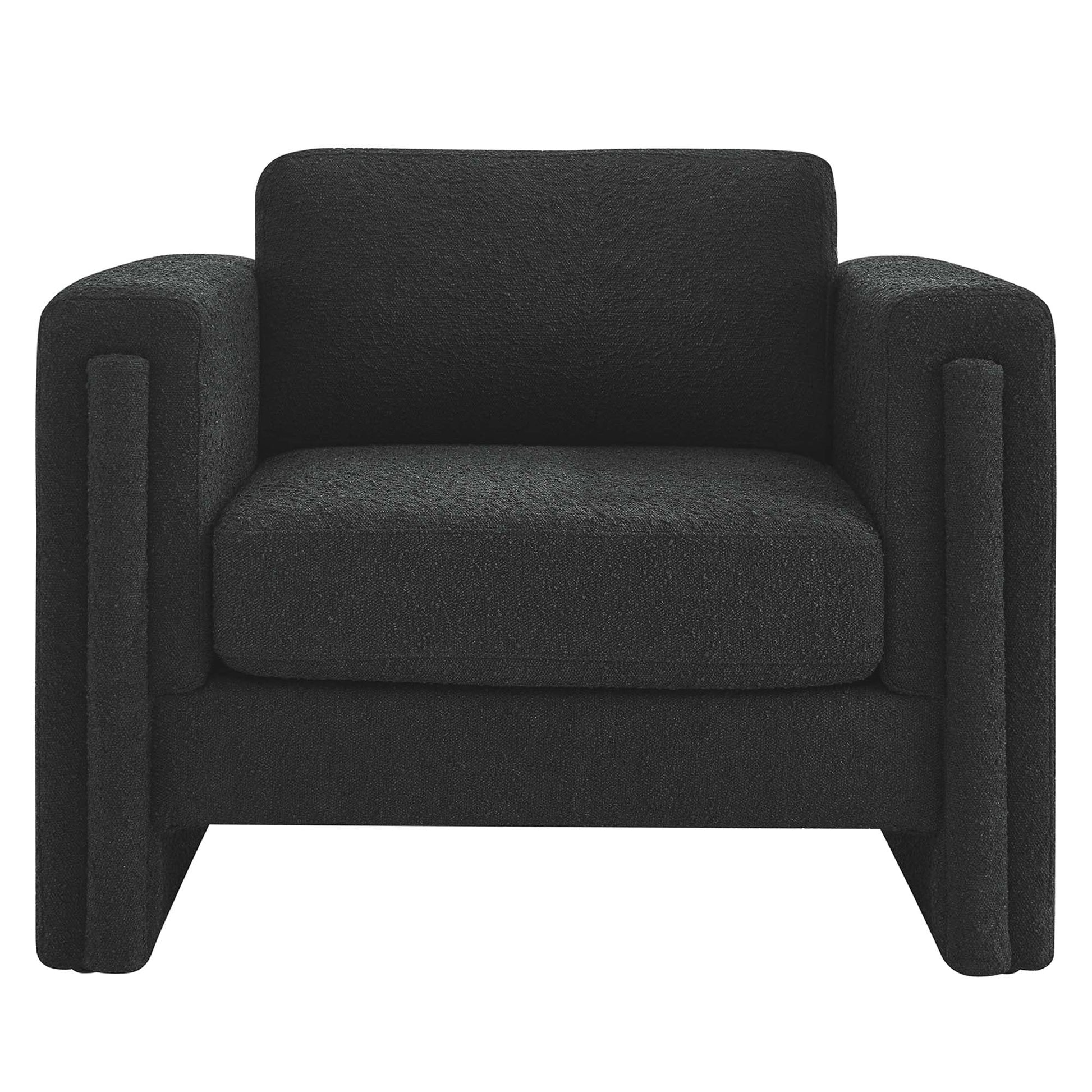 Indulge in the epitome of modern luxury and sophistication with the Visible Boucle Accent Armchair. Crafted with a sturdy wood and plywood frame, this armchair exudes modern elegance with its sleek lines and tailored silhouette. The adjustable non-marking foot pads protect your flooring while providing sturdy stability. Sink into cozy comfort with the dense foam padding and durable boucle fabric upholstery with a charming nubby texture. The cushions and cushion covers are removable to make cleaning a breeze. Enjoy unmatched support with the pocket coil springs that offer a premium seating experience. Assembly is required with easy to follow assembly instructions. Weight Capacity: 330 lbs.
