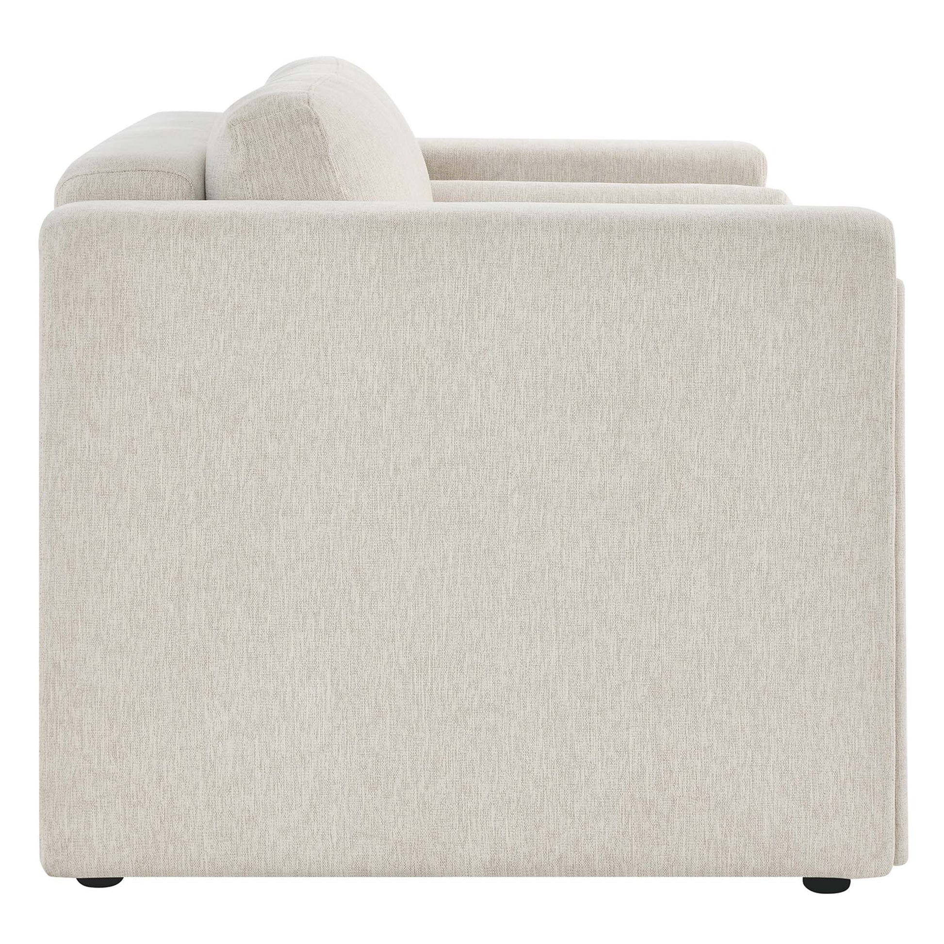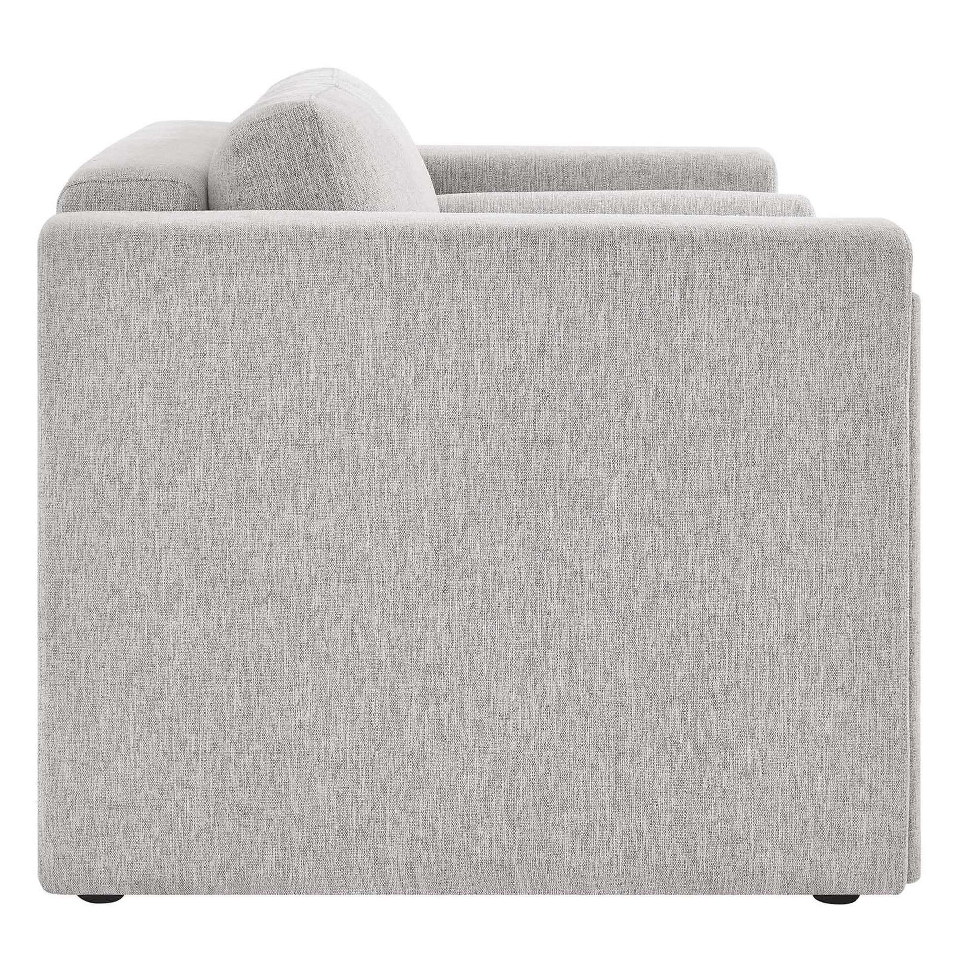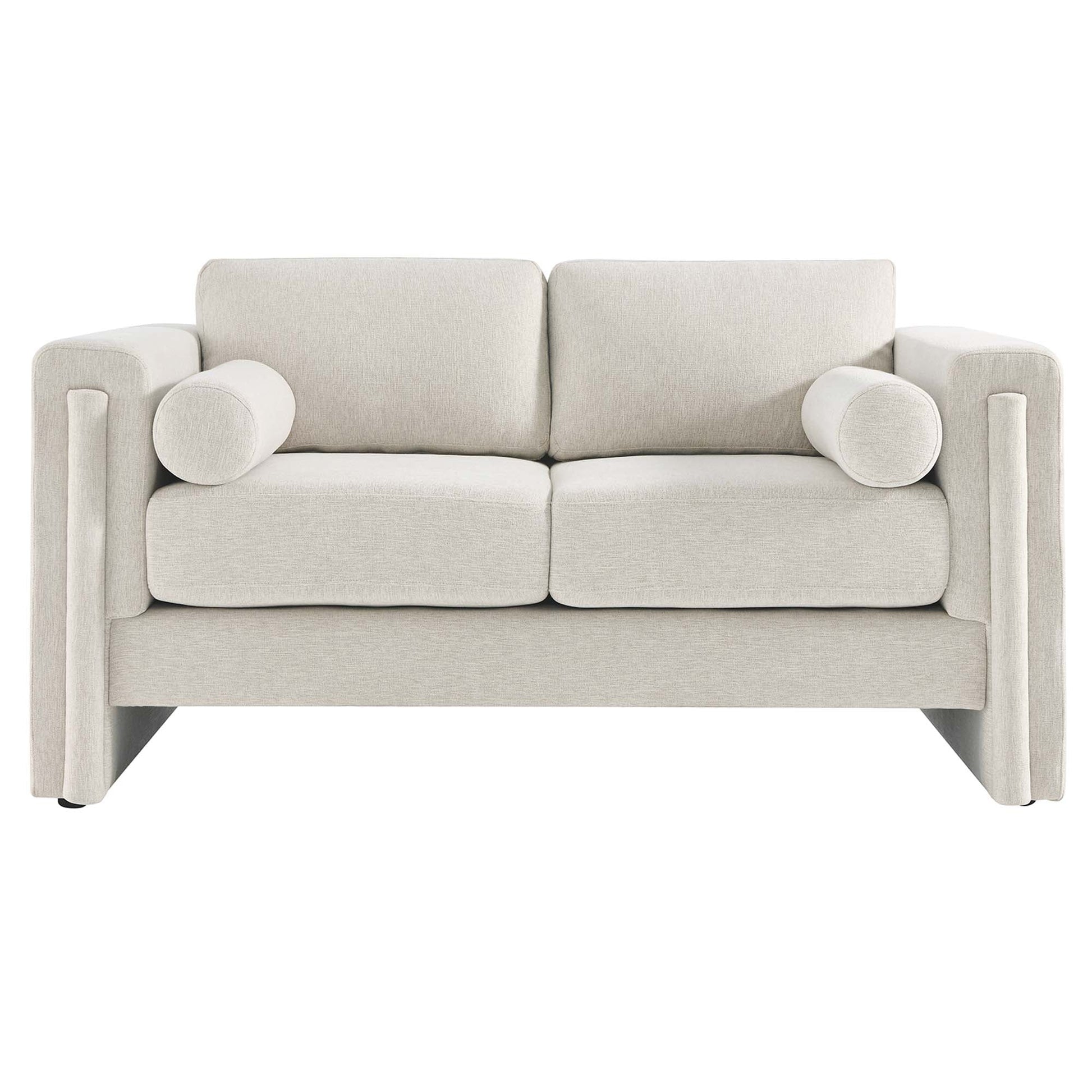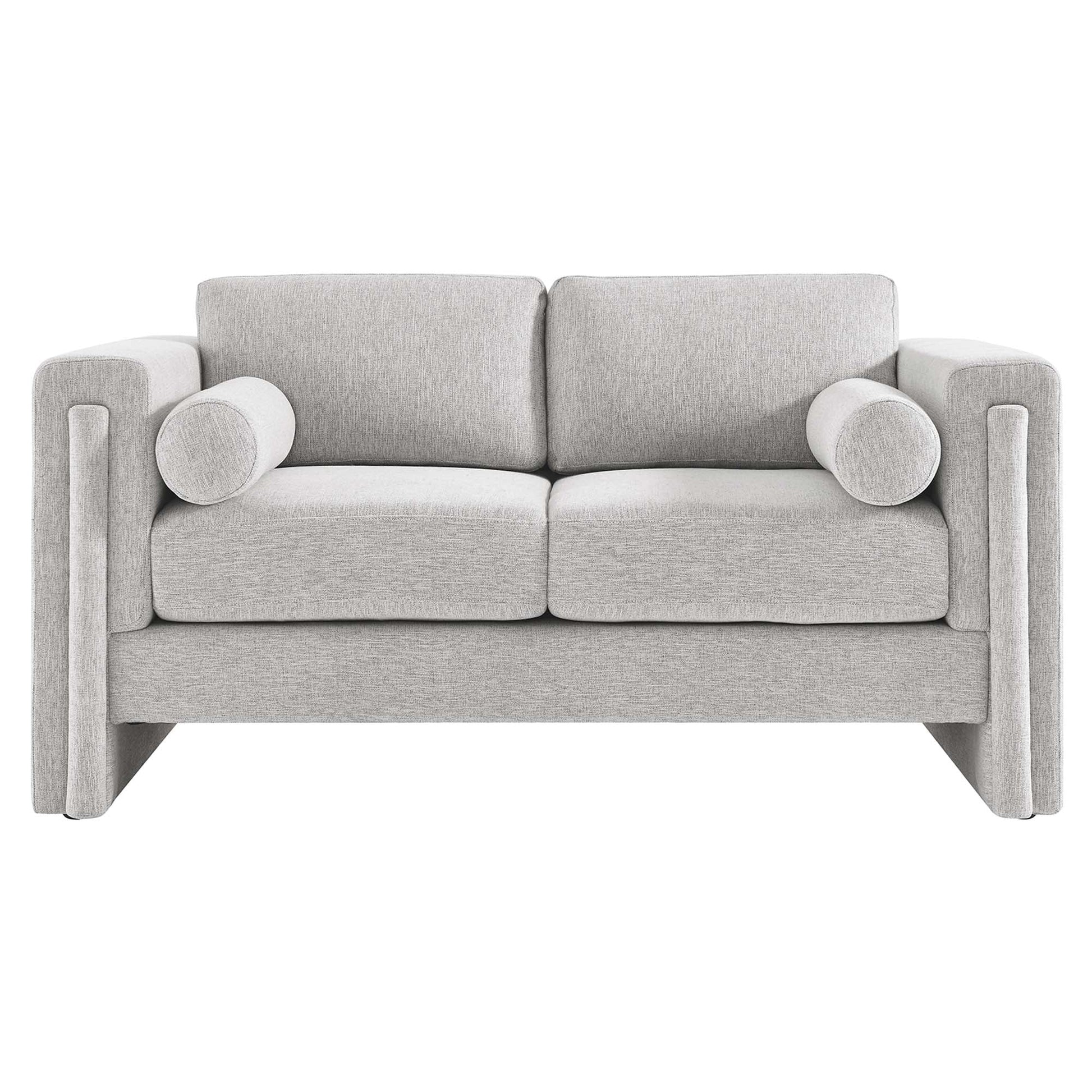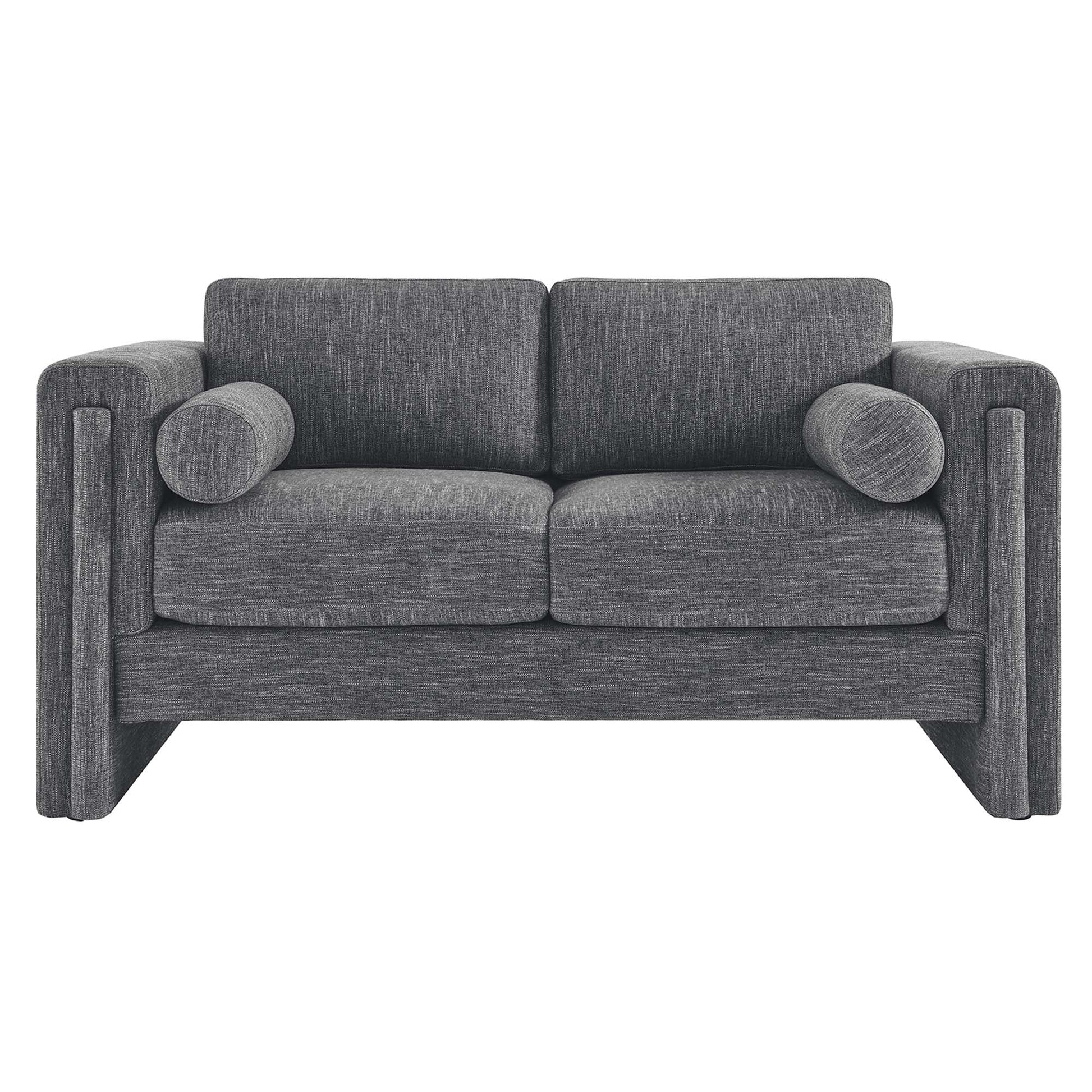 Indulge in the epitome of modern luxury and sophistication with the Visible Fabric Upholstered Loveseat. Crafted with a sturdy wood and plywood frame, this loveseat exudes modern elegance with its sleek lines, tailored silhouette, and bolster pillows. The adjustable non-marking foot pads protect your flooring while providing sturdy stability. Sink into cozy comfort with the dense foam padding, individualized pocket spring support, and stain-resistant heathered weave polyester fabric upholstery on this two-seater sofa. The cushions and cushion covers are zippered and removable. Enjoy unmatched support with the pocket coil springs that offer a premium seating experience. Assembly is required with easy to follow assembly instructions. Weight Capacity: 660 lbs.