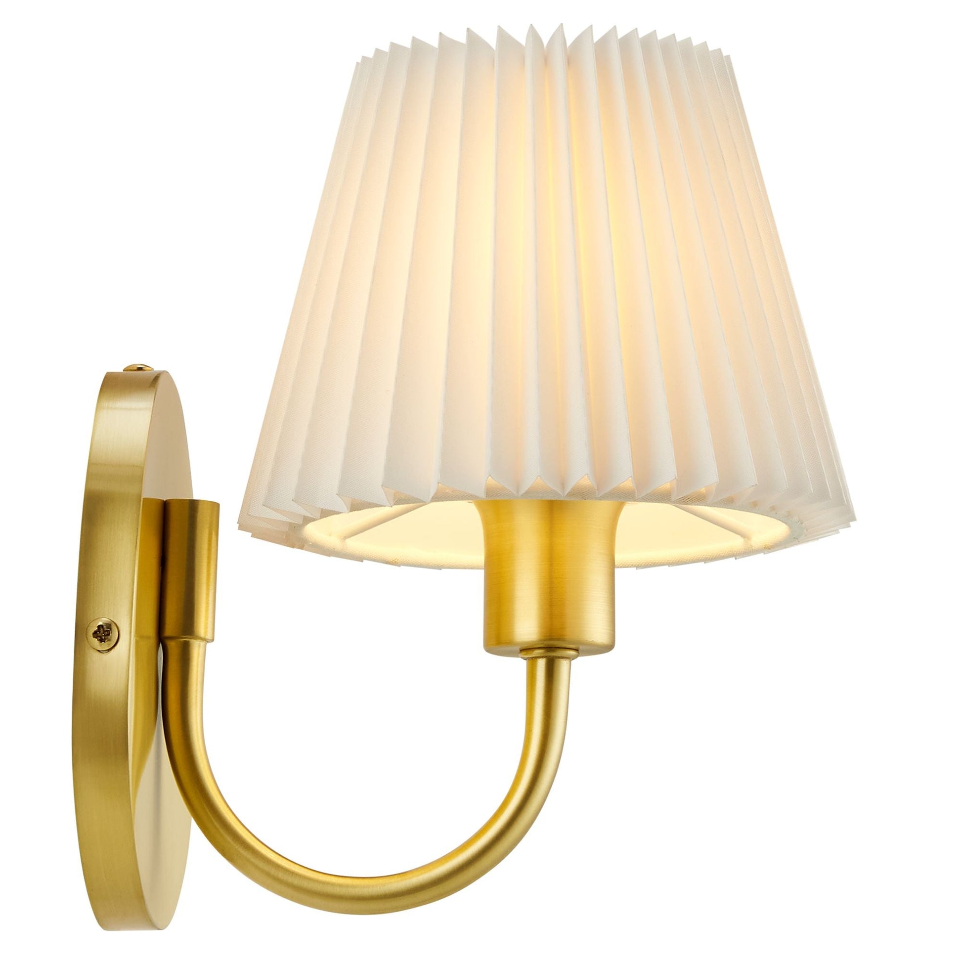 Merging contemporary design with timeless elegance, the Wave Wall Sconce features a graceful U-shaped metal arm that evokes a sense of balance and symmetry. This fixed arm, crafted from durable metal, upholds a pleated fabric shade that diffuses light into a warm, inviting glow. This wall sconce is ideal as a bedside reading lamp or as a refined accent light in a modern living room. The sconce's hardwired construction ensures a seamless integration into your space, complemented by a round metal backplate that adds a sleek touch to the overall design. Embrace both form and function with this single sconce, a modern wall light that makes a striking statement. This wall-mounted lamp is ETL listed and approved and requires a single E12 25W bulb (not included). Assembly required.