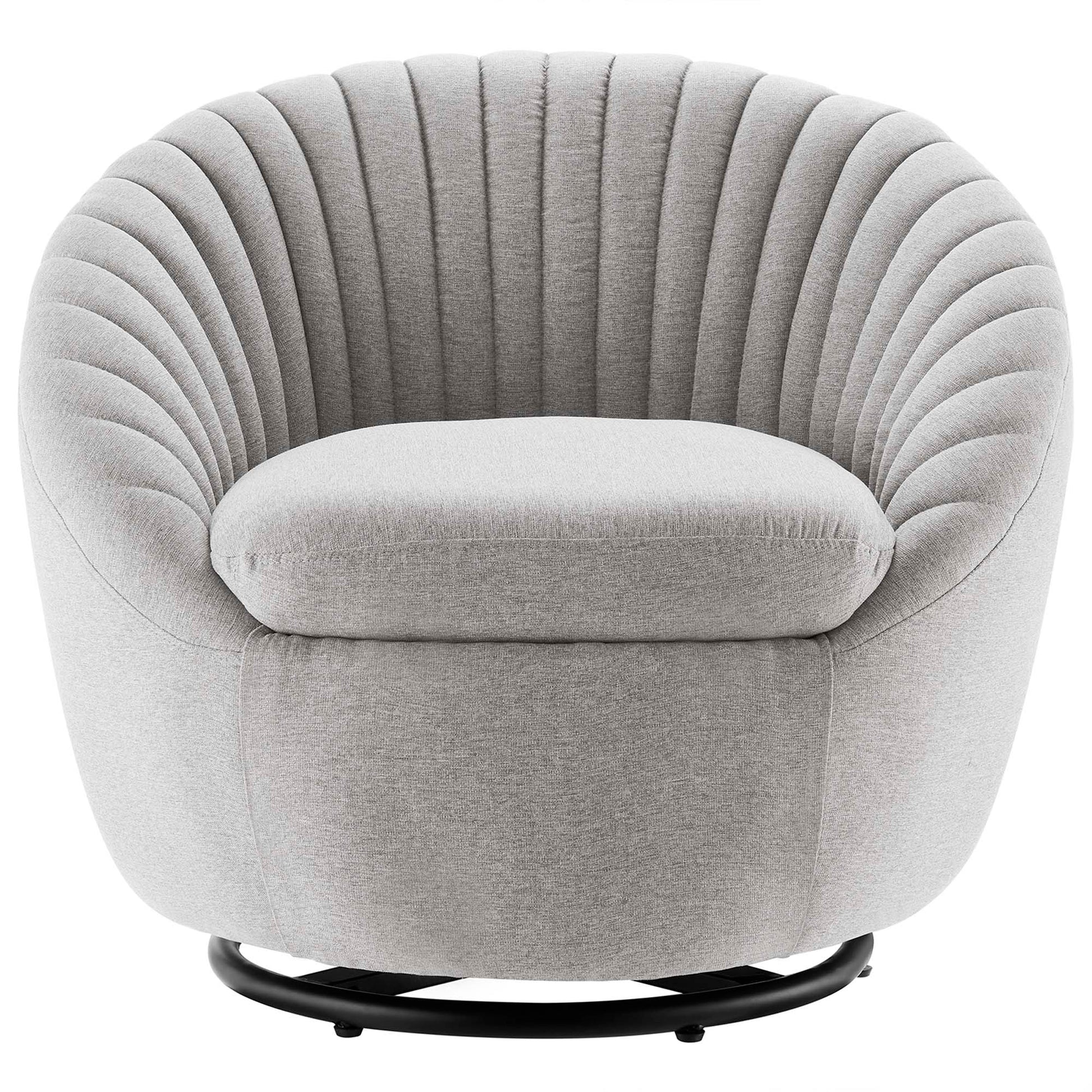 Spin around and take in your surroundings with the Whirr Tufted Fabric Swivel Chair. Perfect for the living room, entryway, bedroom, office, or other seating area, this accent chair features vertical channel tufting, soft tactiles, and a beautifully curved silhouette. Covered in soft polyester fabric, this upholstered chair is a premium seating experience complete with dense foam padding and a spring support system. This swivel chair rests on a black metal swivel base so you can effortlessly maneuver to your position of choice. Weight Capacity: 300 lbs.