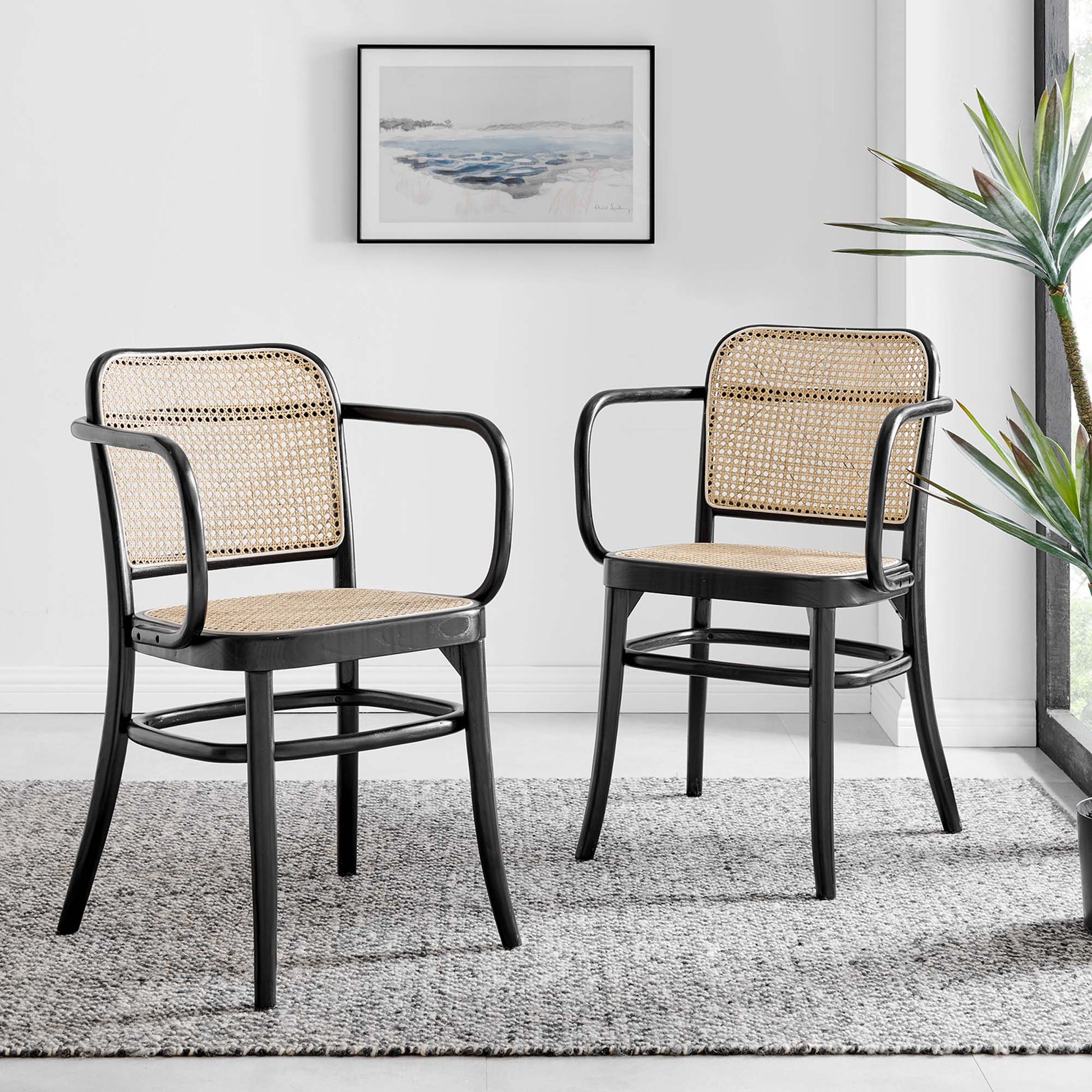 Blending rustic farmhouse charm and coastal serenity in your dining space with the Winona Dining Chair Set. Featuring a woven rattan cane backrest and seat, this dining chair set instills vintage modernity around your dining table or as an accent chair set in your living space. This dining armchair set is complete with a durable elm wood frame with rounded edges and armrests. Includes non-marking foot caps. Weight Capacity: 330 lbs.