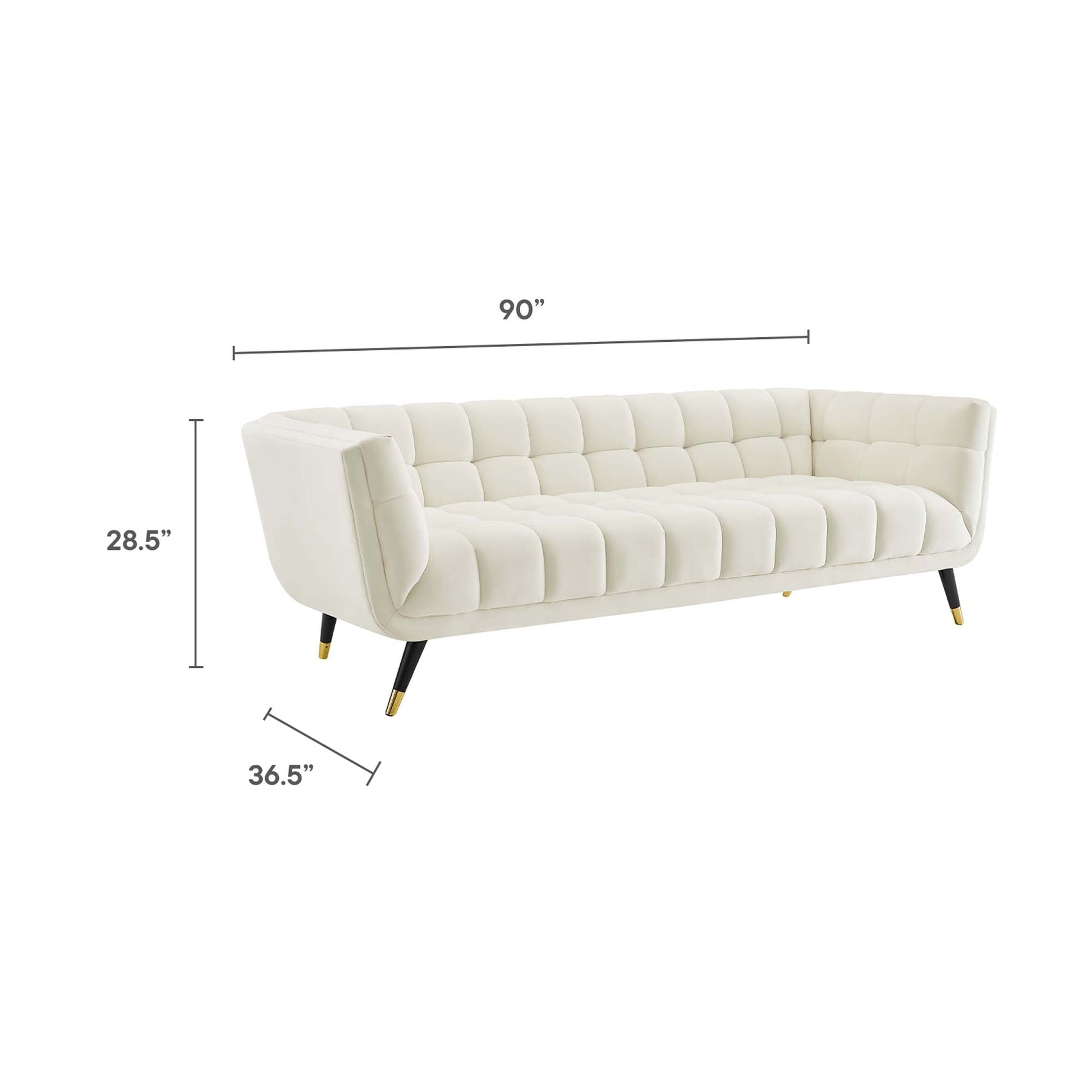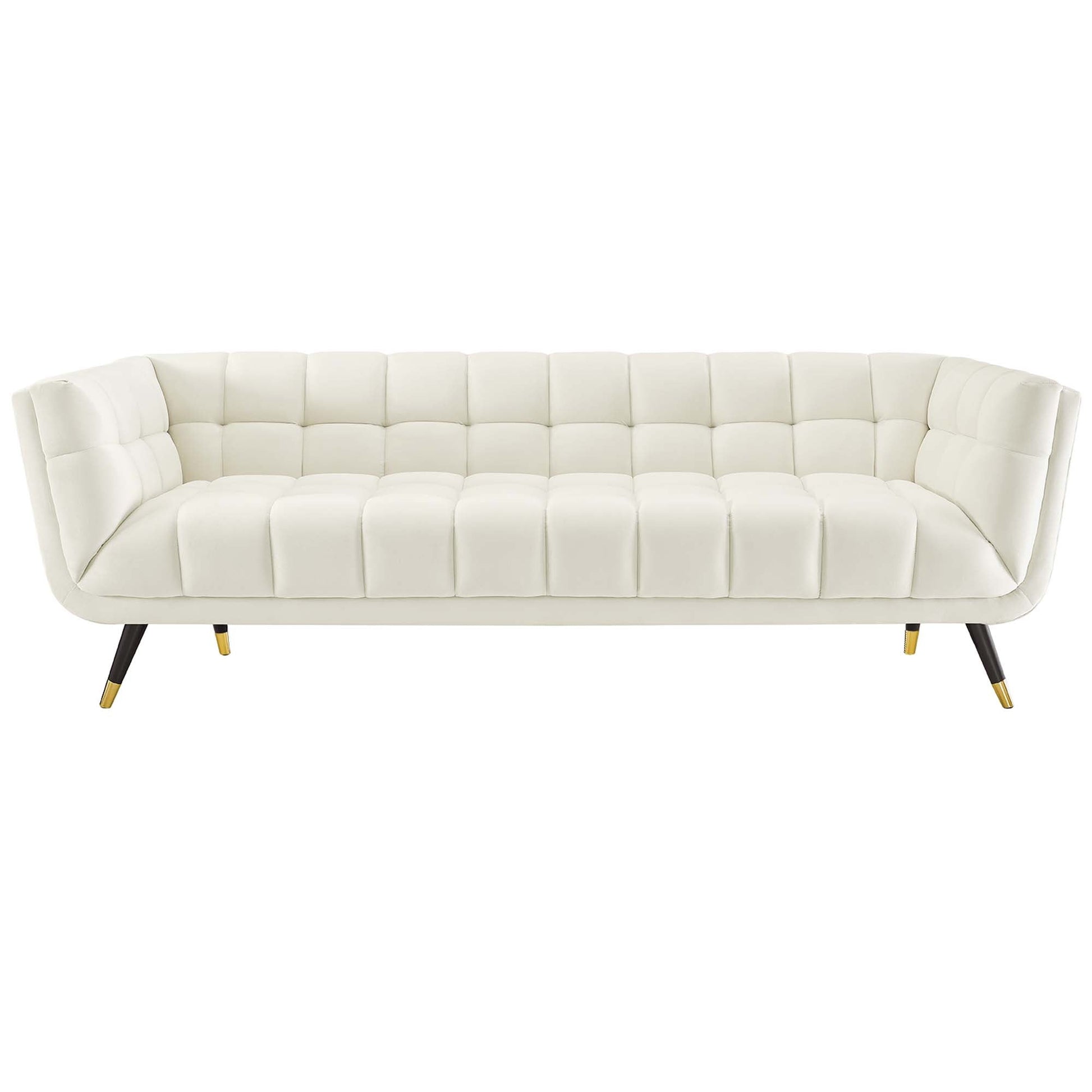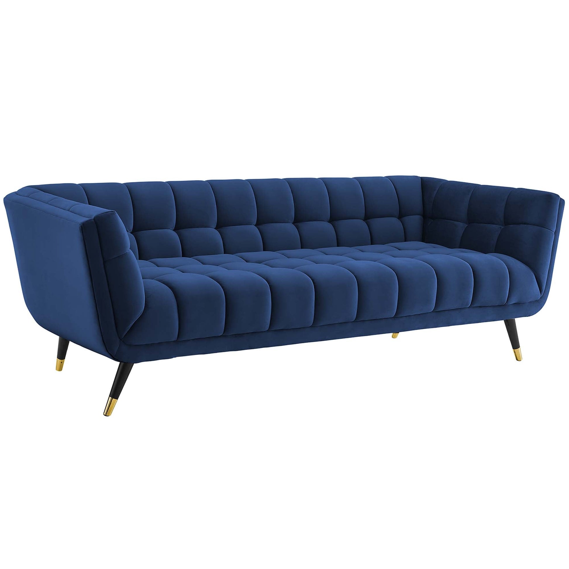 Embolden your living room décor with Adept Performance Velvet Sofa. Featuring a blend of chic, contemporary, and mid-century modern design, Adept's broad profile, deep seating, generous tufting, stain-resistant performance velvet polyester upholstery, flared armrests, and subtle metal accents imbue rich detail and chic sophistication. Enjoy the plush comfort of the Adept sofa while lounging with friends and family. Resting atop a splayed black birchwood frame with gold metal end caps, Adept is a striking addition to the home or apartment. Sofa Weight Capacity: 1322 lbs.