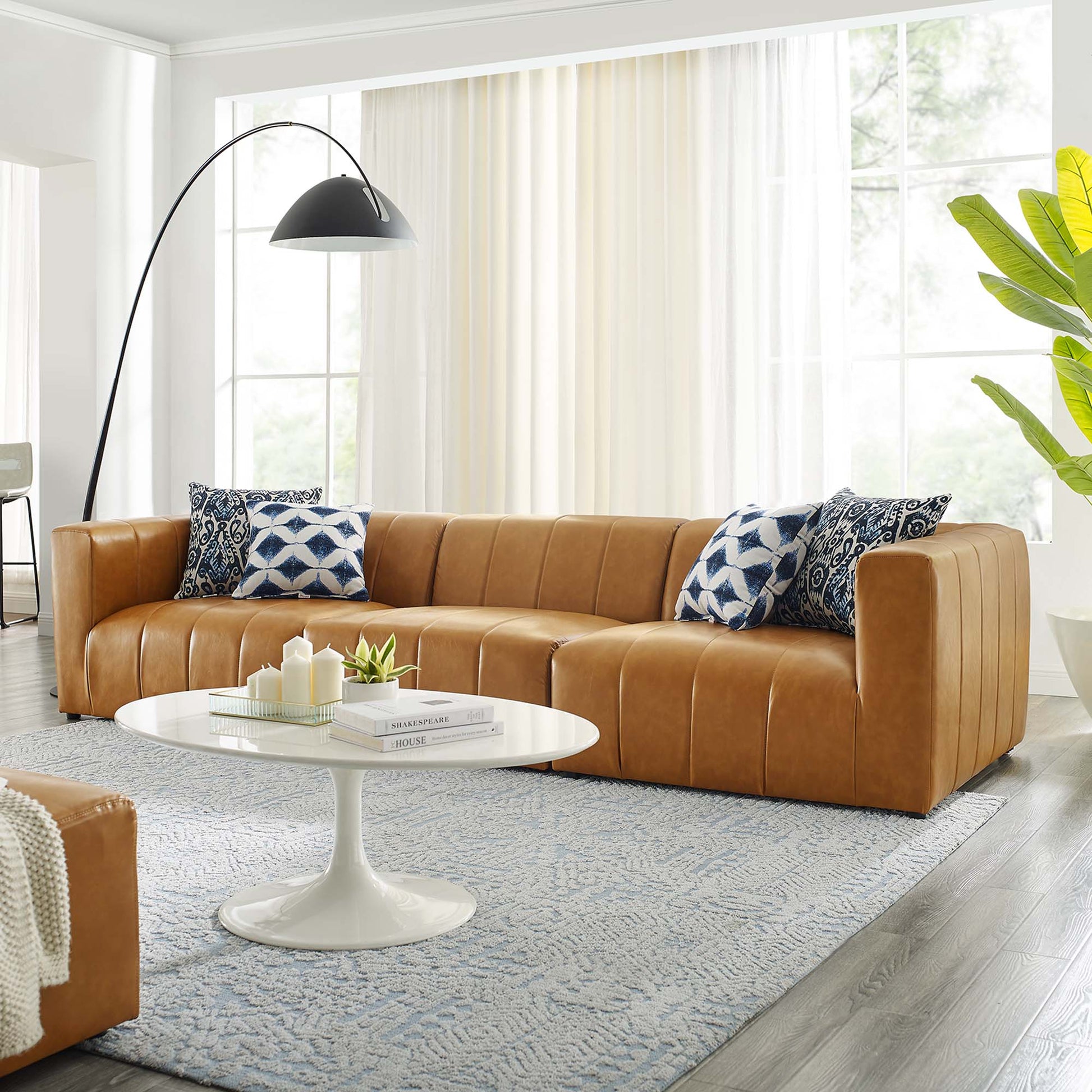 Indulge in comfort and relaxation by creating a custom living room and lounge area with the Bartlett Vegan Leather Sofa. Featuring subtle channel tufting, rounded corners, and vegan leather upholstery, this three-seater sofa brings retro modern style and contemporary allure to your living space. Dense foam padding and a pocket coil spring system in the cushions offer a luxe seating experience with premium support and comfort. With a sturdy frame crafted from solid wood and plywood, this living room sofa features modular connectors to keep each sectional sofa piece secure and non-marking foot caps to protect flooring. Each Piece Weight Capacity: 331 lbs.