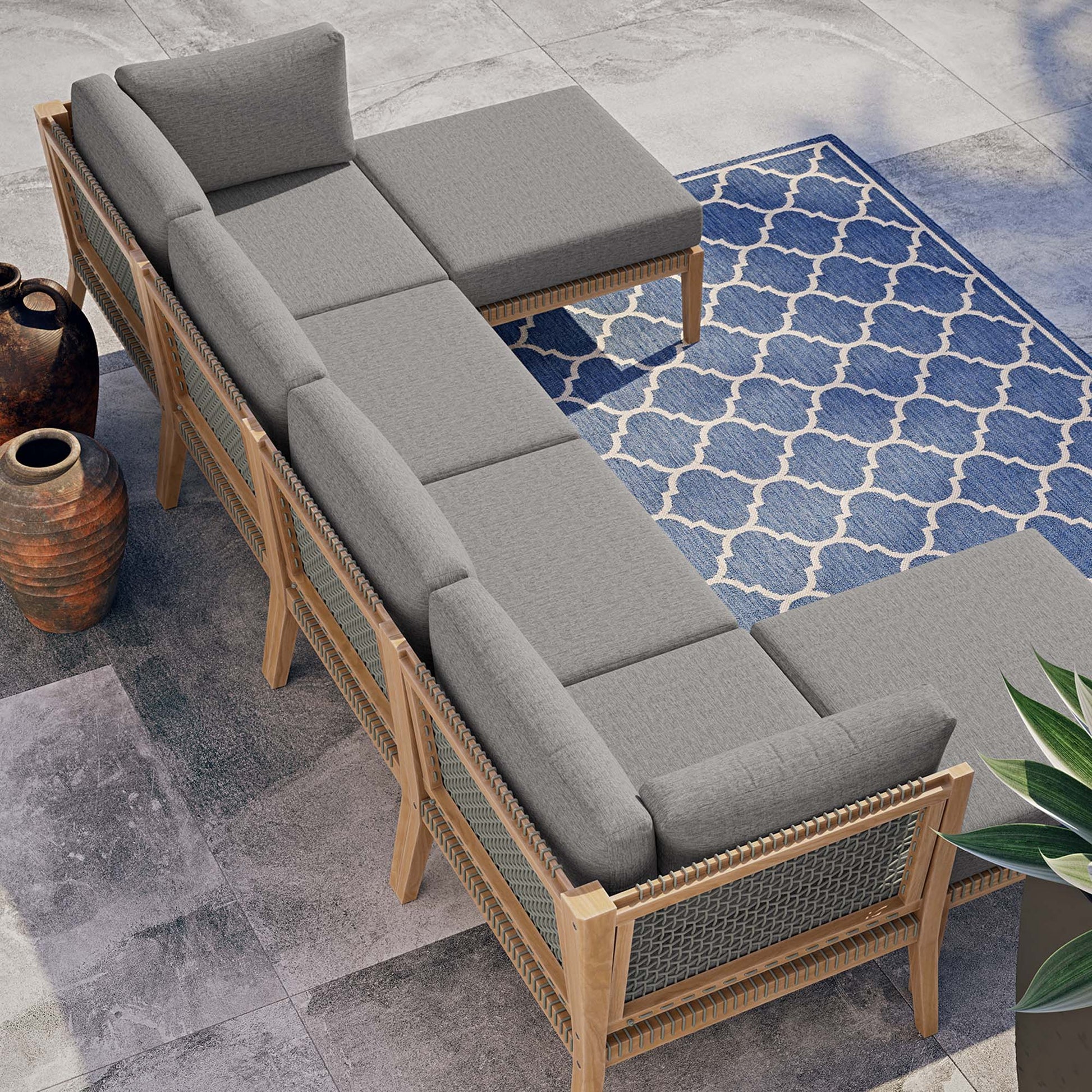 Bask in warm weather as you lounge on the Clearwater Outdoor Patio Furniture Collection. Bringing contemporary aesthetics to a backyard, porch, patio, deck, or poolside, this outdoor sectional sofa features woven rope webbing underneath the foam padded cushions that grants breezy, coastal charm. Rest and relax amidst comfortable cushions with removable all-weather covers for easy cleaning. The base of this patio set is crafted with grade A premium teak wood that boasts a beautiful, rich wood grain and is naturally weather-resistant. Includes non-marking foot glides to protect flooring. Each Seat Weight Capacity: 498 lbs.