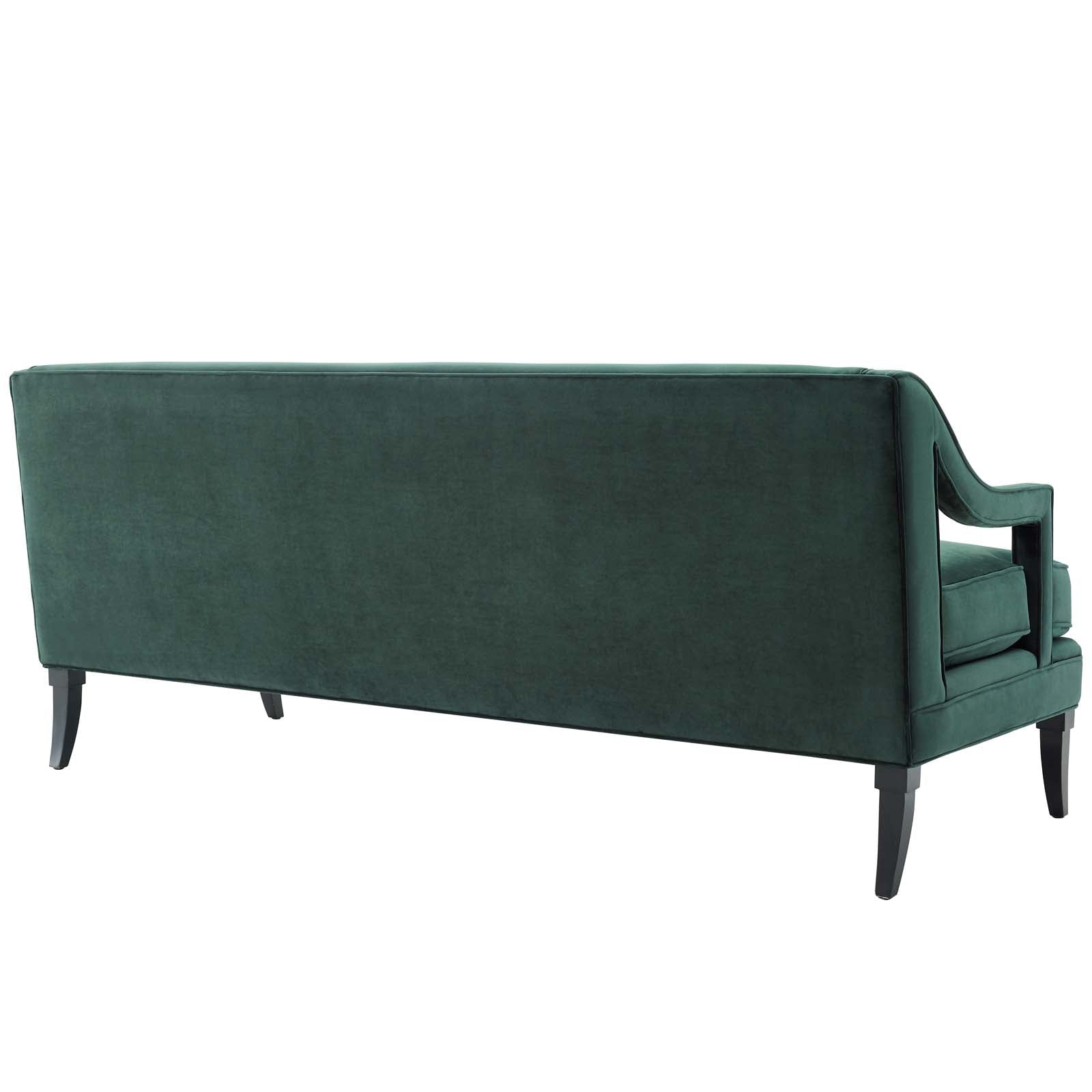 Elevate your home with the streamlined, chic cutout profile of the Concur Performance Velvet Sofa. Upholstered in soft, stain-resistant performance velvet, Concur comes with a plush 6" thick, three-seater cushion, machine washable cover, and solid birch wood saber legs with non-marking foot caps. Adorned with sloping armrests, a tailored profile, and classic button tufting, this upholstered living room sofa makes a striking statement in a variety of modern and mid-century themed decors. Sofa Weight Capacity: 1323 lbs.