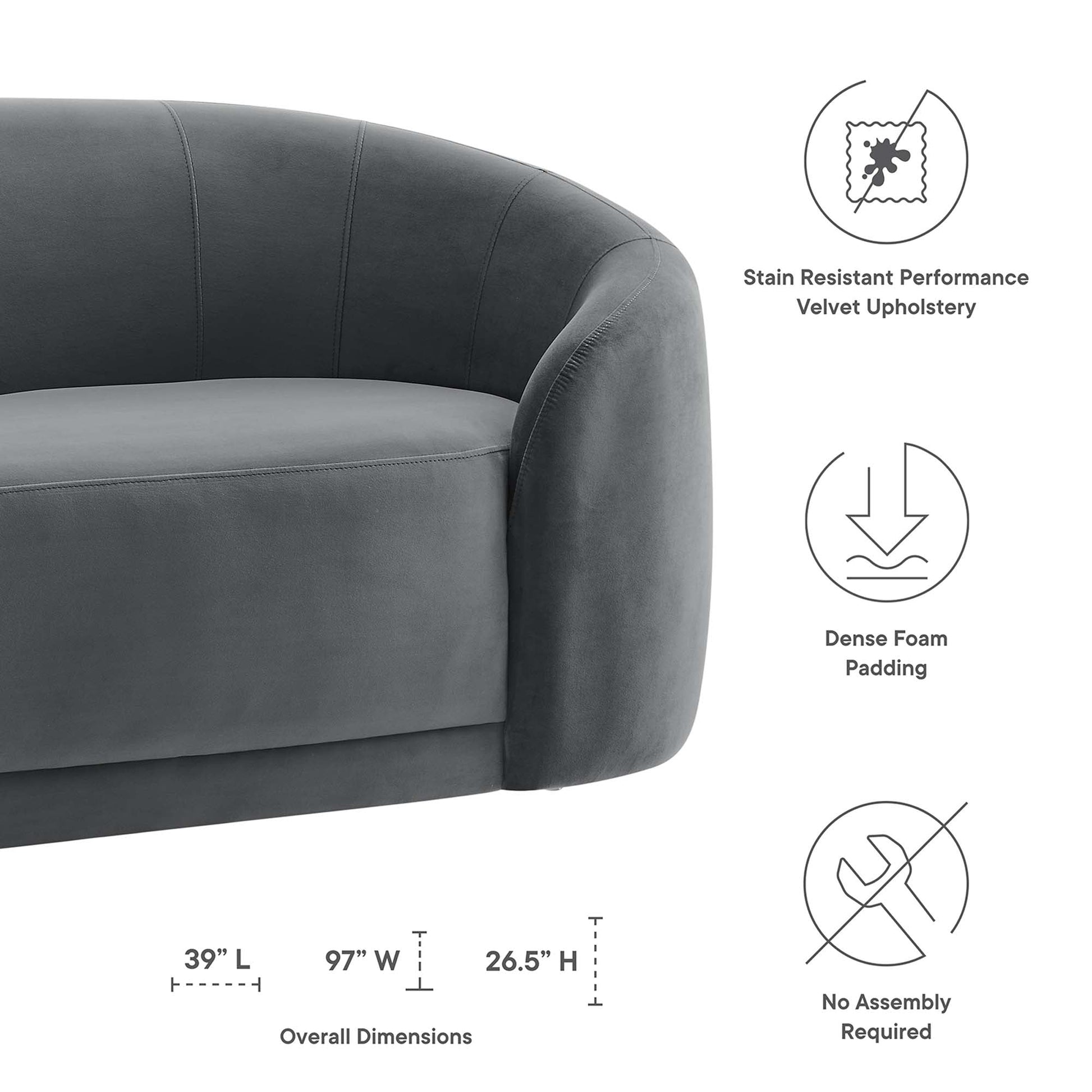 Introduce tailored excellence in your living room, bedroom, or lounge area with the Contessa Performance Velvet Sofa. The Contessa Retro Modern Sofa makes a bold statement in mid-century modern, eclectic, or contemporary decors. This upholstered couch is padded with dense foam for maximum comfort and equipped with a webbed support system for durability. Contessa features stain-resistant performance velvet, a solid wood and plywood frame, and non-marking foot glides. Chair Weight Capacity: 993 lbs.