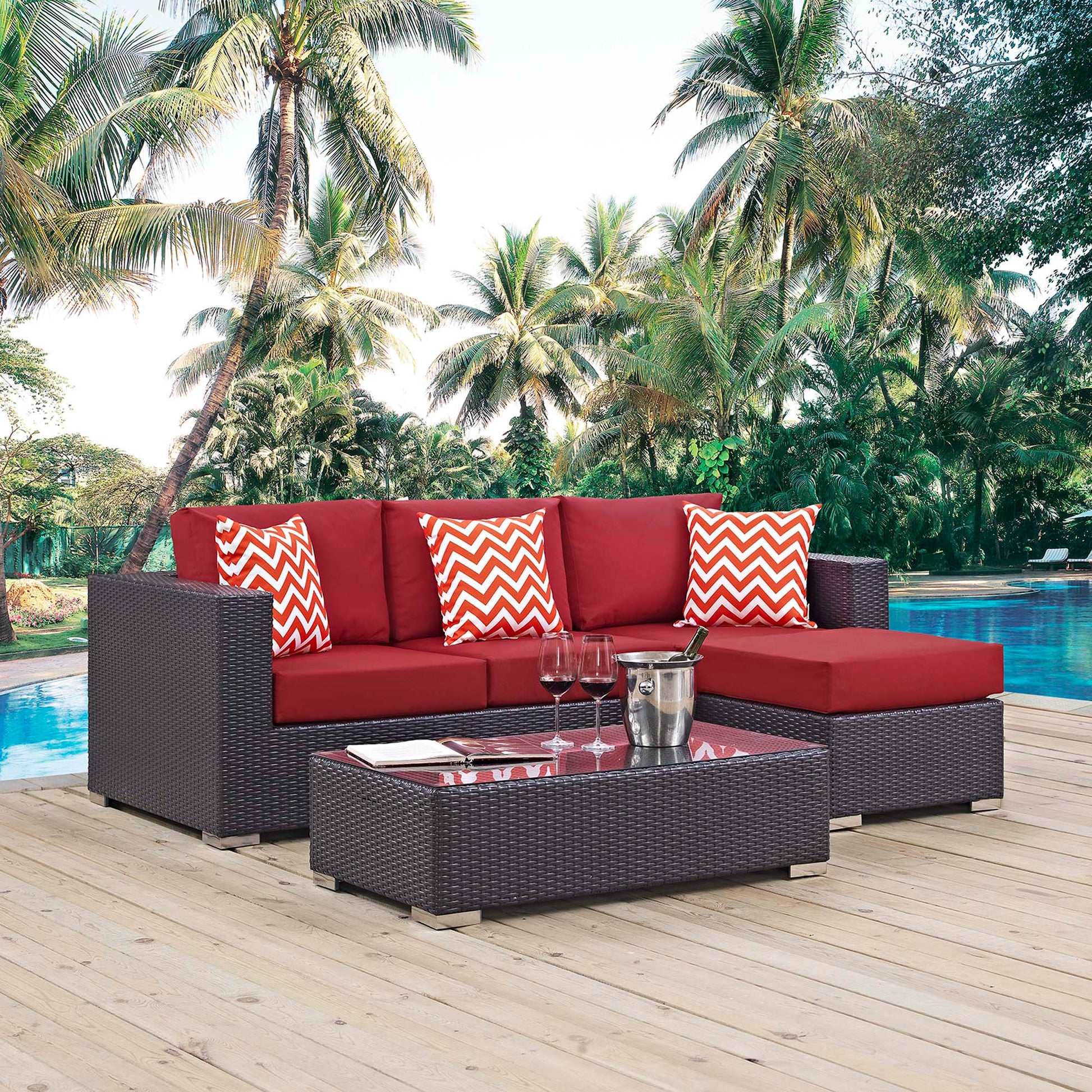 Gather stages of sensitivity with the Convene outdoor sectional series. Made with a synthetic rattan weave and a powder-coated aluminum frame, Convene is a versatile outdoor collection that shifts and combines according to the spontaneous needs of the moment. Outfitted with all-weather fabric cushions, leave a positive impression on friends and family while enhancing your patio, backyard or poolside repast in this series of palpable distinction. This installment of the series is an Outdoor Patio Sofa Set.