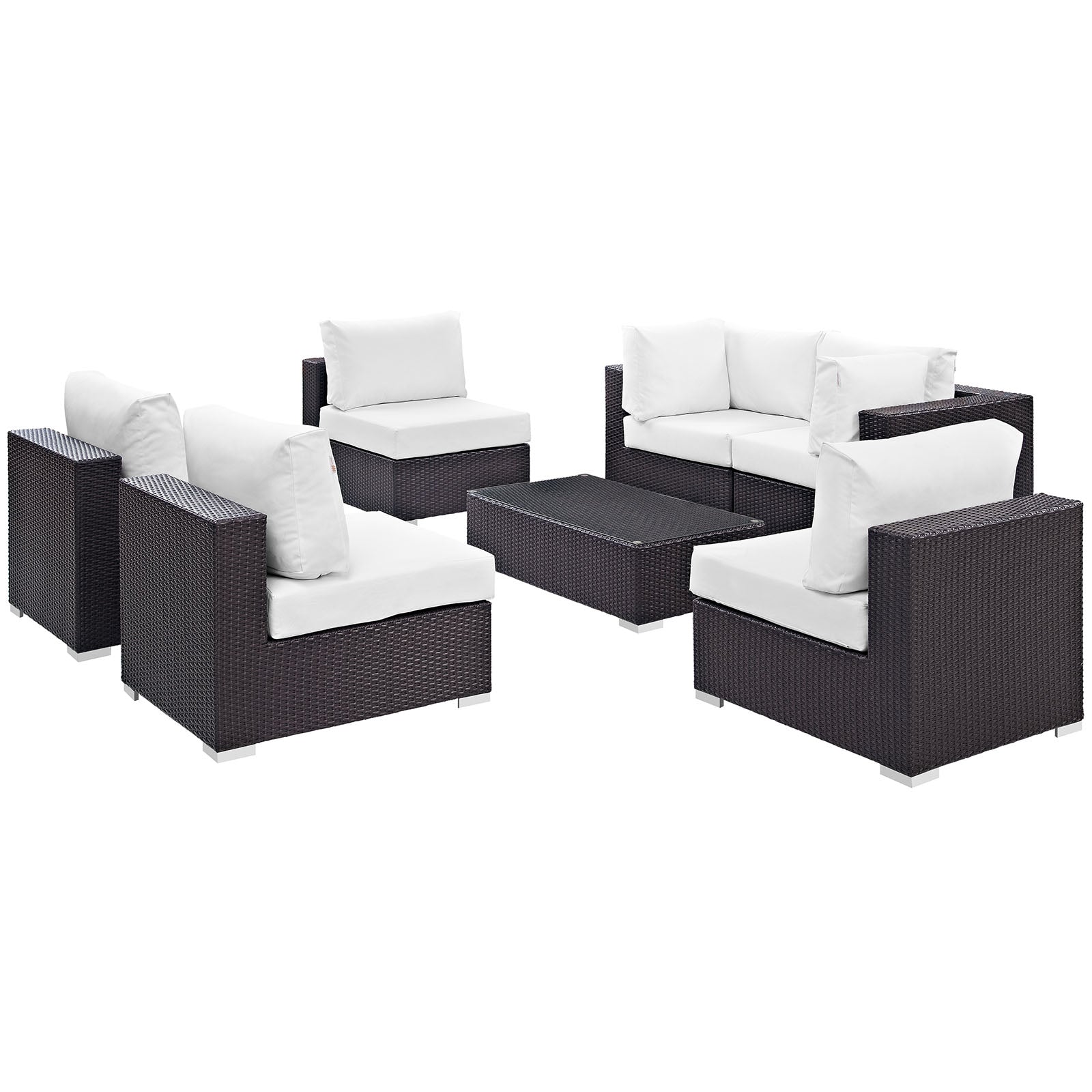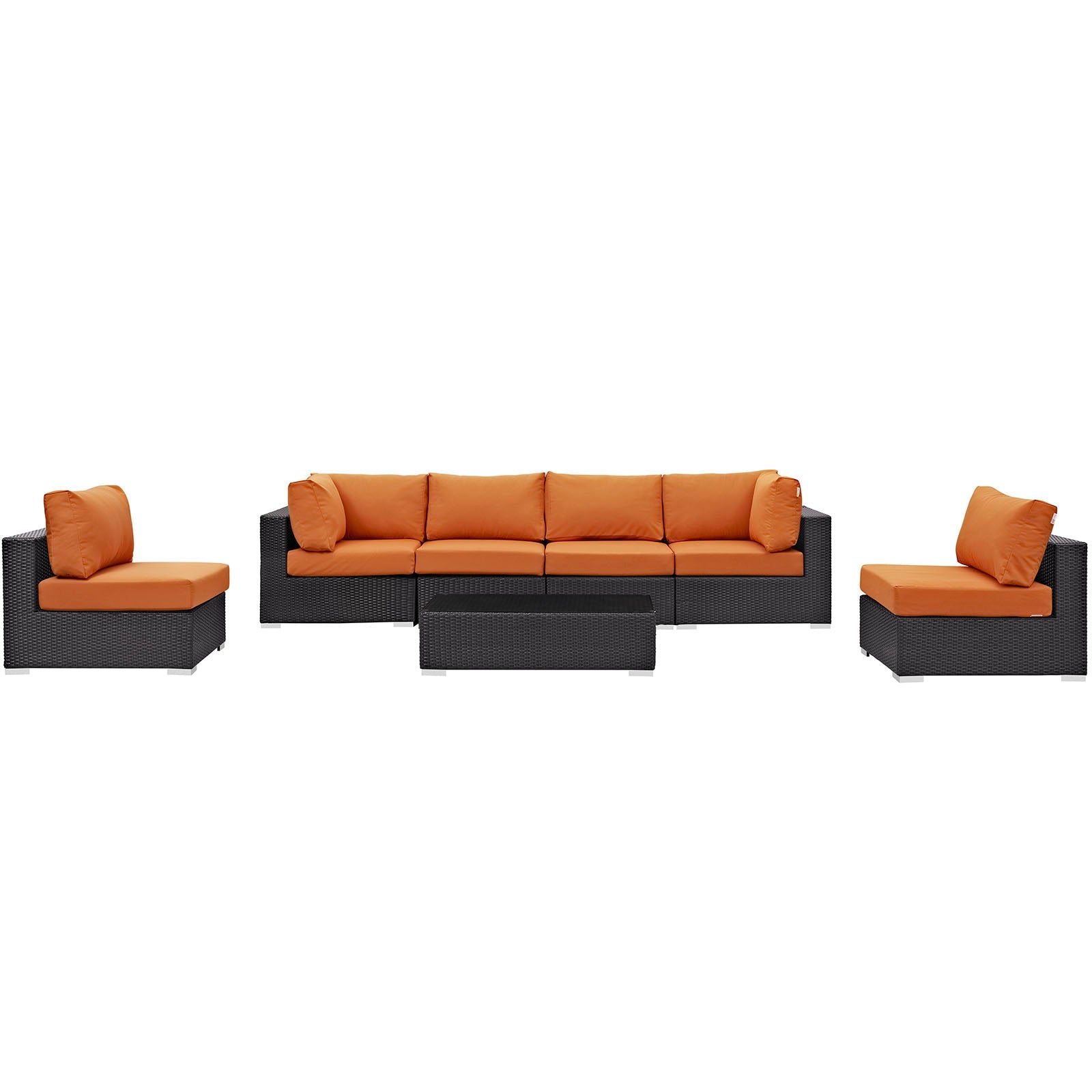 Gather stages of sensitivity with the Convene Outdoor Sectional series. Made with a synthetic rattan weave and a powder-coated aluminum frame, Convene is a versatile outdoor furniture set that shifts and combines according to the spontaneous needs of the moment. Outfitted with all-weather fabric cushions, leave a positive impression on friends and family while enhancing your patio, backyard, or poolside repast in this series of palpable distinction. This installment of the series is an Outdoor Patio Sectional Set.