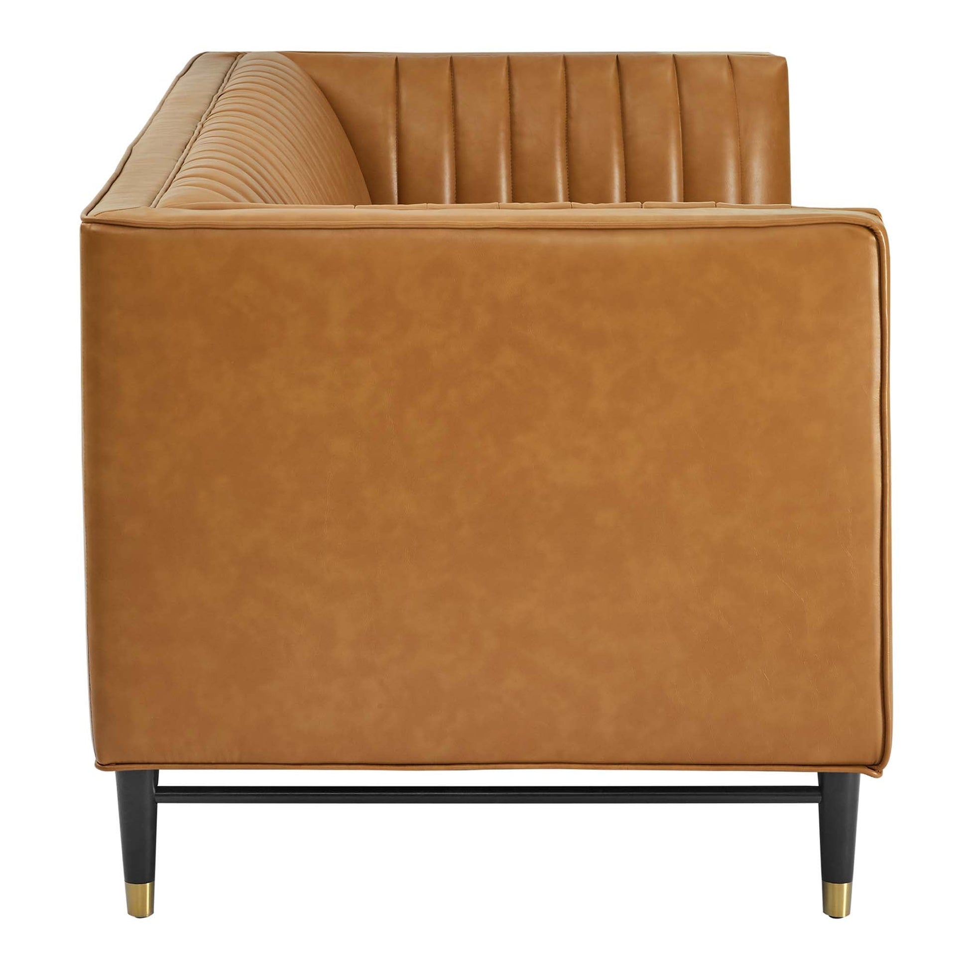 Introduce the flowing lines of the Devote Channel Tufted Vegan Leather Loveseat to your living room, bedroom, or office decor. Putting a retro twist on classic tufting, this loveseat is enriched with vertical channel tufting that adds visual depth and glam deco style to any space. This two-seater sofa is upholstered in vegan leather and padded in dense foam for a premium seating experience. Durably crafted, this loveseat rests atop black rubberwood legs with gold stainless steel sleeves that add subtle interest. Includes non-marking foot caps. Assembly required. Loveseat Weight Capacity: 881 lbs.